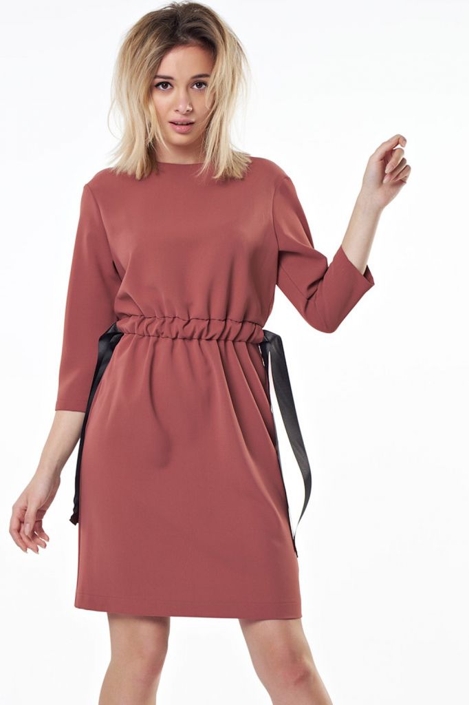 • Особенности: Платье полуприлегающего силуэта из костюмной ткани. Детали: слегка спущенная линия плеча, по линии талии выполнена кулиска с декоративной широкой лентой, внутри кулиски настрочена резина. Застежка по спинке на молнию.