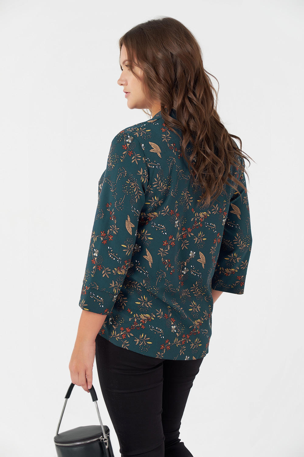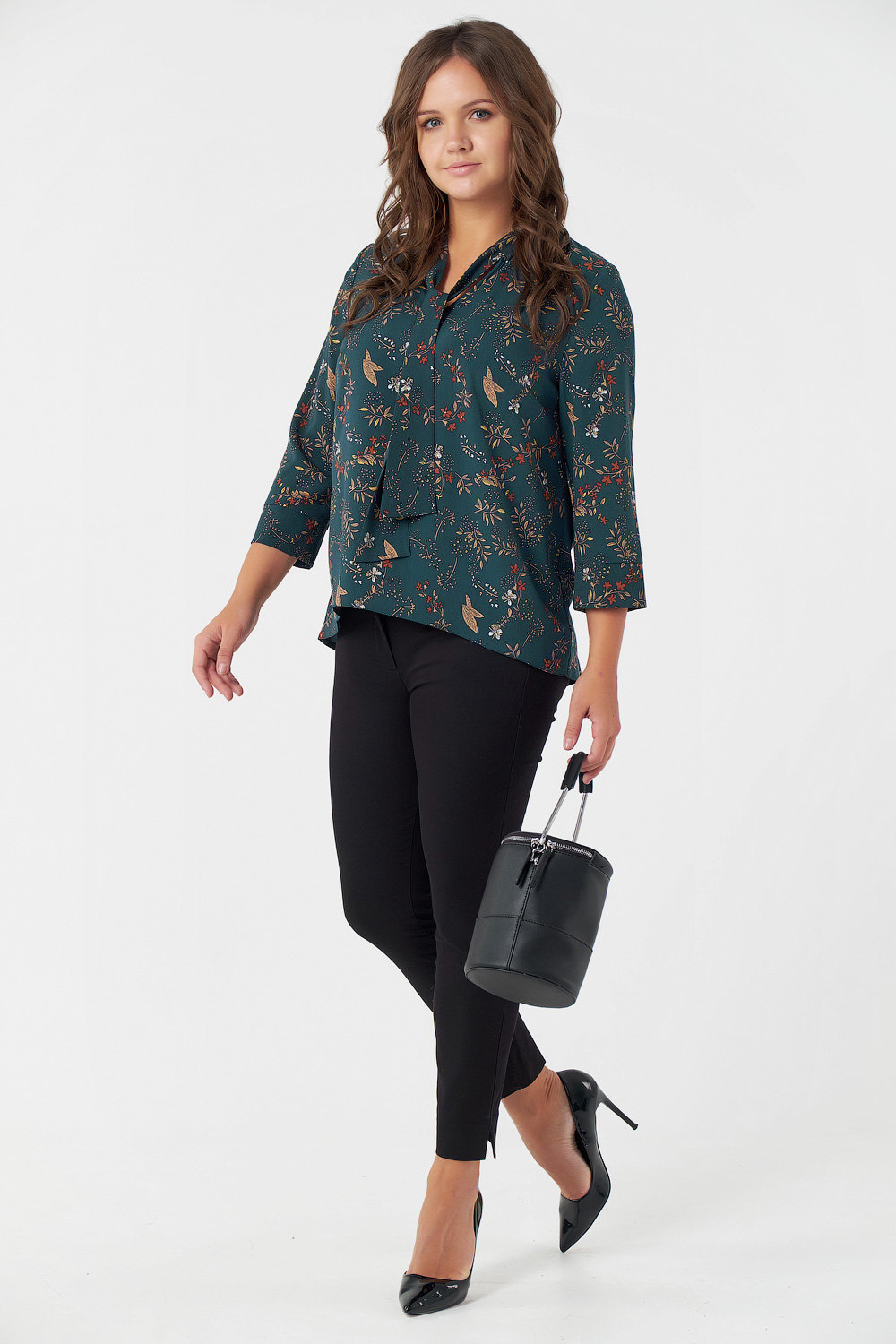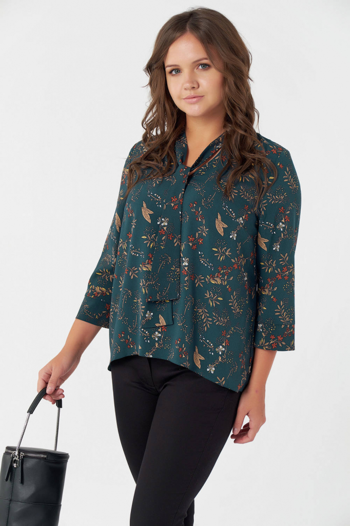 • Особенности: Блуза прямого силуэта с завязками оп горловине. Детали: V-образный вырез горловины, завязки, вытачки, втачной рукав длиной 3/4, с отрезной манжетой по низу. Низ изделия асимметричный, перед изделия укорочен, спинка с удлинением.