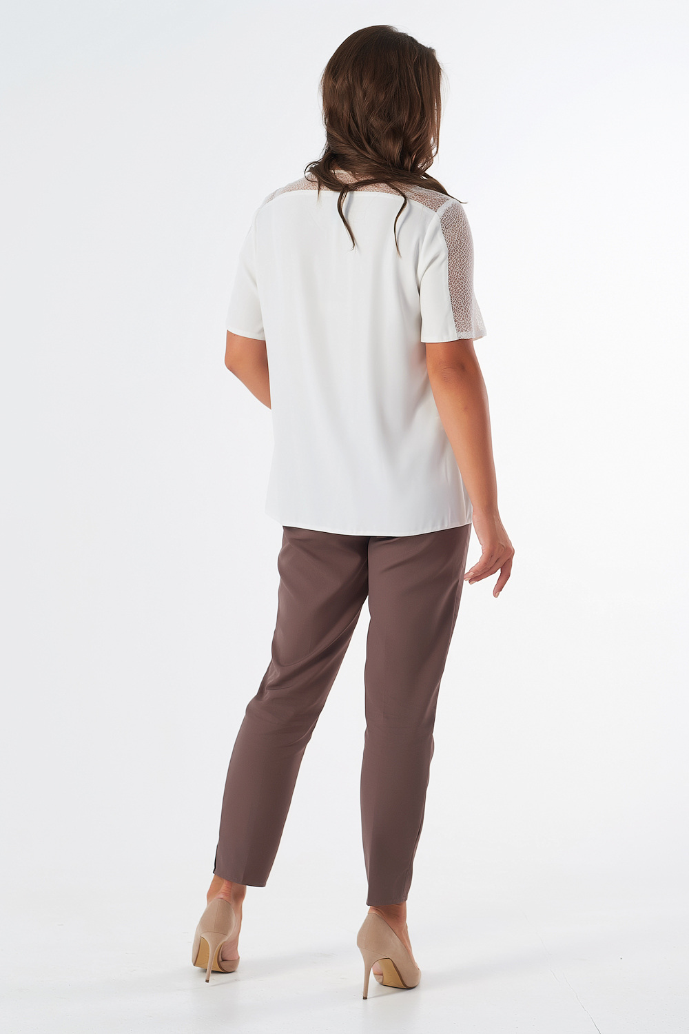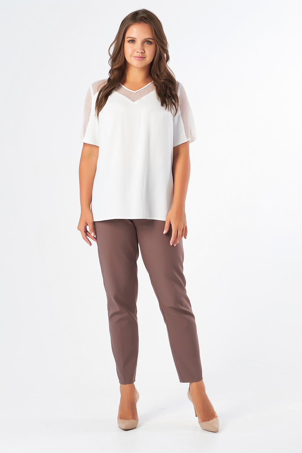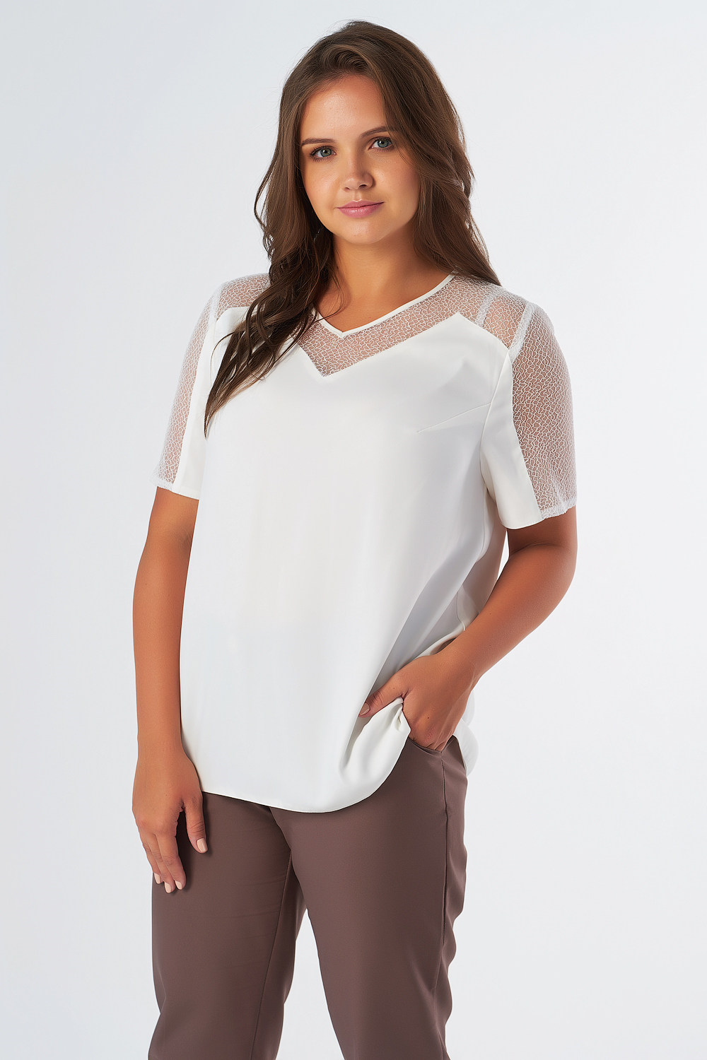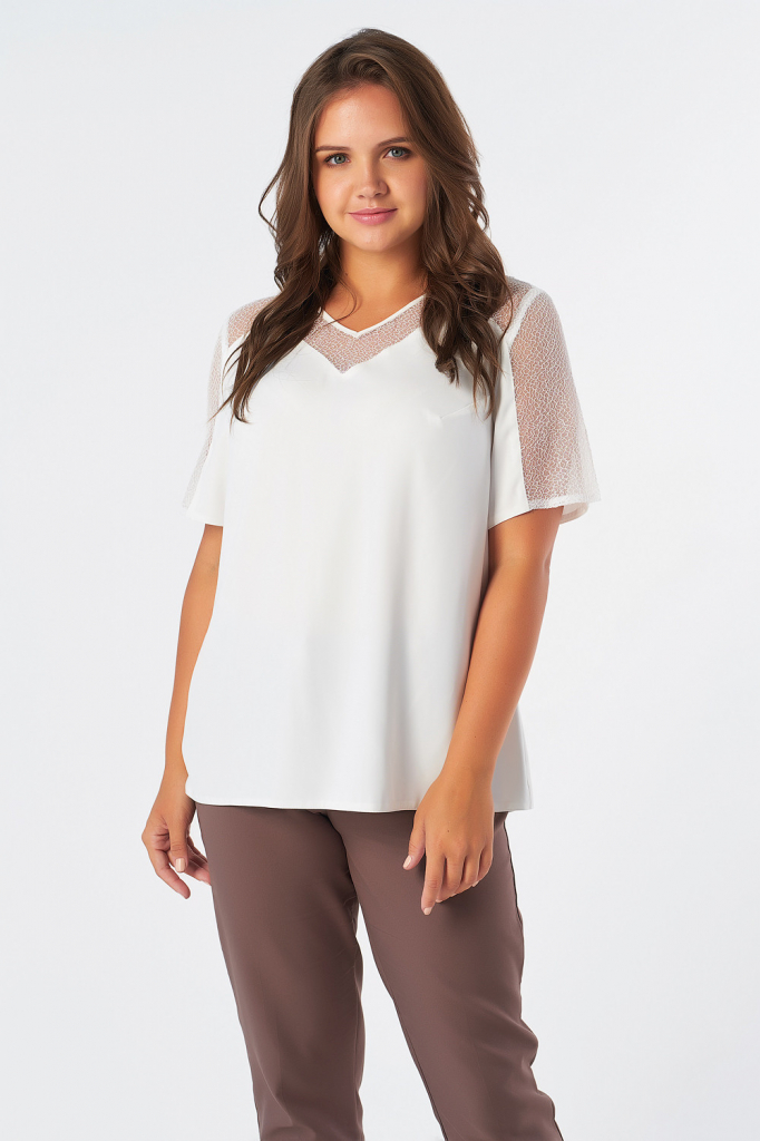 • Особенности: Блуза прямого силуэта с втачным рукавом и V-образным вырезом горловины. Детали: фигурные кружевные кокетки по переду и спинке, членение с кружевом по рукаву, нагрудные вытачки.