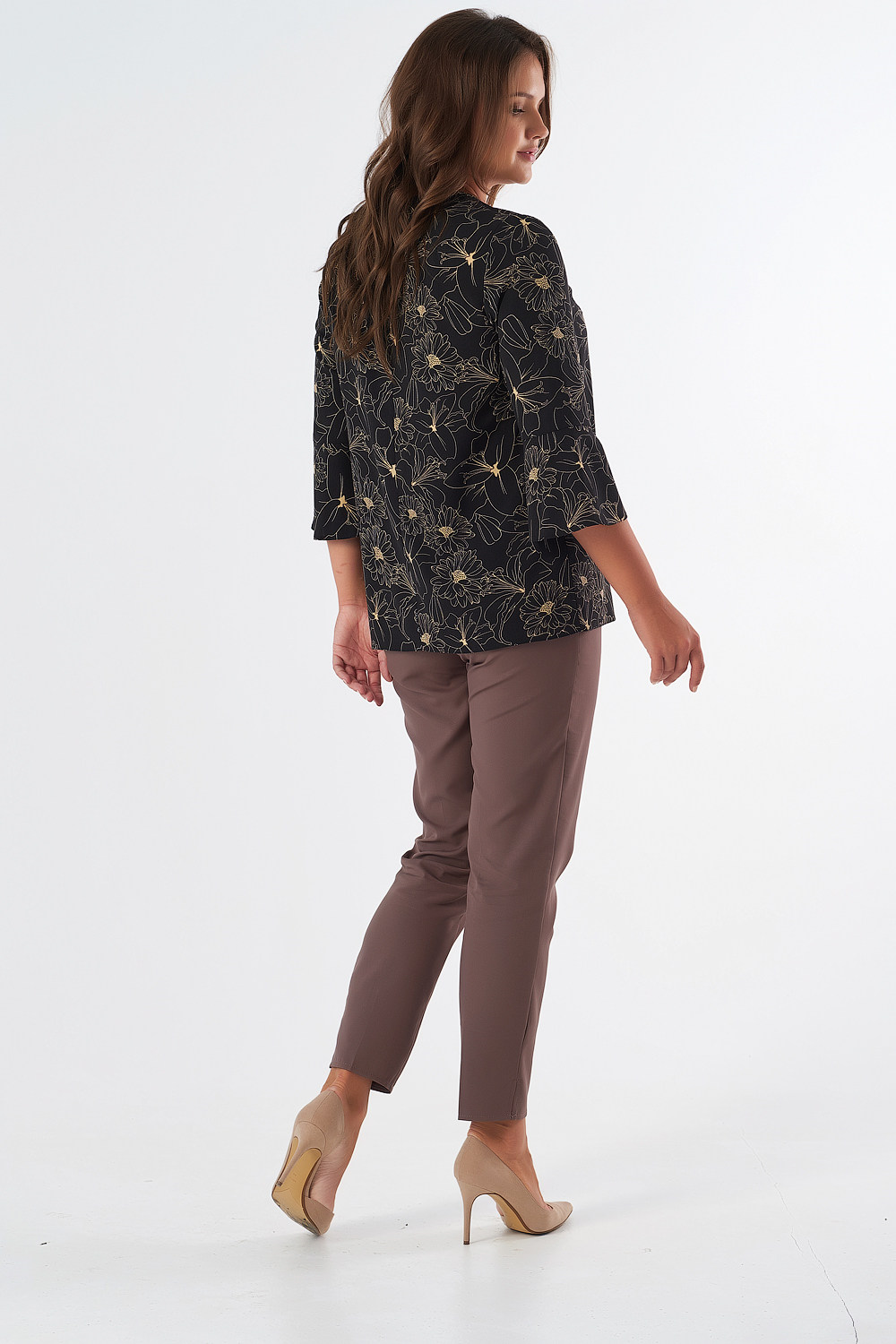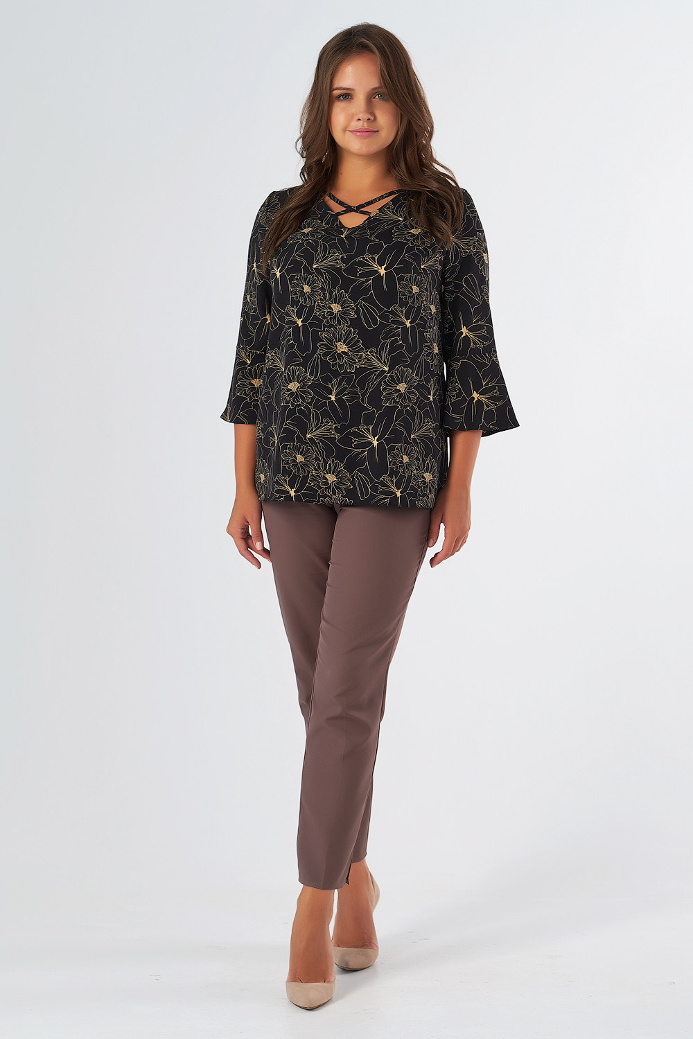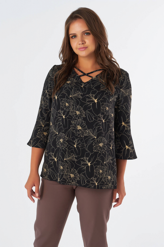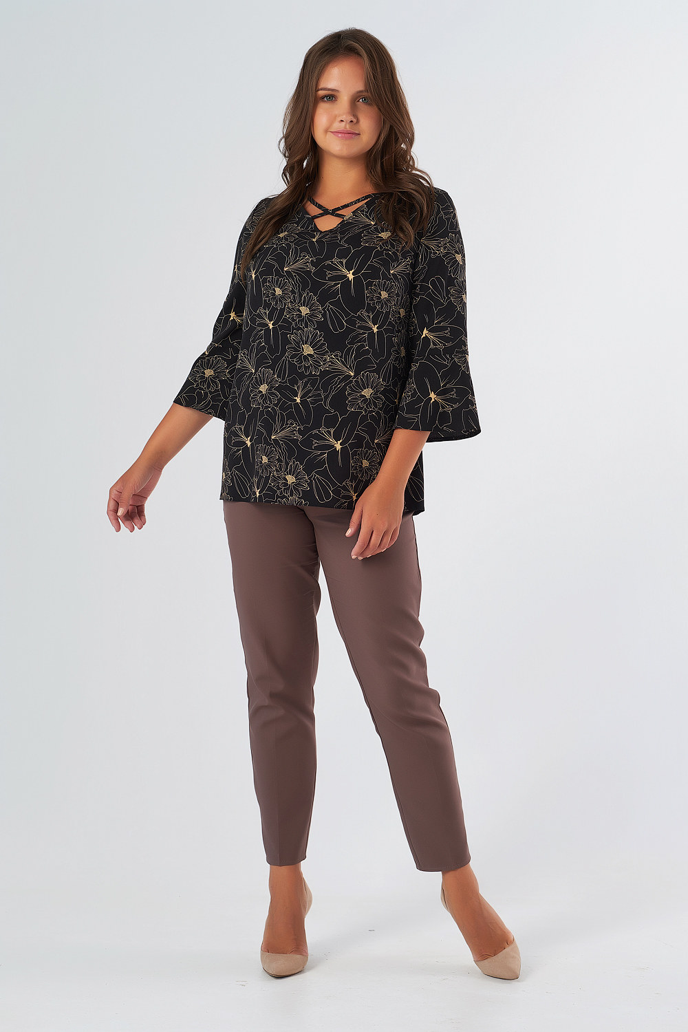 • Особенности: Блуза прямого силуэта с декоративными перекрестными лентами по вырезу горловины. Рукав втачной, длиной 3/4, с отрезным слегка расклешенным воланом. Изделие без застежки.