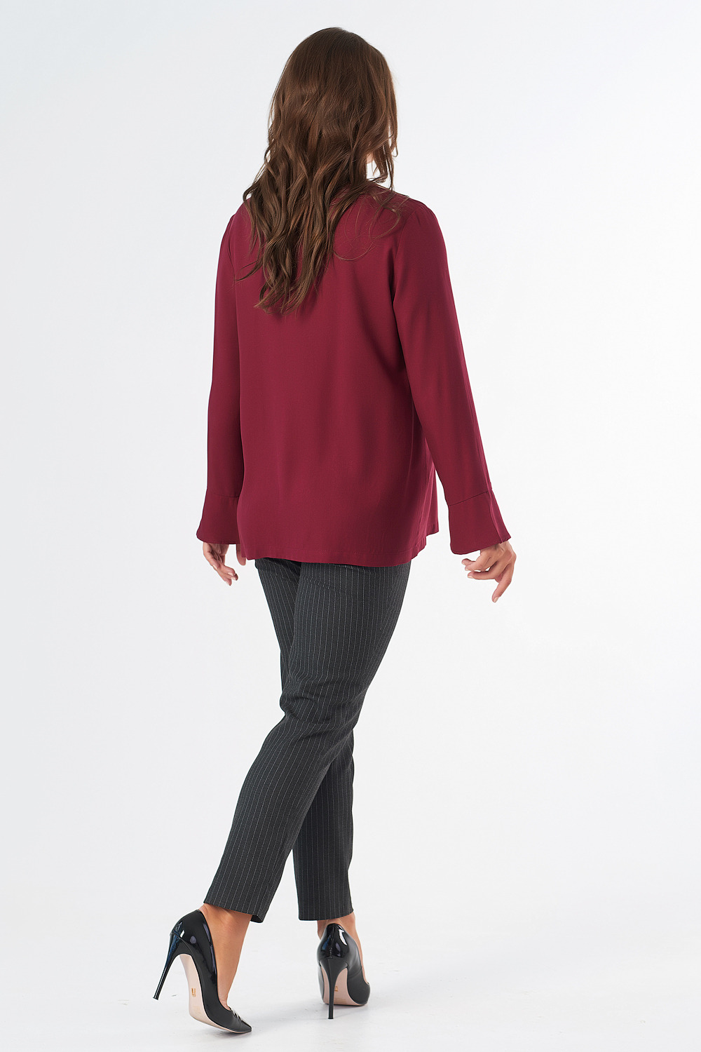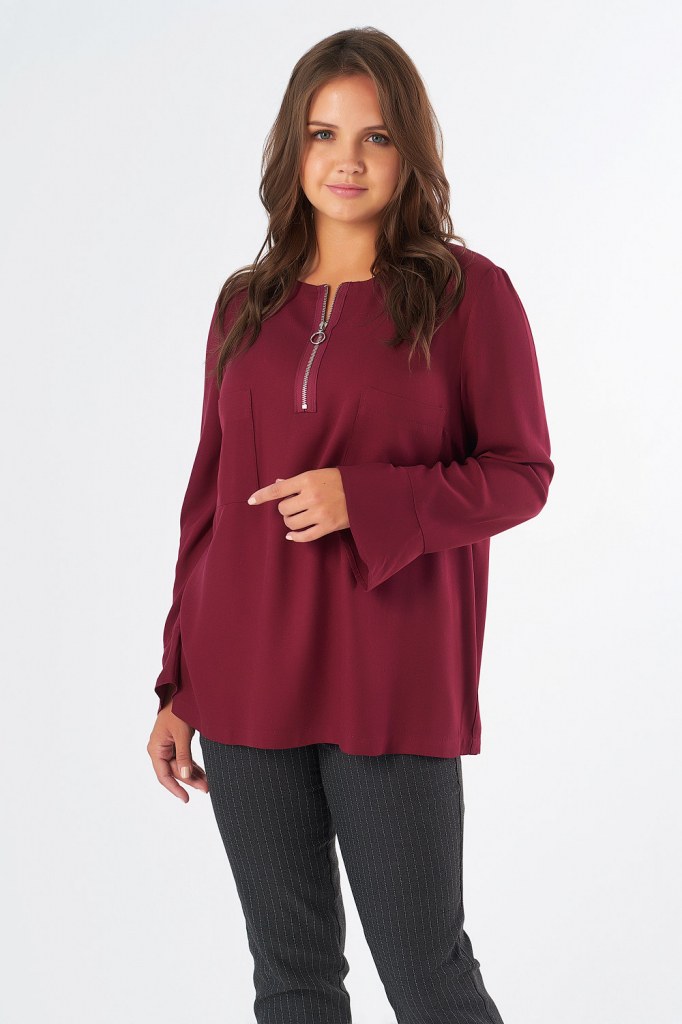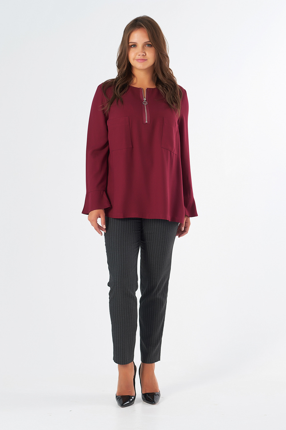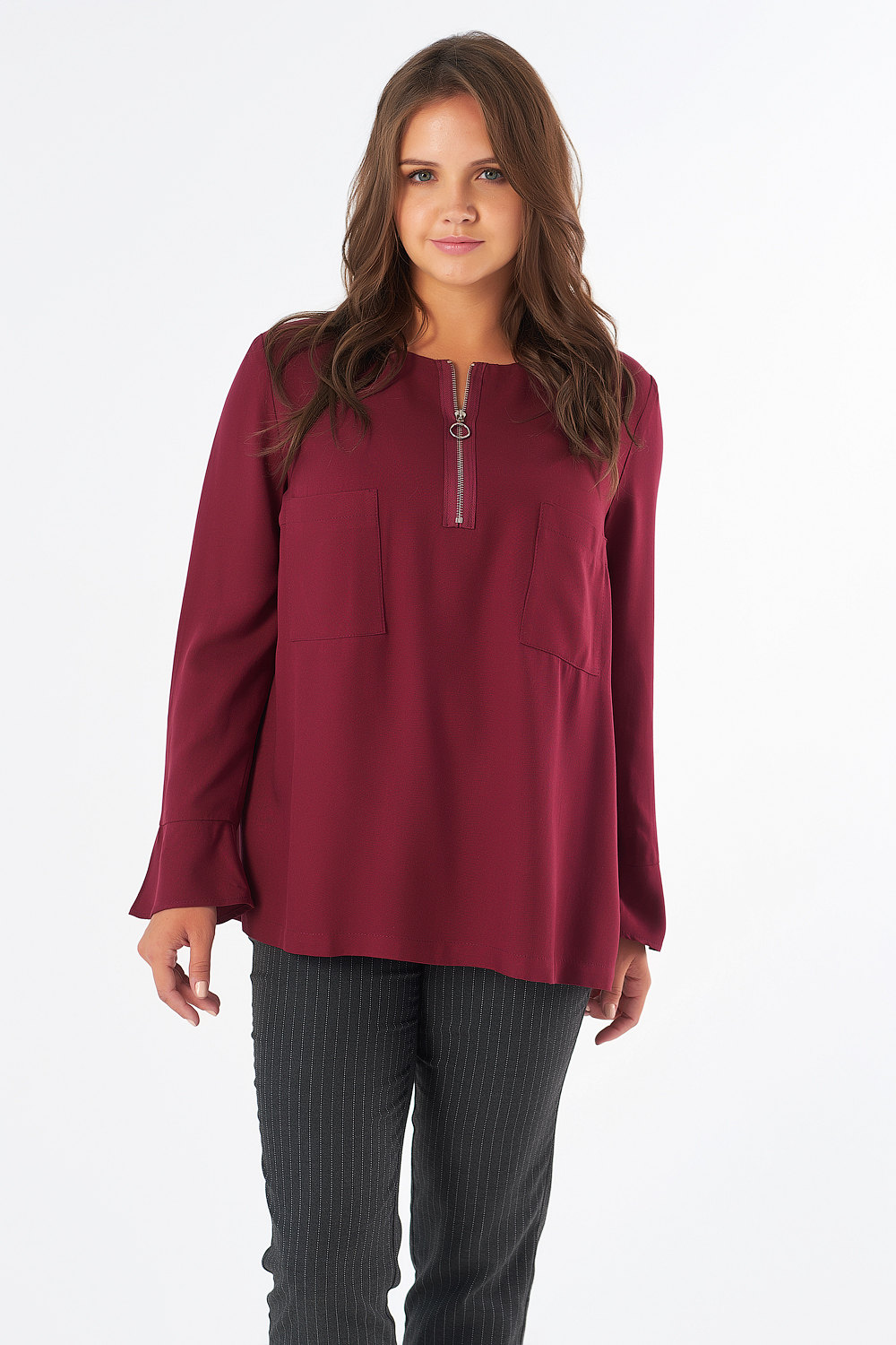 • Особенности: Блуза прямого силуэта с втачным рукавом. Детали: горловина округлой формы, накладная металлическая молния, накладные карманы. Рукав втачной с отрезным слегка расклешенным воланом по низу.