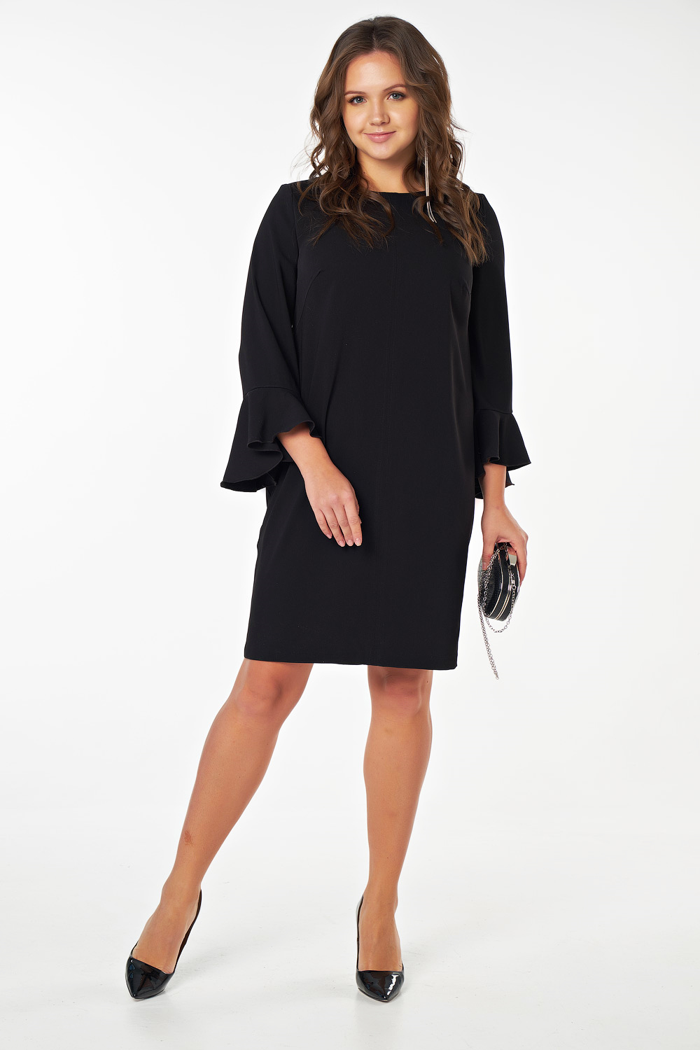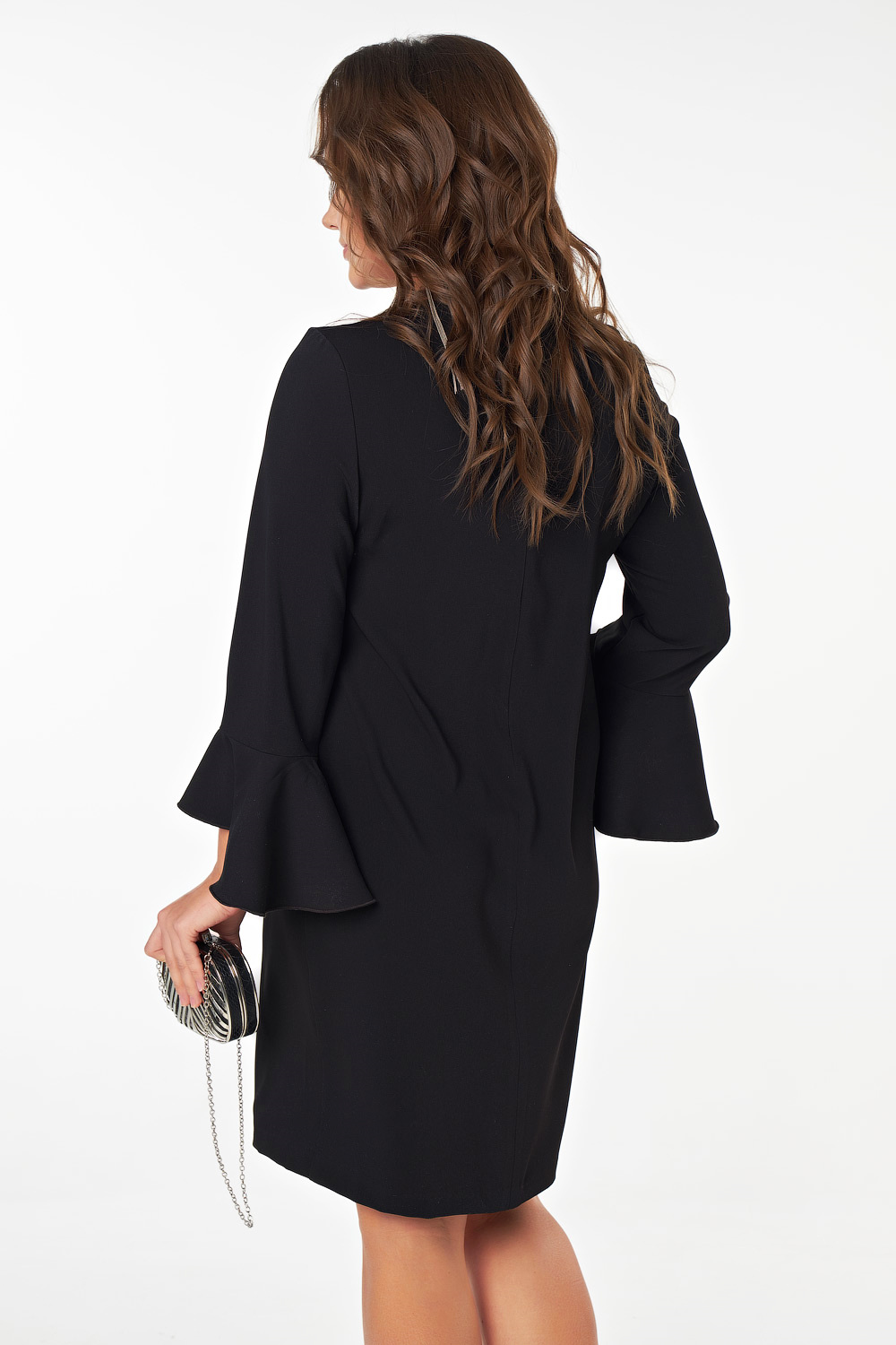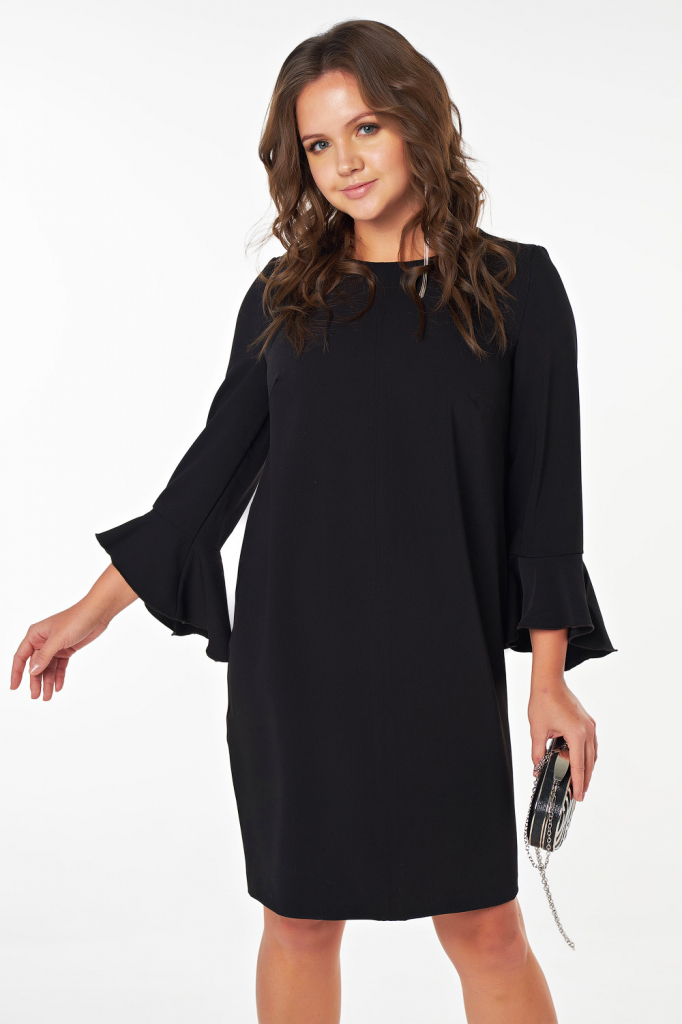 • Особенности: Платье из плотной плательной ткани с декоративными воланами по рукавам. Детали: горловина округлой формы с отстрочкой, вертикальное членение по переду, вытачки, застежка по спинке на потайную молнию. Рукав 3/4 с притачным асимметричным воланом по низу.