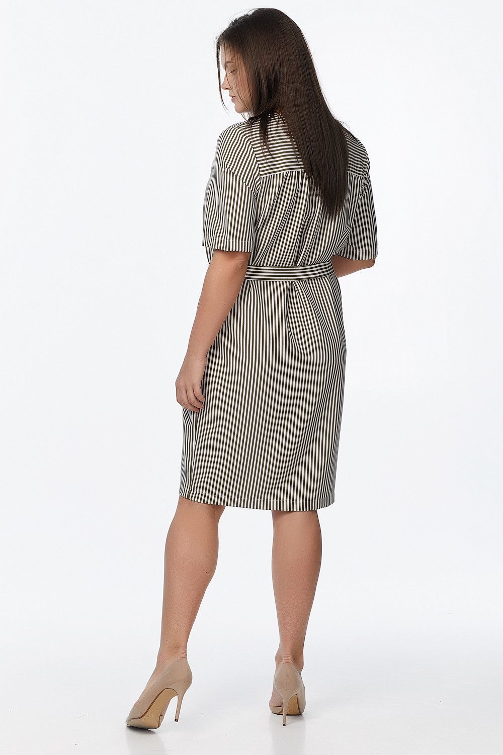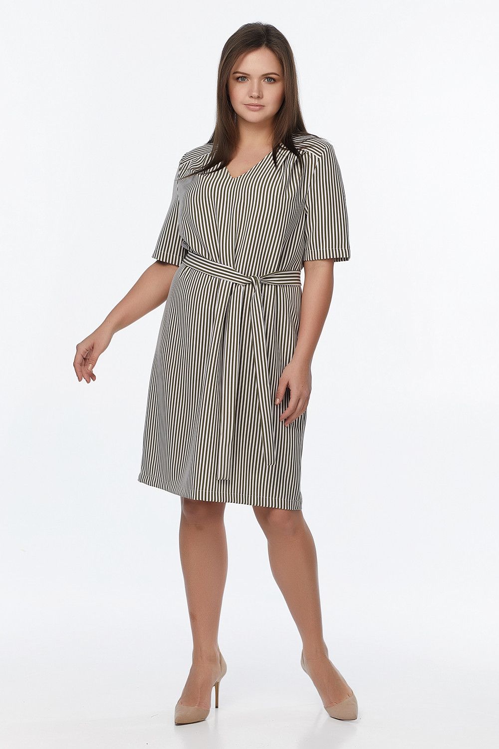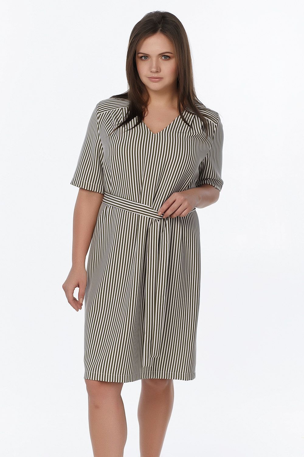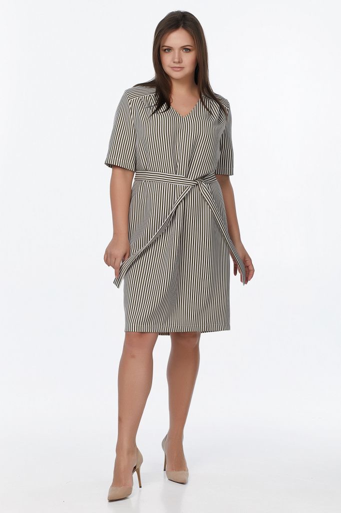 • Особенности: Платье прямого силуэта из плательной мягкой креповой ткани. Детали: кокетка по плечам и спинке, V-образный вырез горловины, втачной рукав, в комплекте пояс.