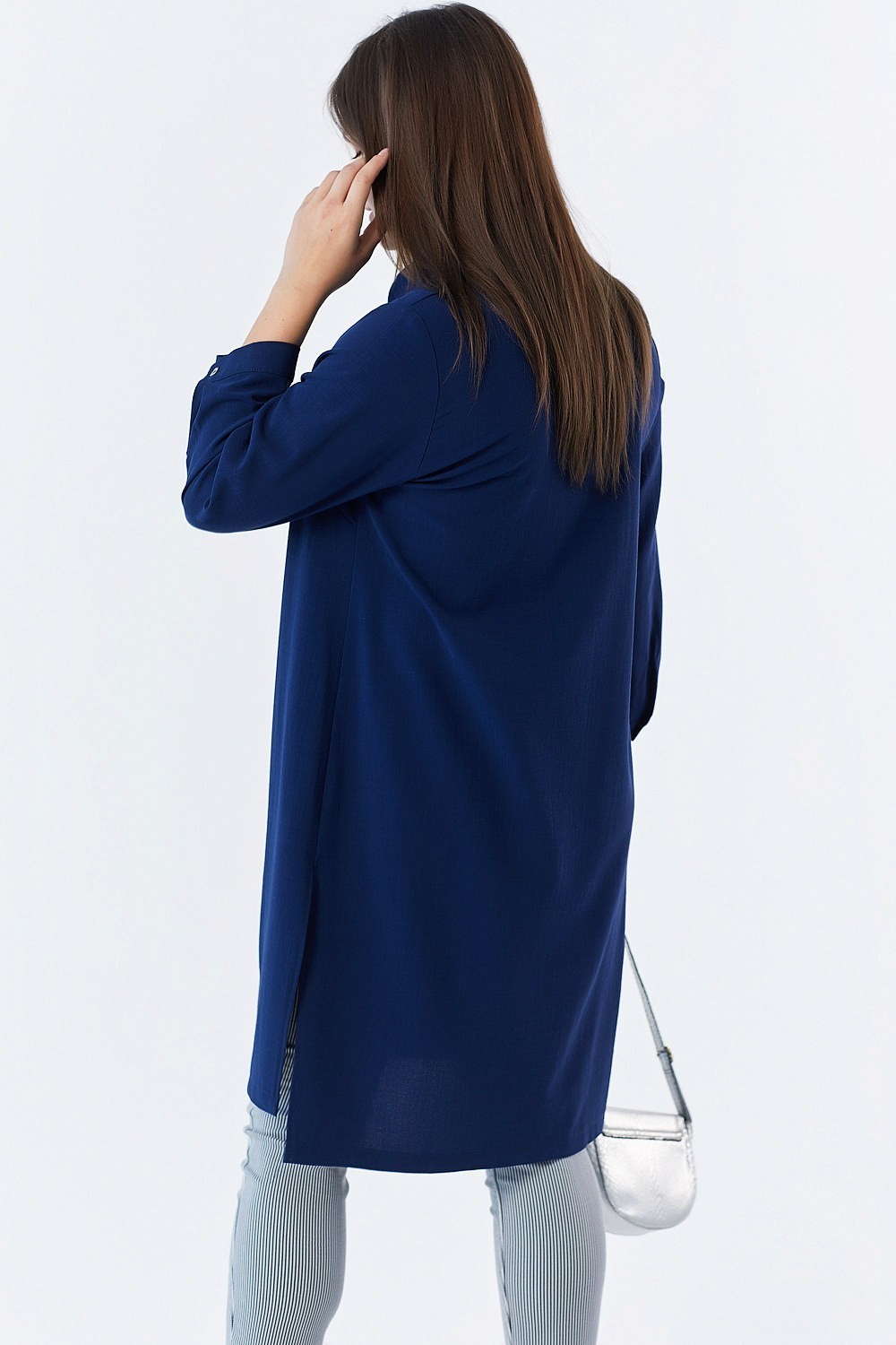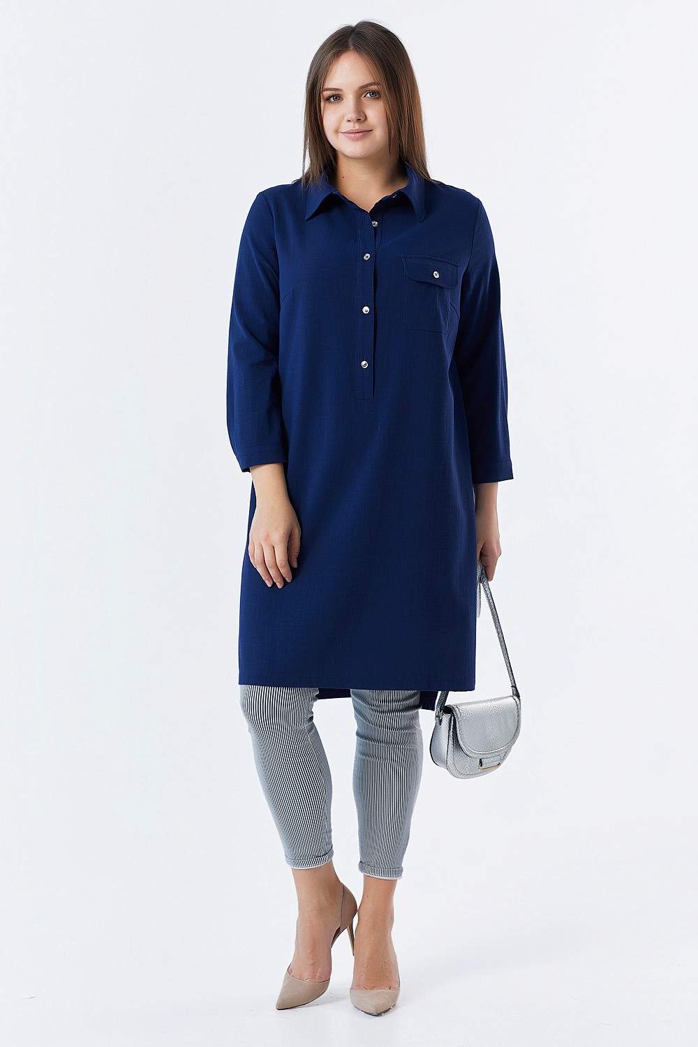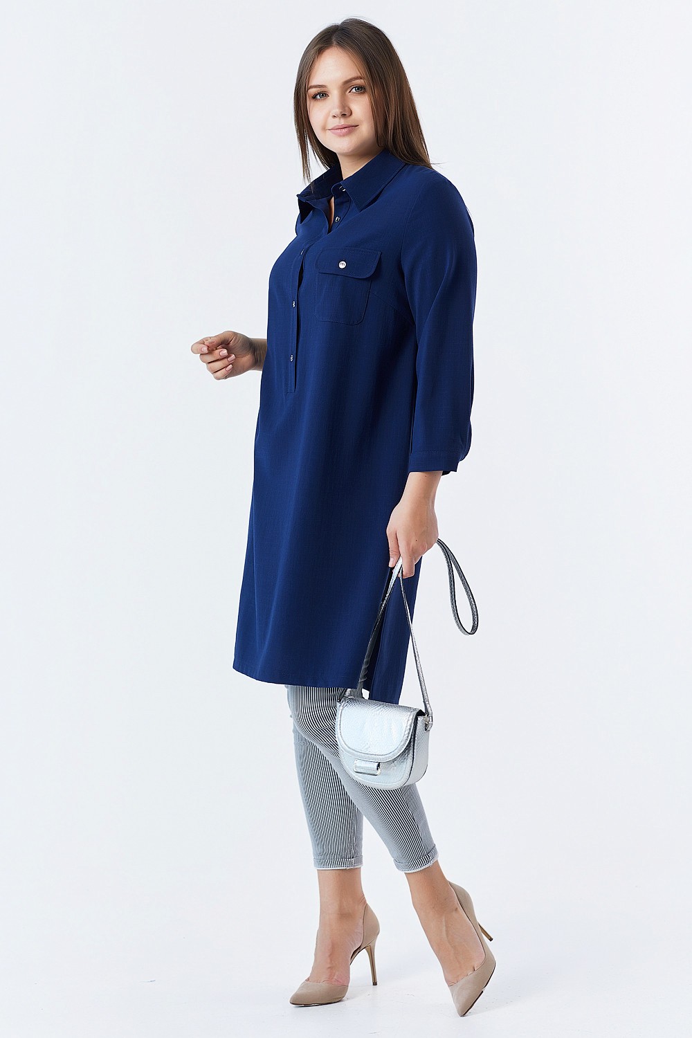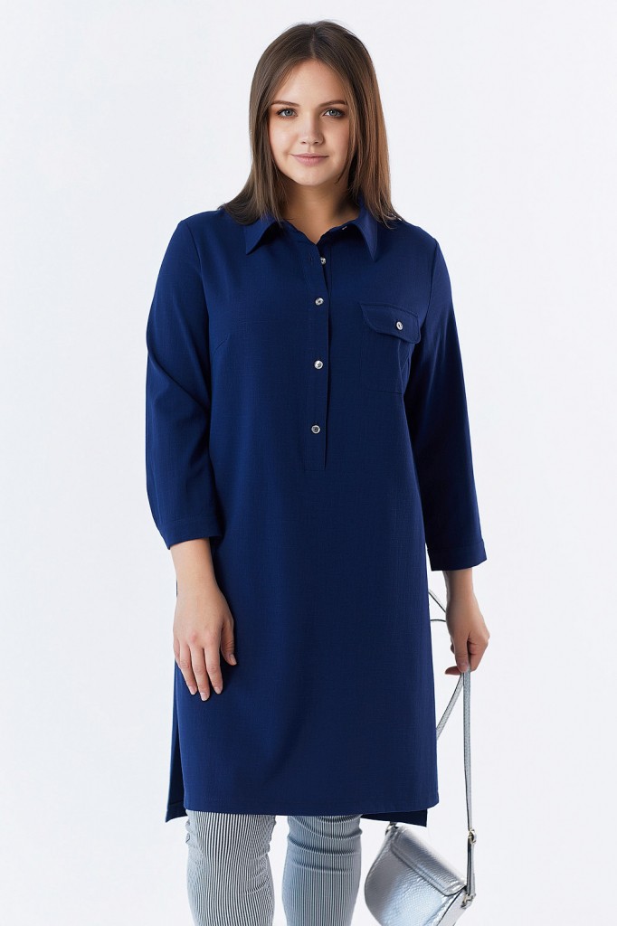 • Особенности: Туника прямого силуэта из костюмной ткани. Детали: планка по переду, отложной воротник на стойке, рукав длиной 7/8, притачная манжета застегивающаяся на пуговицу, накладной карман с клапаном, высокие разрезы в боковых швах, перепад длины переда и спинки 5 см. Застежка по переду на пуговицы.