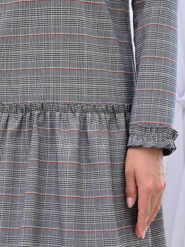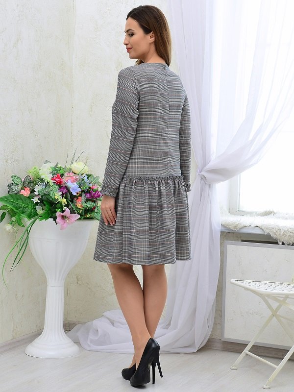 Платье из костюмной ткани прямого кроя с воланом легкой волнистости понизу. Длинные рукава, украшенные небольшой рюшей.