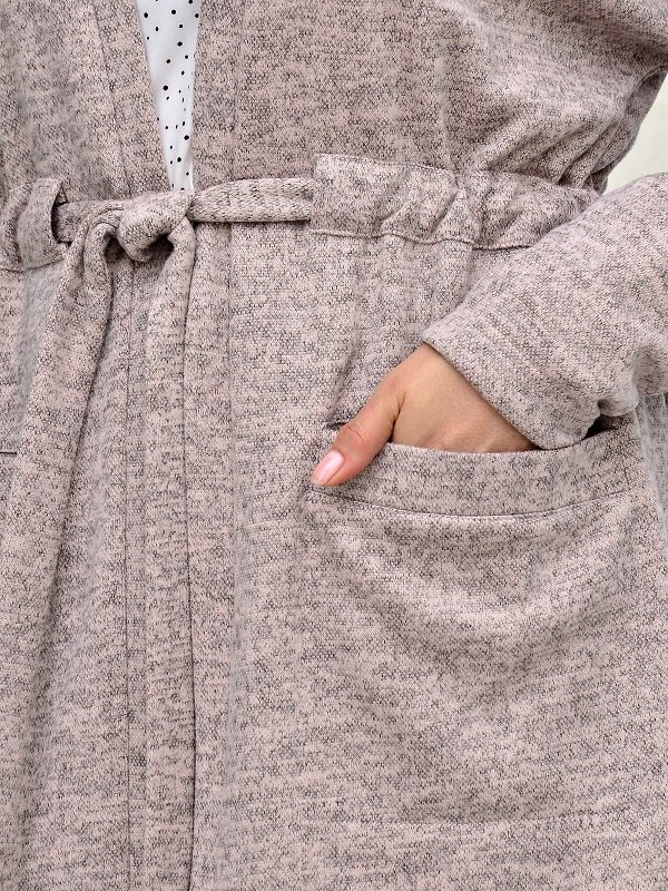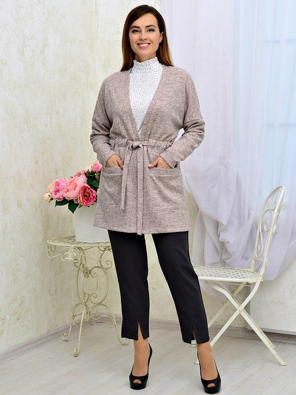 Стильный трикотажный кардиган из трикотажа без пуговиц на кулиске с пояском.