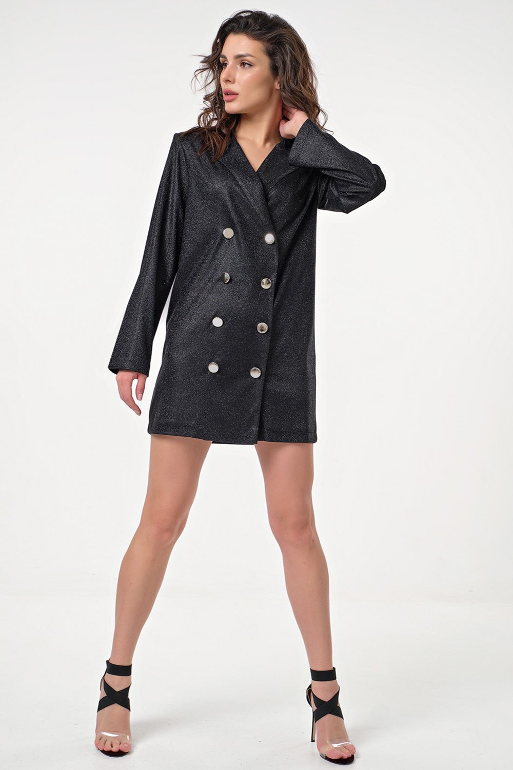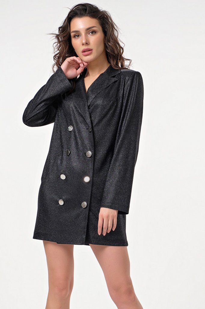 • Особенности: Платье-жакет прямого силуэта из трикотажа без подкладки. Детали: двубортная застежка на декоративные пуговицы, отложной пиджачный воротник.