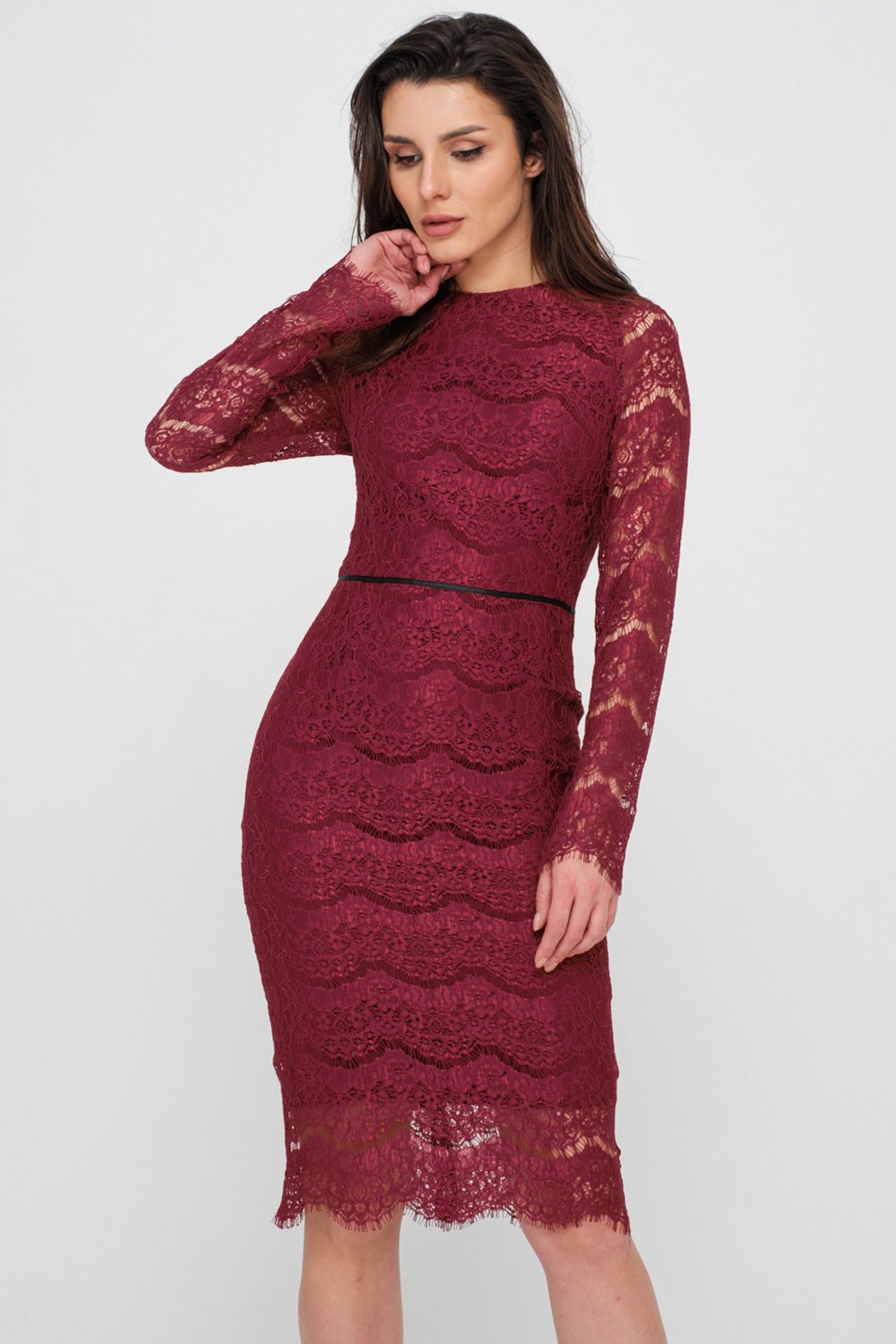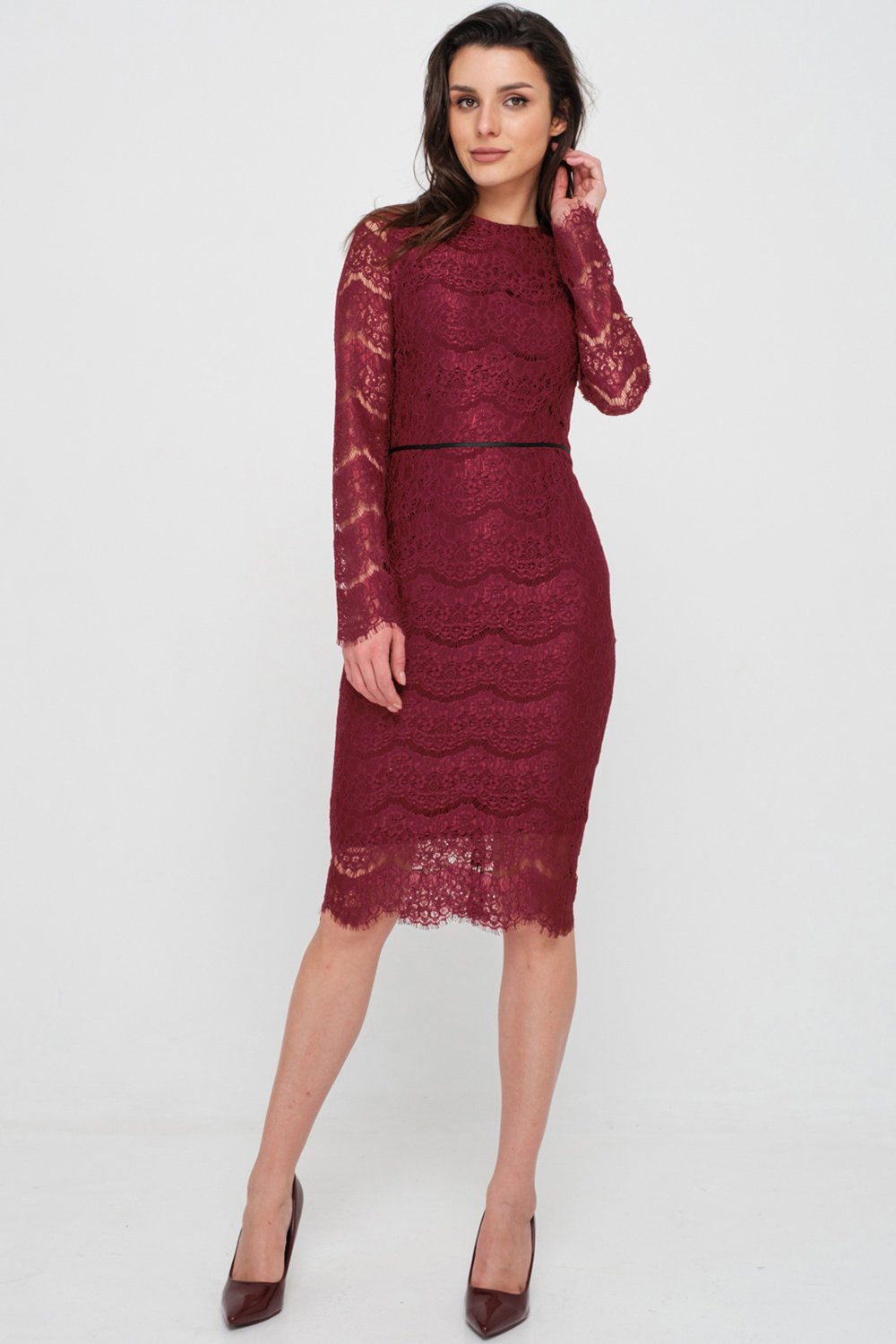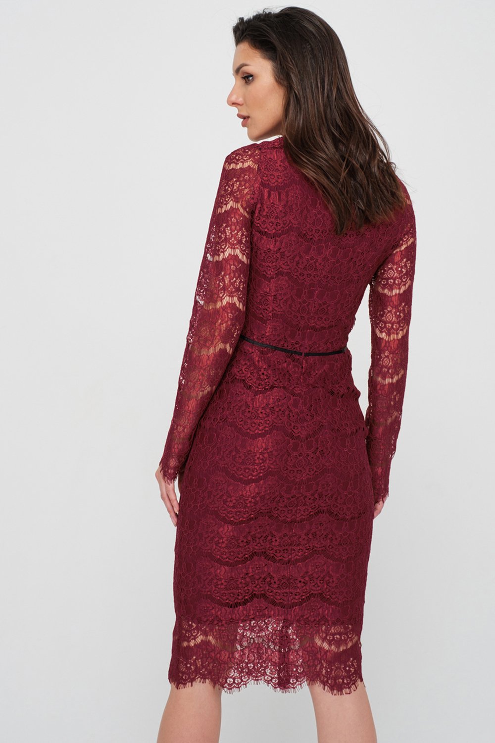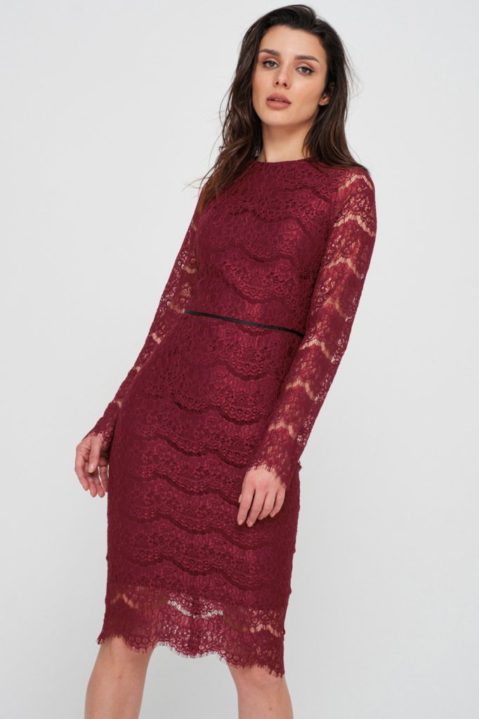 • Особенности: Платье прилегающего силуэта из кружева. Горловина округлой формы, рукав длинный втачной, нагрудные вытачки, по талии настрочена декоративная тесьма. По спинке - потайная застежка-молния. Изделия на подкладке. Внимание: изделие имеет минимальные прибавки на облегание. Если ваши мерки находятся между двумя размерами, то рекомендуем выбрать больший размер.