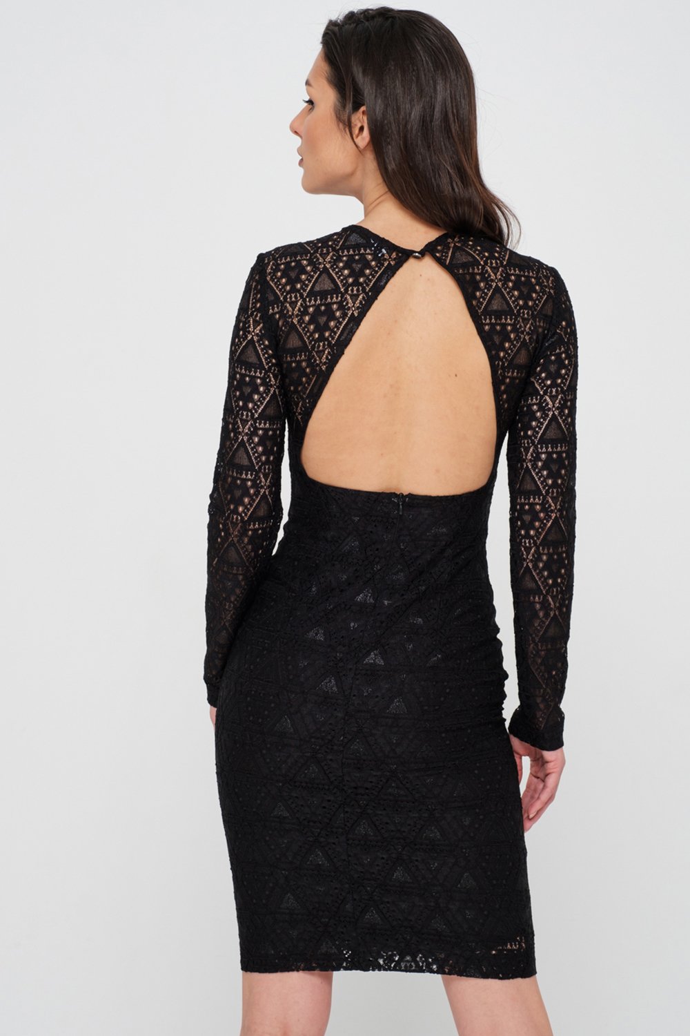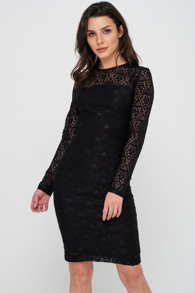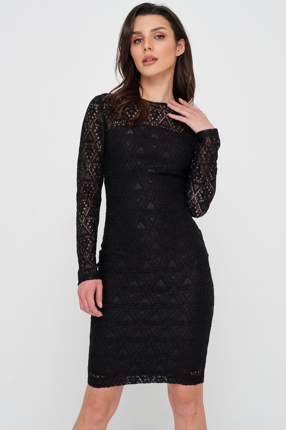 • Особенности: Платье прилегающего силуэта из кружева, частично на подкладке. Детали: по переду - фигурные вытачки, длинный втачной рукав; по спинке - фигурный вырез, застежка на петлю-пуговицу по горловине и на потайную молнию по юбке.