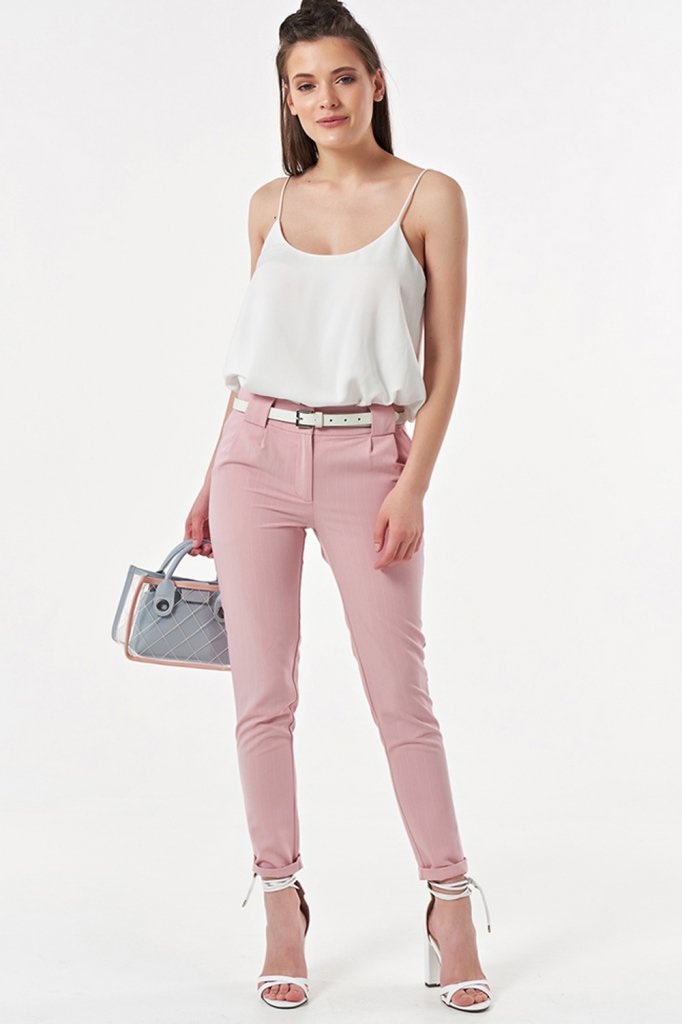 • Особенности: Брюки полуприлегающего силуэта, заужены к низу. Детали: притачной пояс, широкие шлевки, защипы, по низу - манжеты с отворотом. Ремень в комплект не входит.