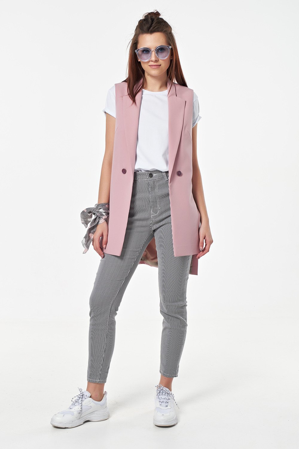 • Особенности: Жилет прямого силуэта. Детали: отложной пиджачный воротник, декоративные пуговицы, фигурная пройма, смещенные боковые швы переходящие в разрезы, удлиненная спинка.