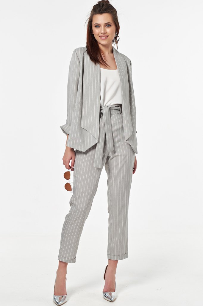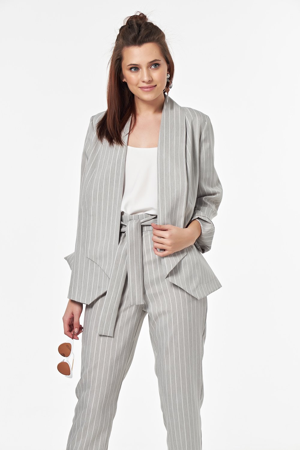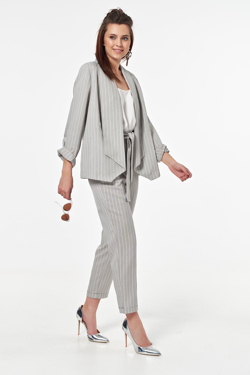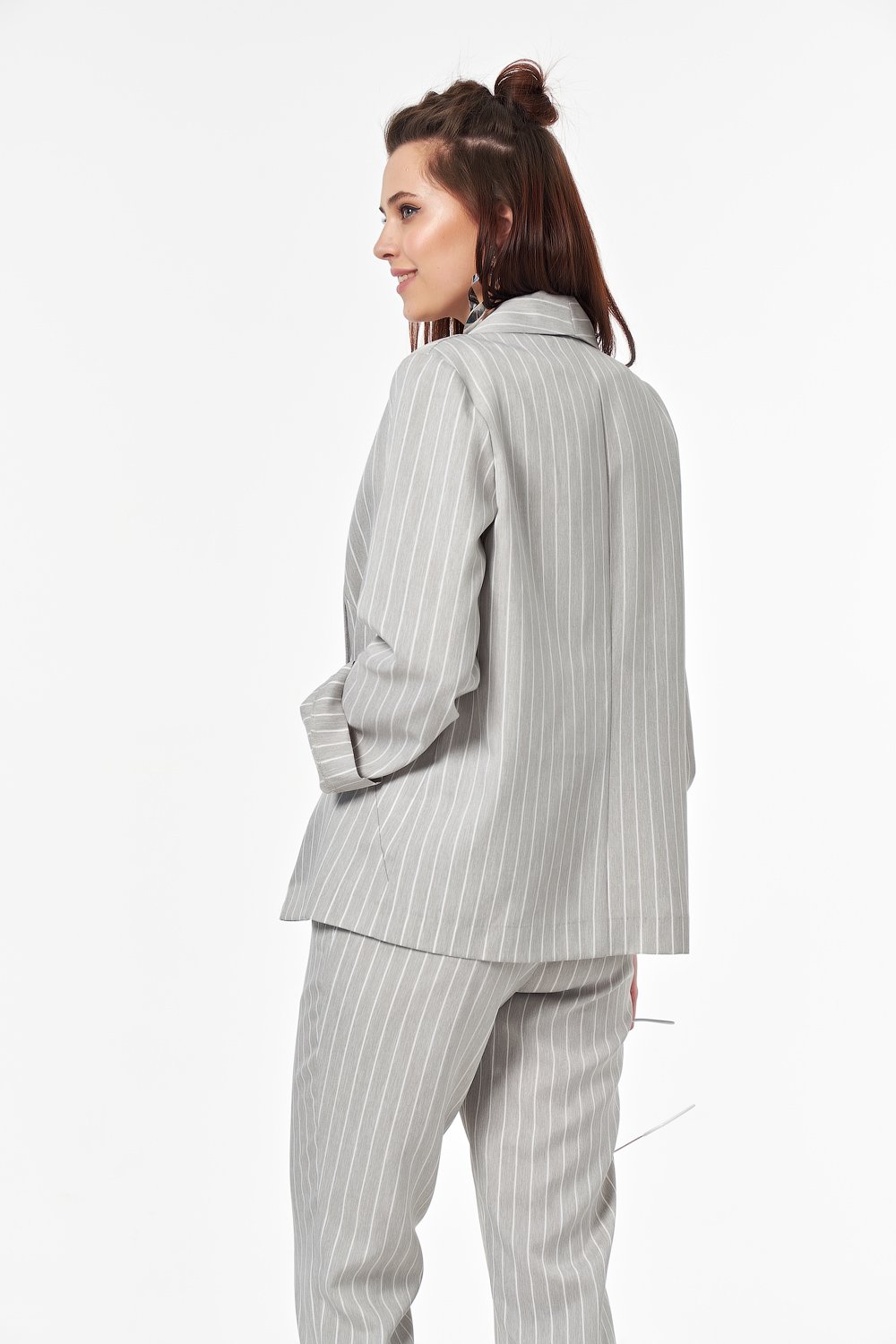 • Особенности: Жакет прямого силуэта из костюмной ткани в полоску. Детали: шалевый воротник, фигурная линия низа, вытачки, длинный рукав.