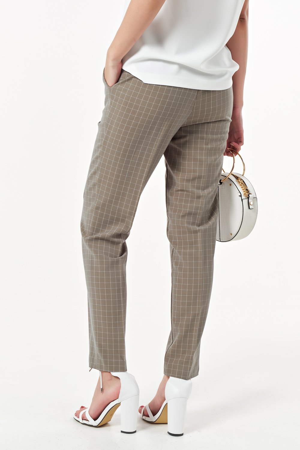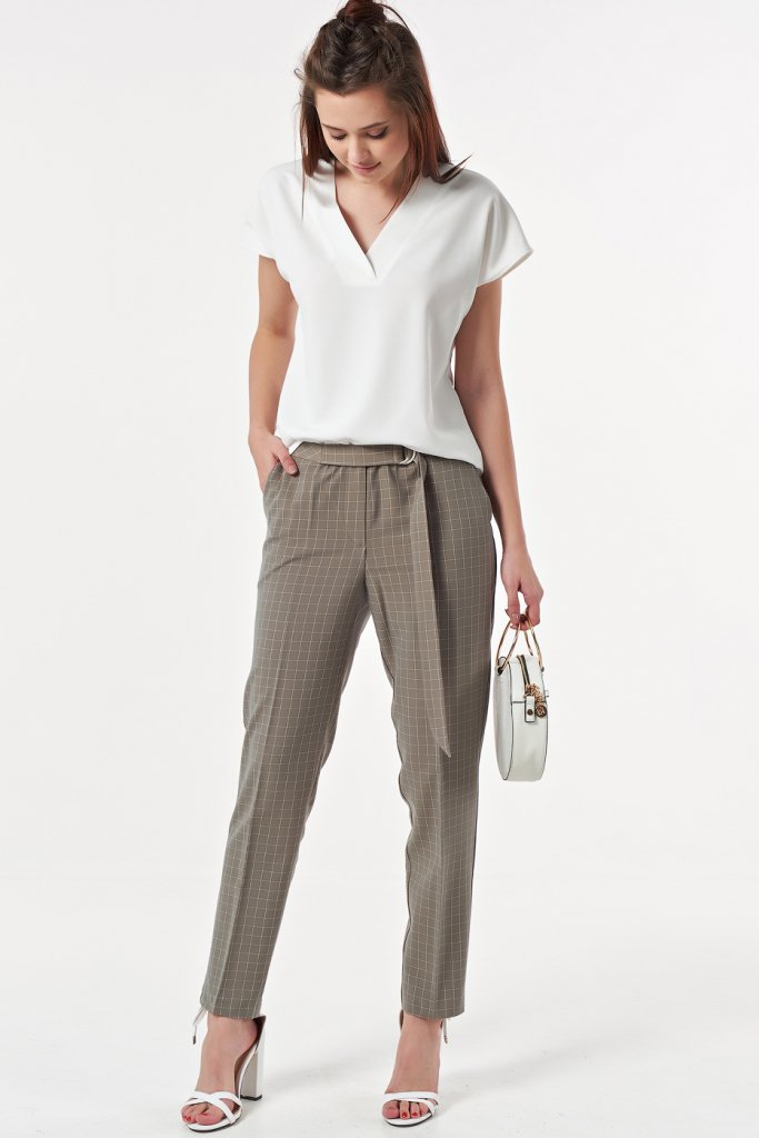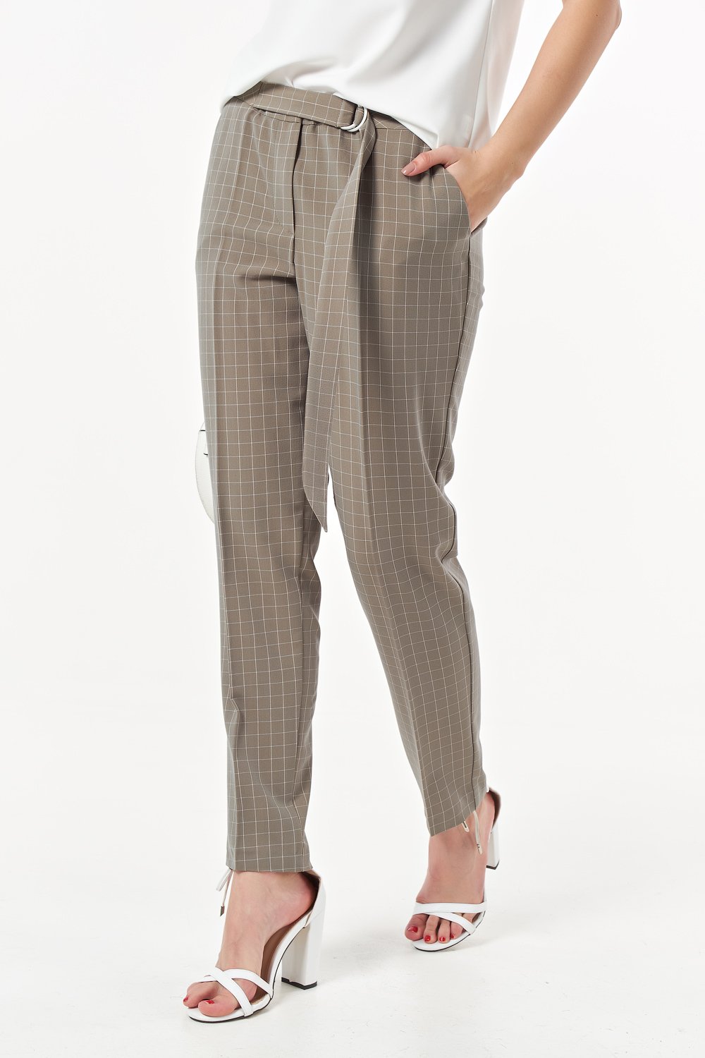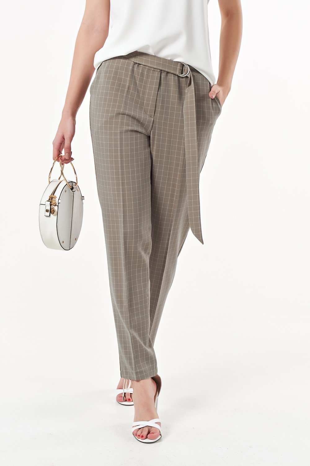 • Особенности: Брюки полуприлгающего силуэта из костюмной ткани в клетку. Детали: притачной пояс с длинной завязкой и металлическими полукольцами, брючные карманы.