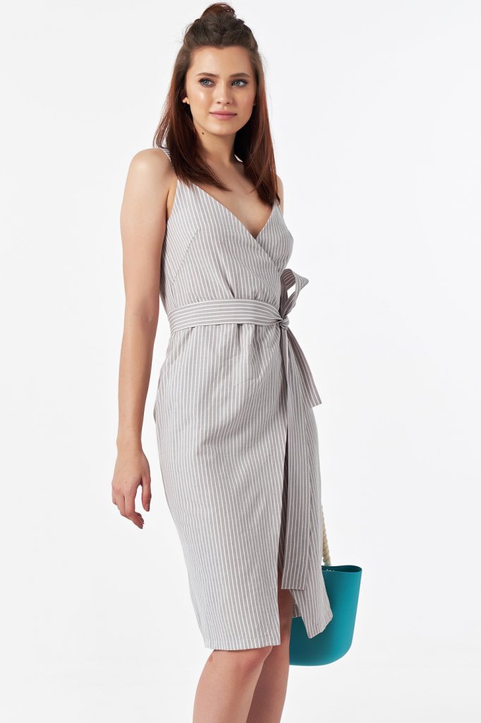 • Особенности: Платье на бретелях прилегающего силуэта из легкой ткани. Детали: отрезное по талии, запах в верхней и нижней частях переда, пояс из основной ткани в комплекте. Застежка на молнию в среднем шве спинки.