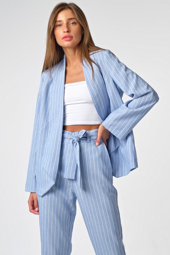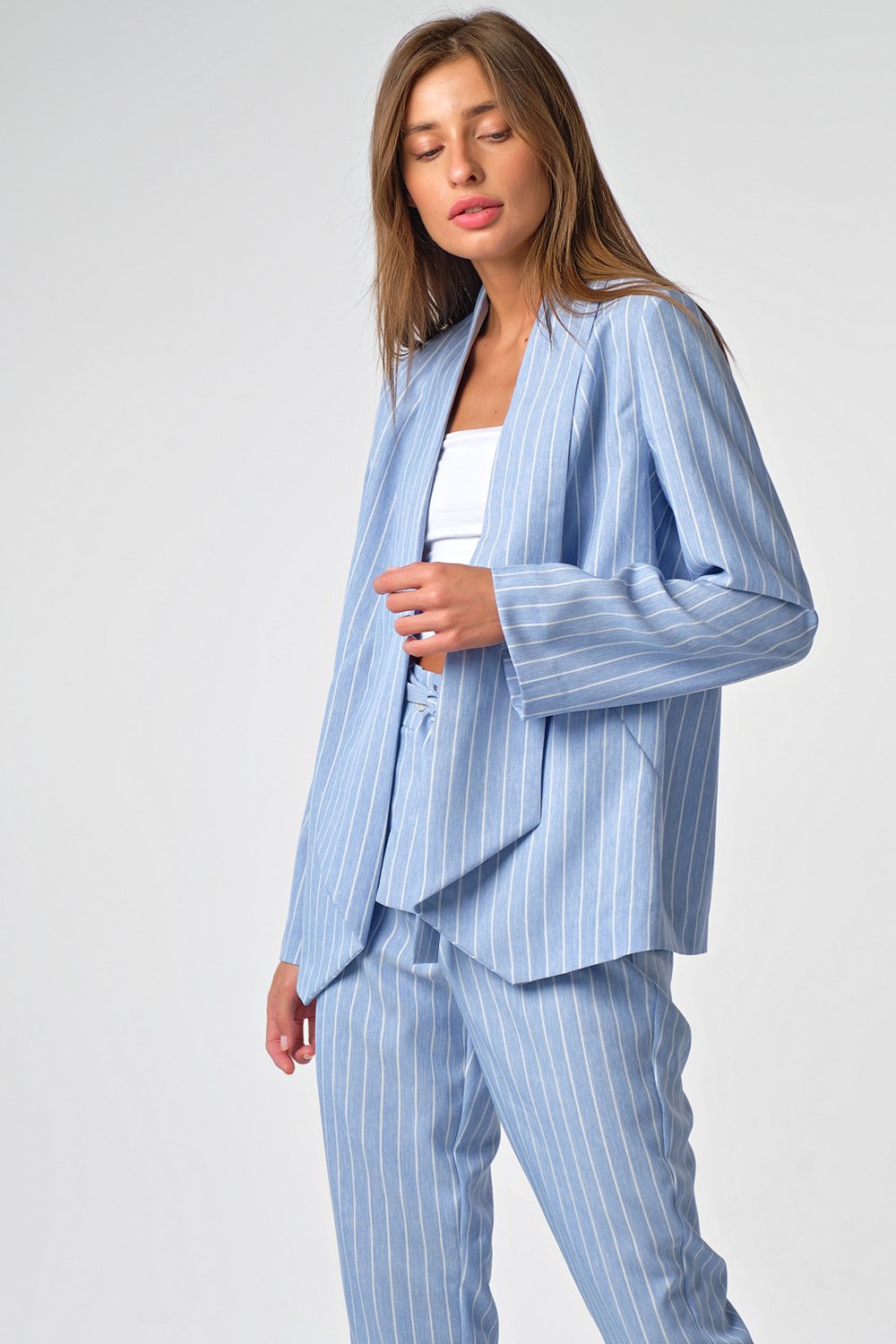 • Особенности: Жакет прямого силуэта из костюмной ткани в полоску. Детали: шалевый воротник, фигурная линия низа, вытачки, длинный рукав.