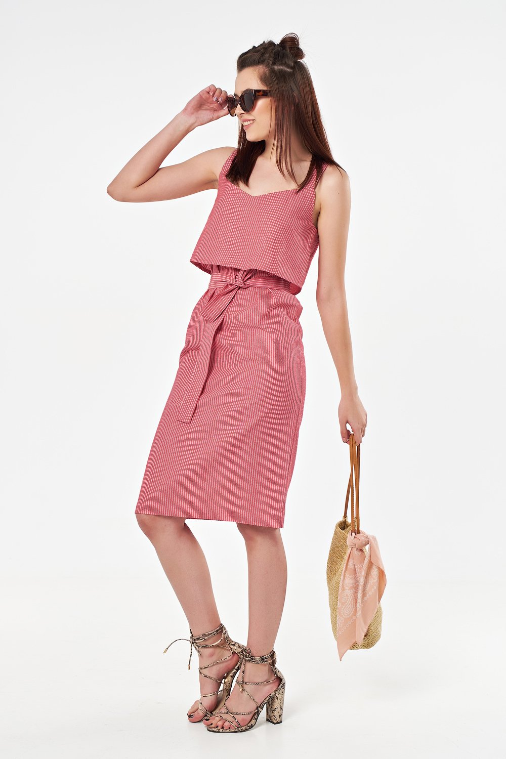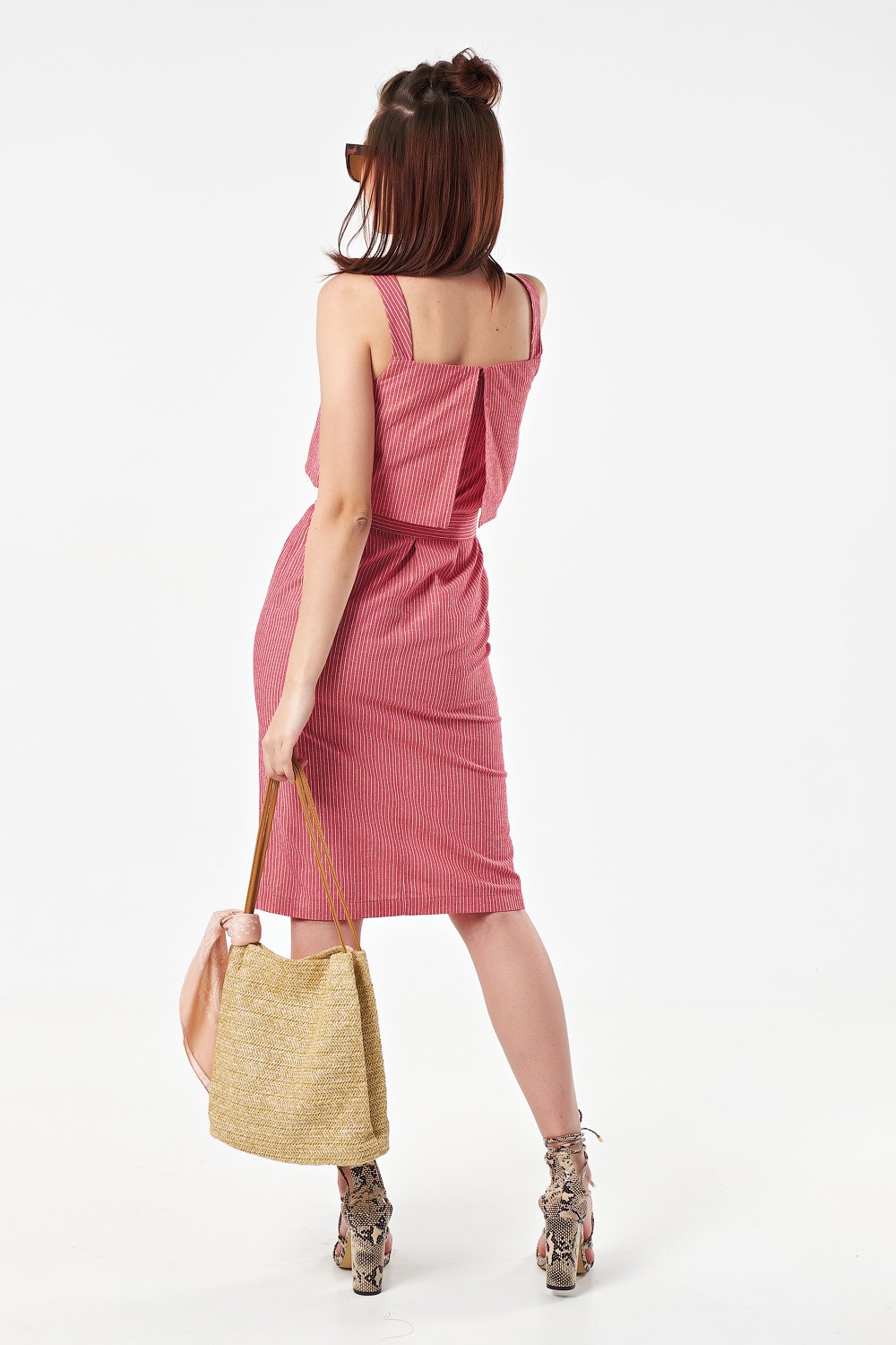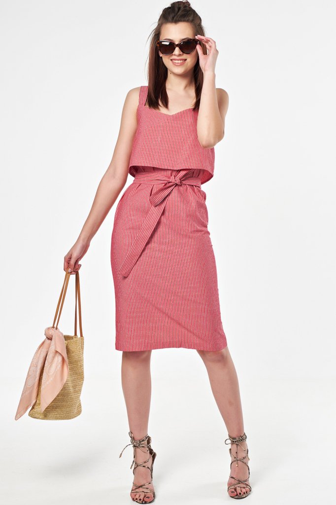 • Особенности: Платье прямого силуэта из хлопковой ткани. Детали: широкие бретели, отлетная кокетка, пояс из основной ткани в комплекте. Застежка на молнию в среднем шве спинки.