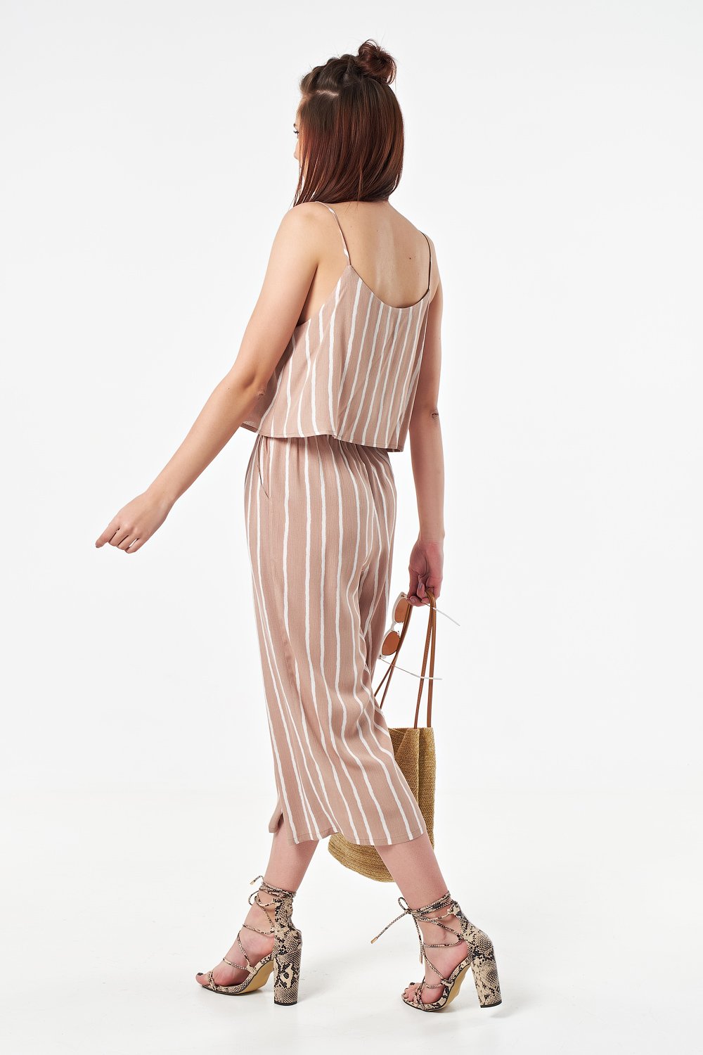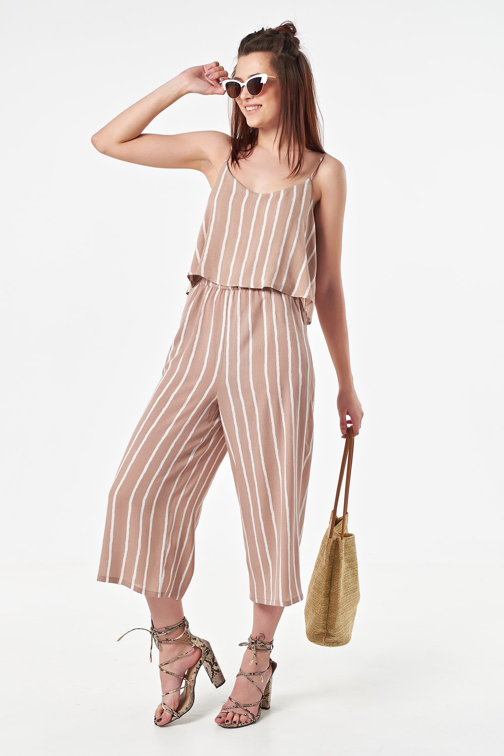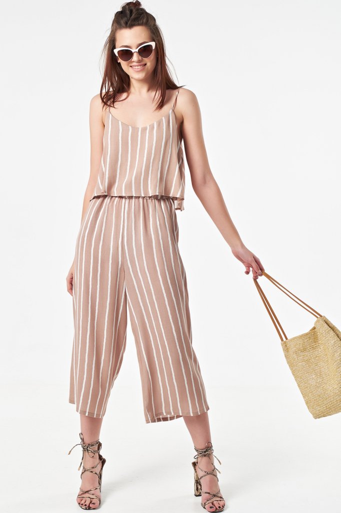 • Особенности: Комбинезон из легкой ткани с принтом. Детали: свободный силуэт, тонкие бретельки, верх с отлетной кокеткой, по линии талии выполнена сборка на резинку, брючные карманы.