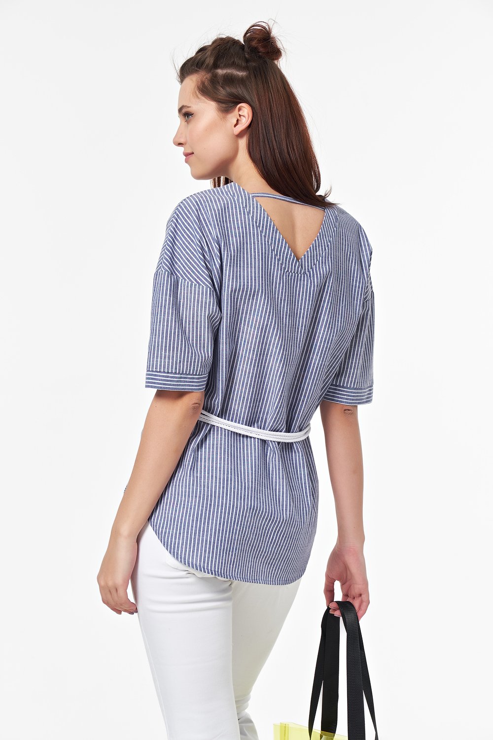 Детали: воротник-стойка, фигурный вырез горловины по переду и спинке, накладной карман, втачной рукав с притачной манжетой. Длинный плетенный шнур-завязка по талии в комплекте.