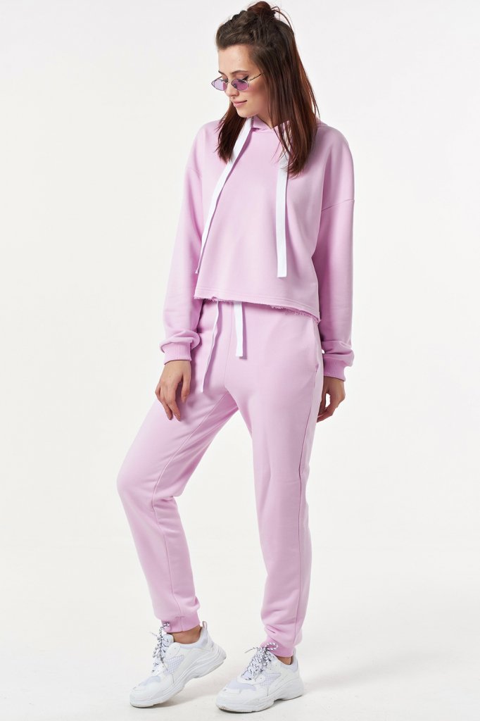 • Особенности: Костюм из футера с отделкой кашкорсе. Свитшот прямого силуэта, объемный. Детали: капюшон со шнурком, спущенная пройма, манжеты рукавов из кашкорсе, понизу открытый срез укрепленный отделочной строчкой и притачанной полоской из футера. Брюки свободные с высокой посадкой на талии. Детали: пояс и манжеты выполнены из кашкорсе, в пояс продет шнур, карманы в боковых швах.