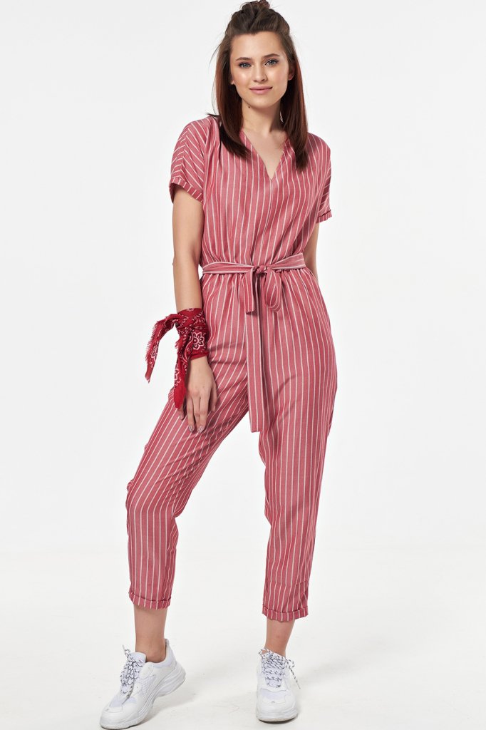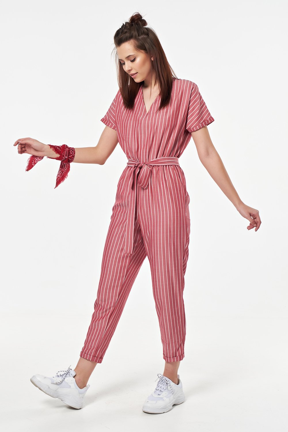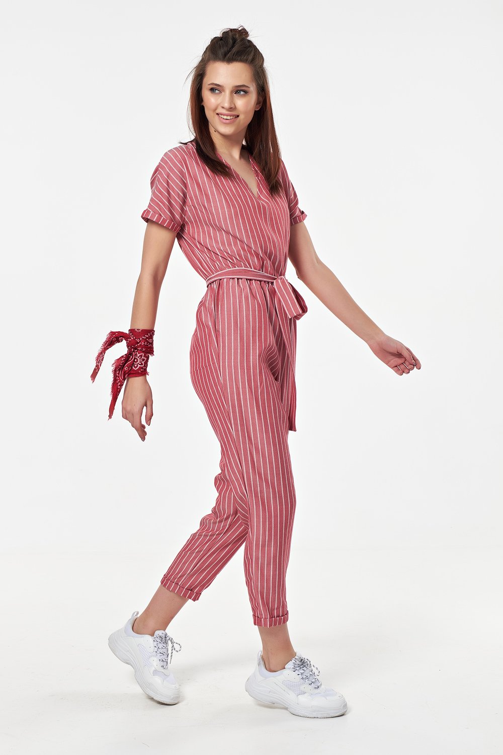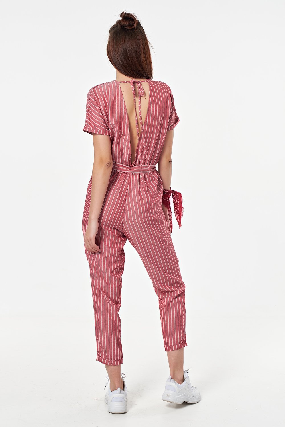 • Особенности: Комбинезон полуприлегающего силуэта из плательной ткани. Детали: цельновыкроенный рукав с притачной манжетой, V-образный вырез горловины переда, глубокий вырез по спинке скреплен завязками, брючные карманы, отвороты по низу брюк. Пояс в комплекте. Без застежки.