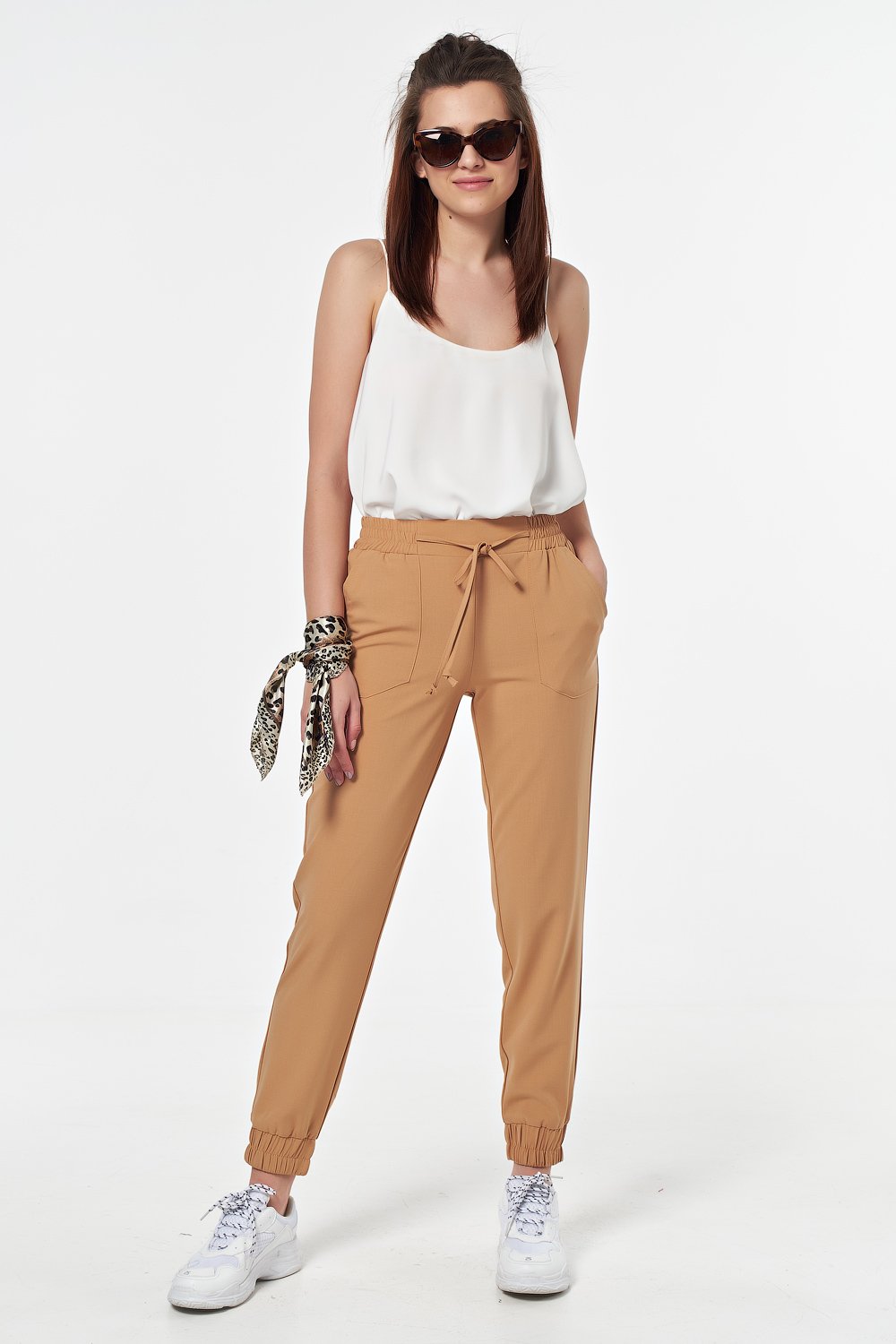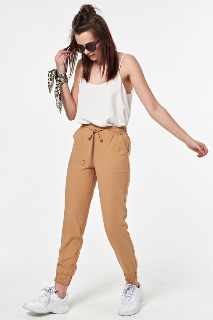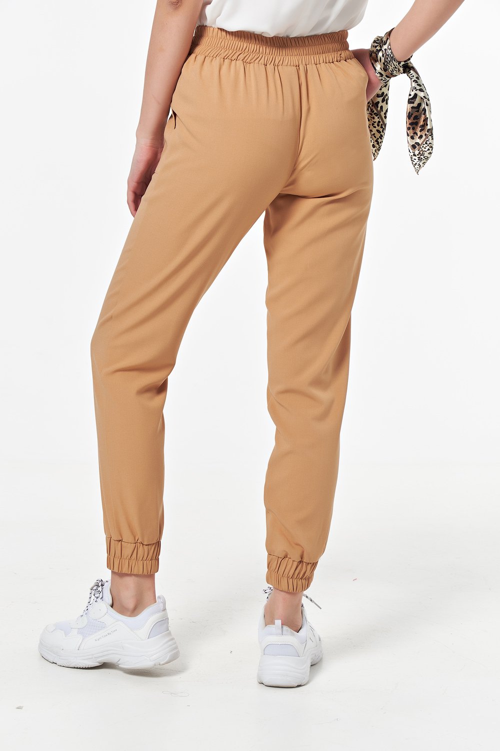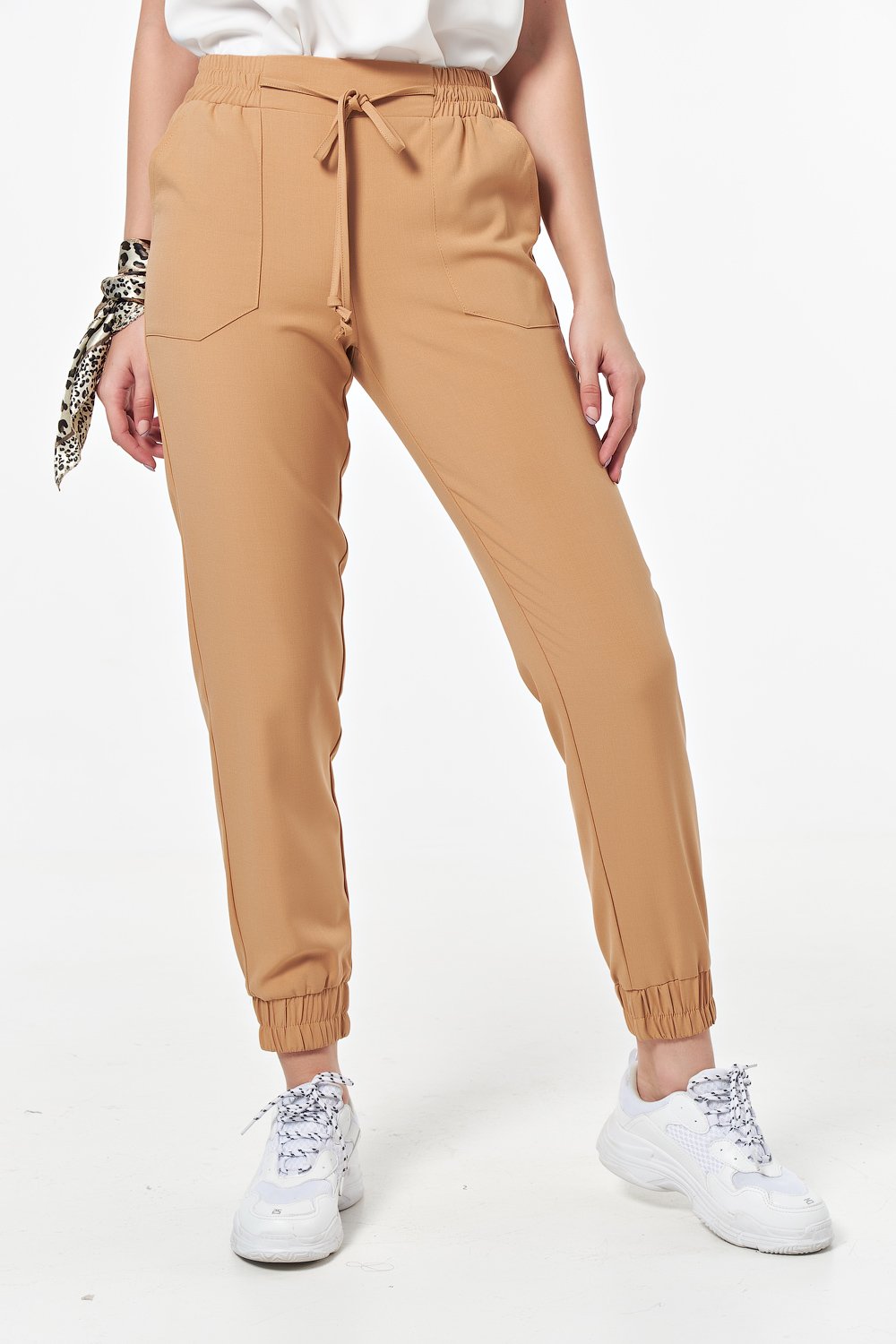 • Особенности: Брюки полуприлегающего силуэта из тонкой костюмной ткани. Детали:притачные манжеты по низу брючин со сборкой на резину, накладные карманы, притачной пояс со вставкой собранной на резину, притачные шнурки-завязки. Без застежки.