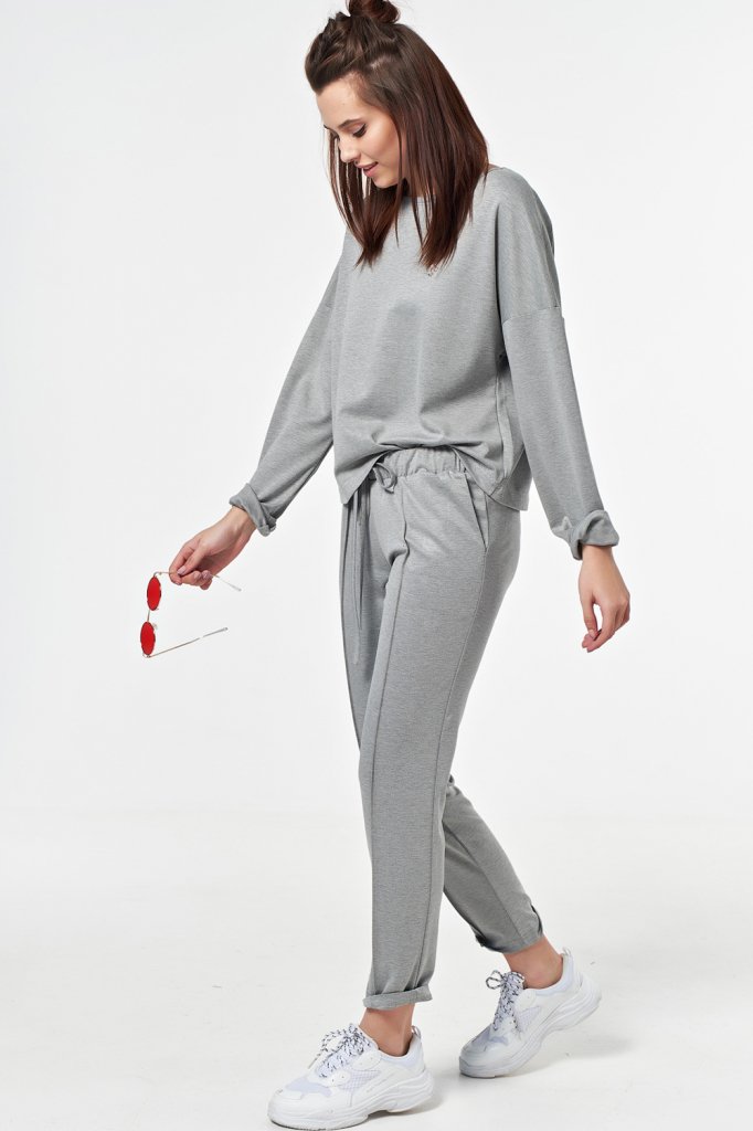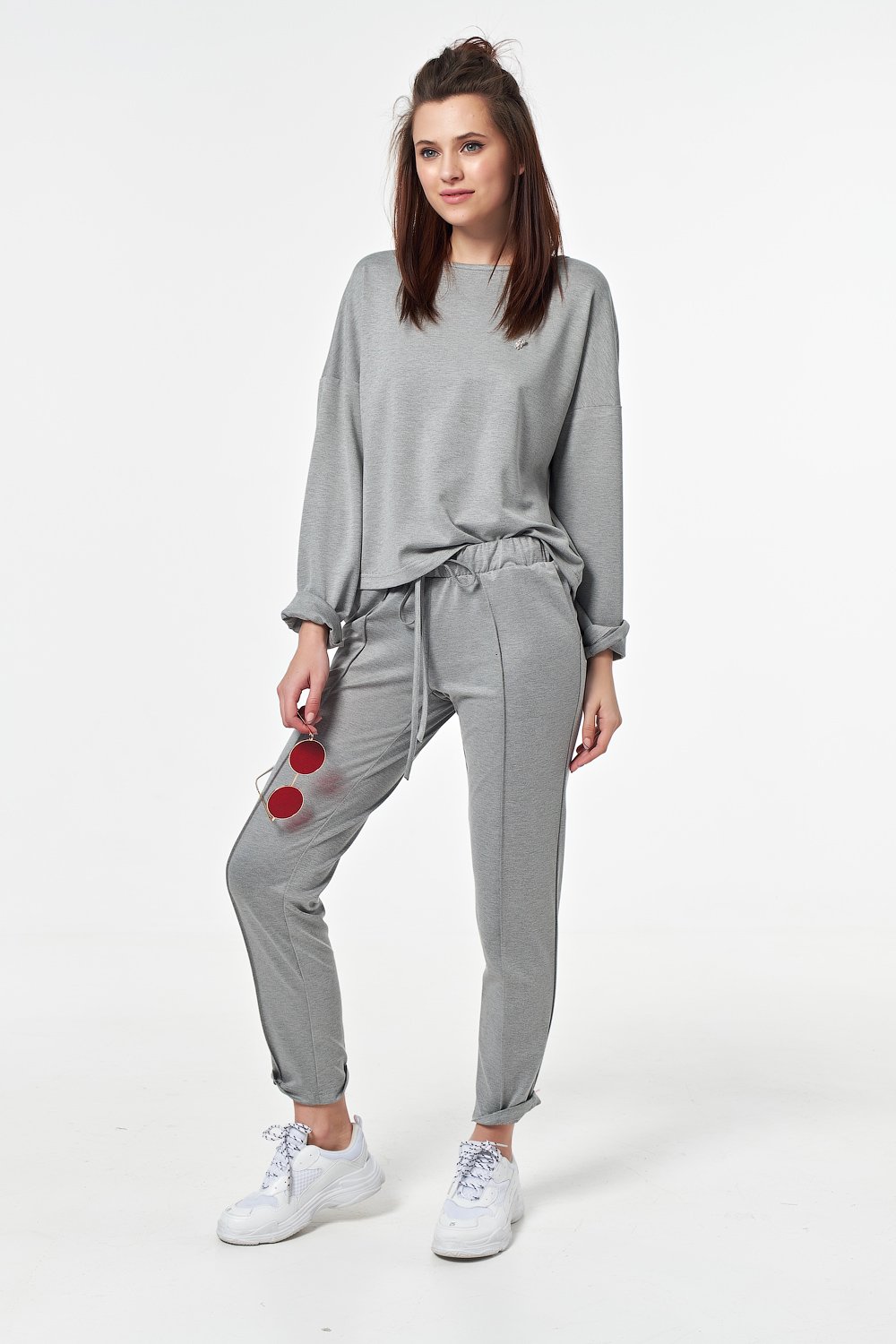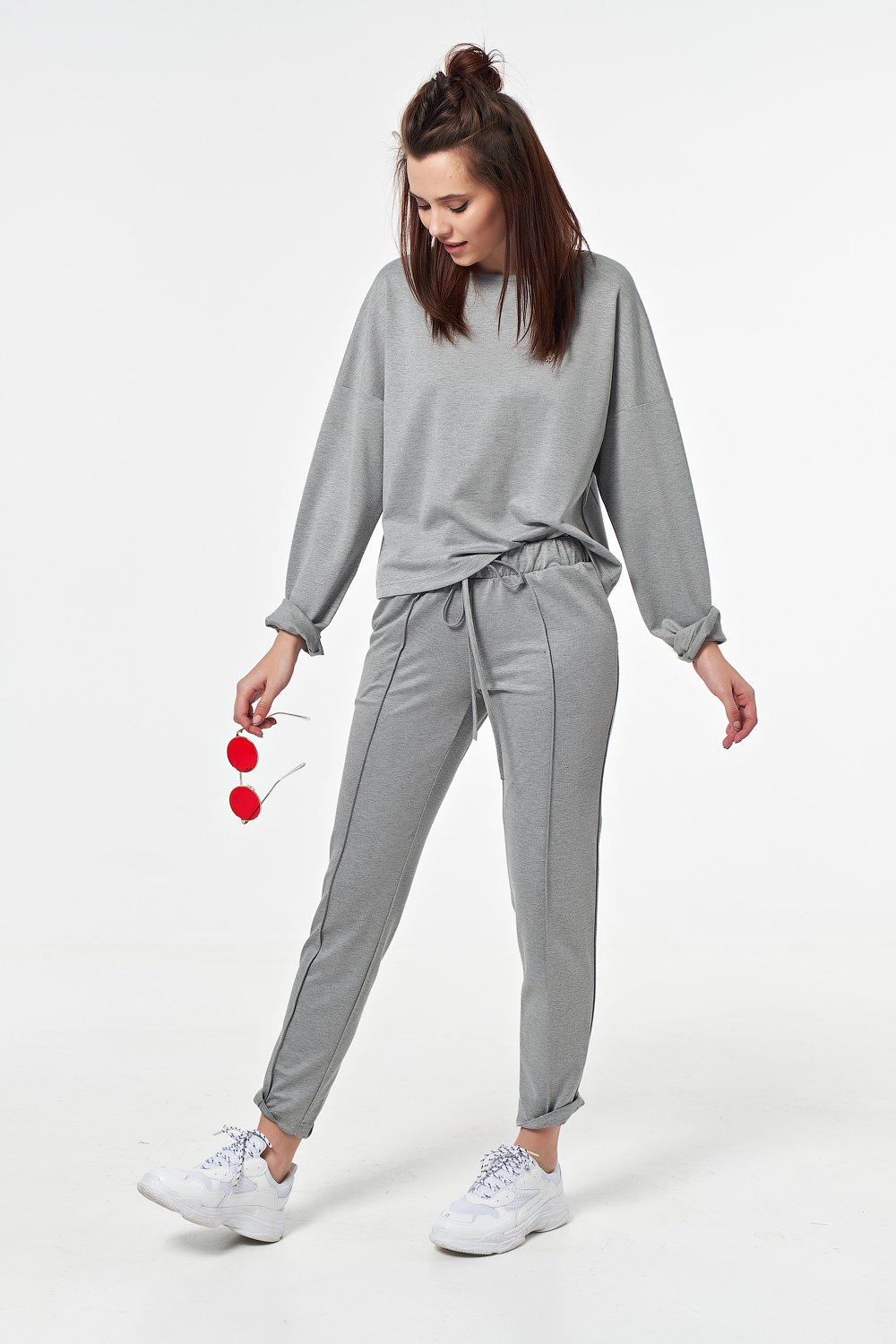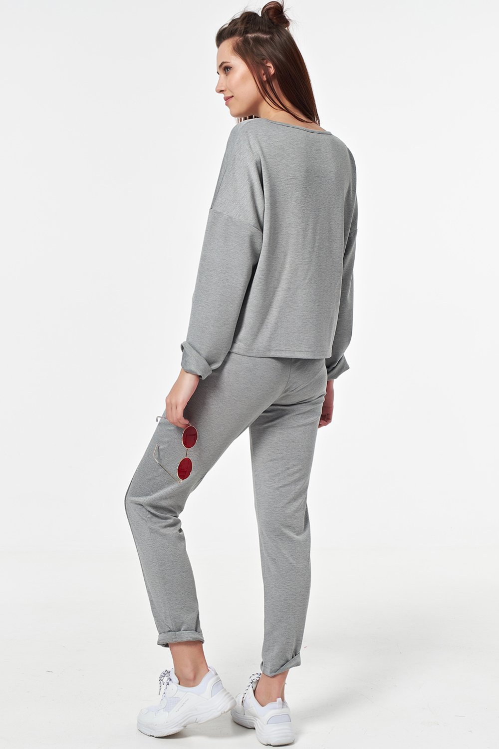 • Особенности: Костюм из тонкого трикотажа состоит из брюк и свитшота. Брюки с притачным поясом на резине, боковые карманы, в поясе шнурок. Свитшот: спущенная линия плеча, по переду брошь.