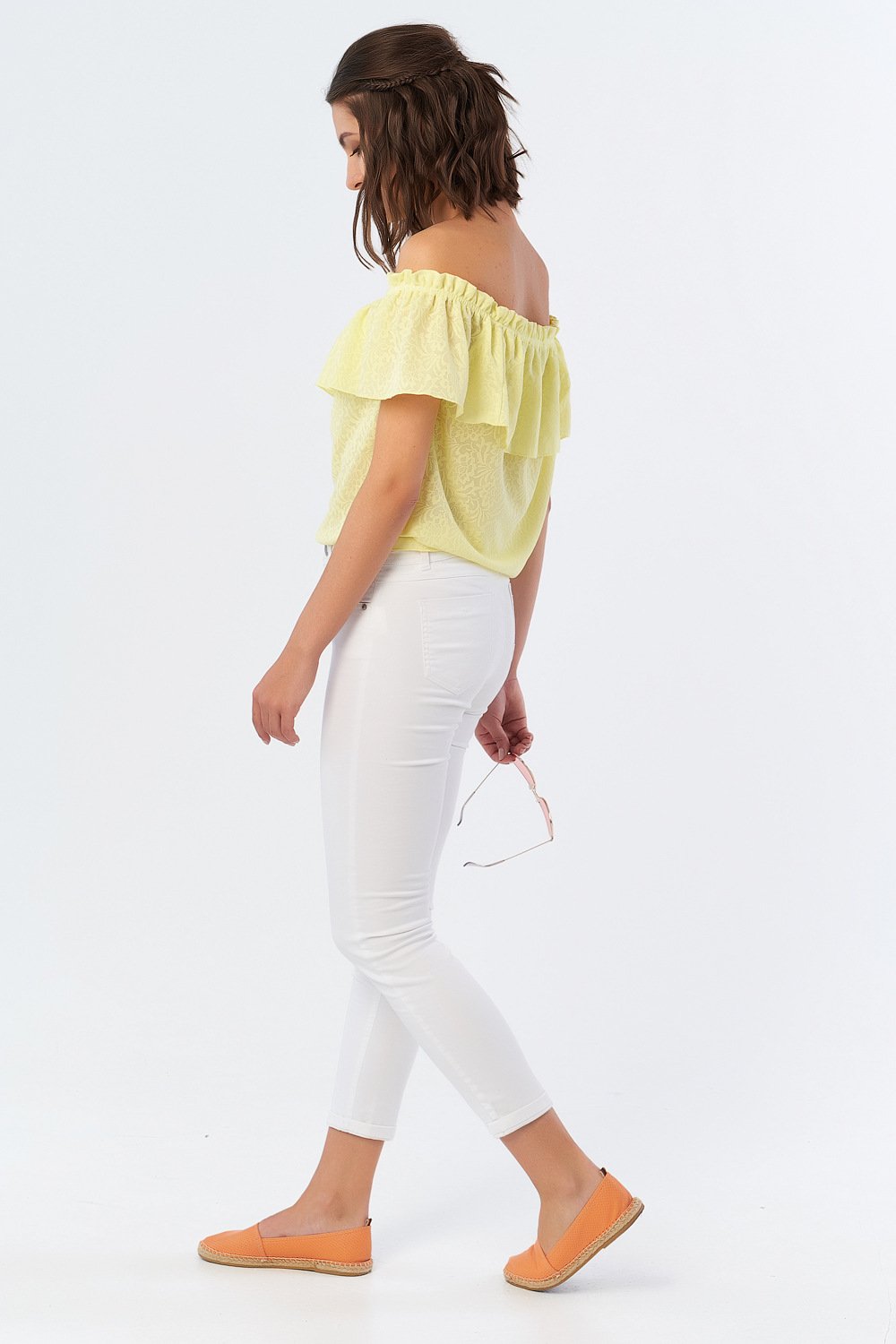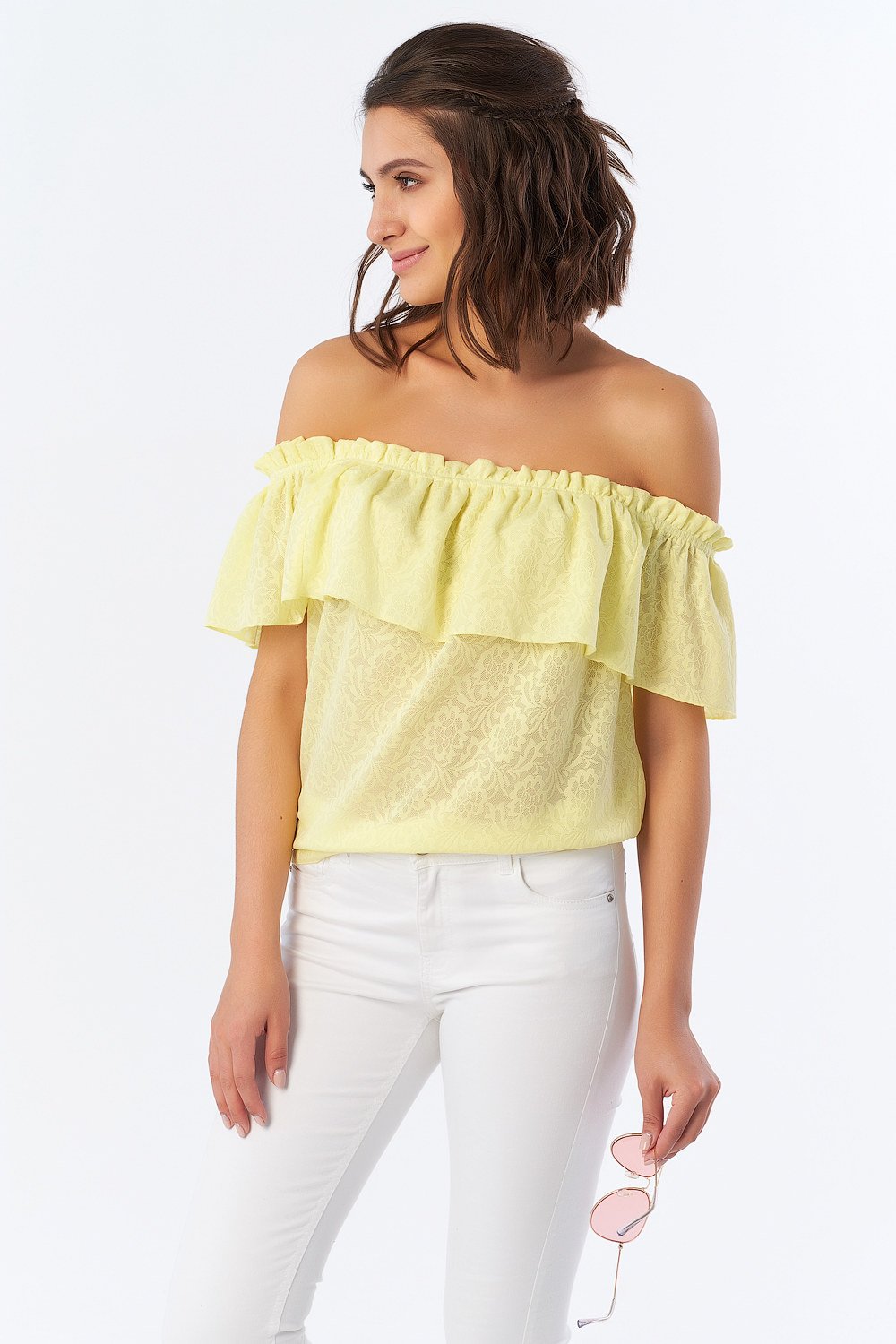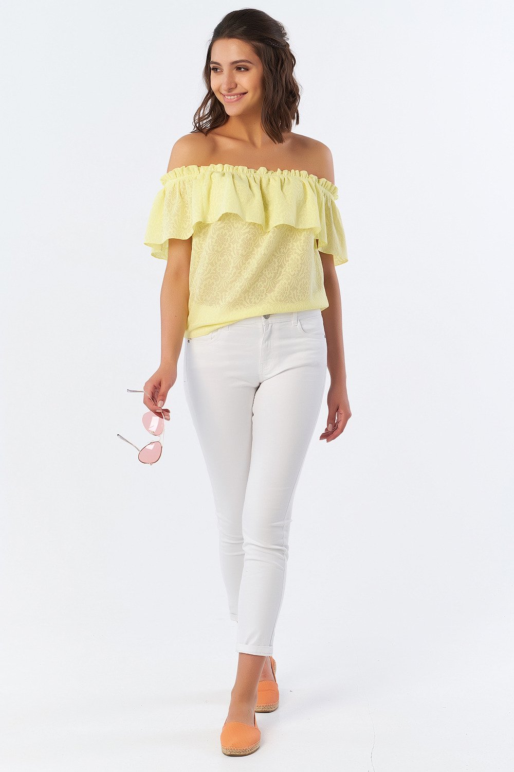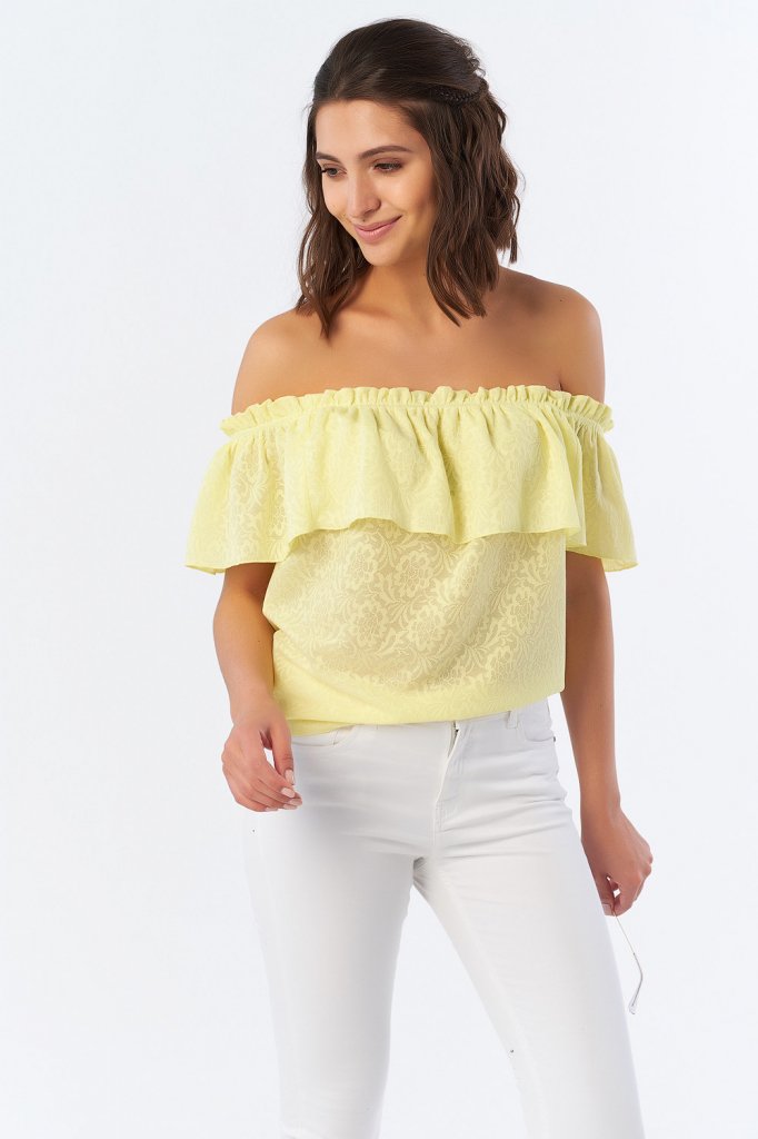 • Особенности: Топ из трикотажа с открытыми плечами. В верхней части выполнен волан со сборкой на резинку.