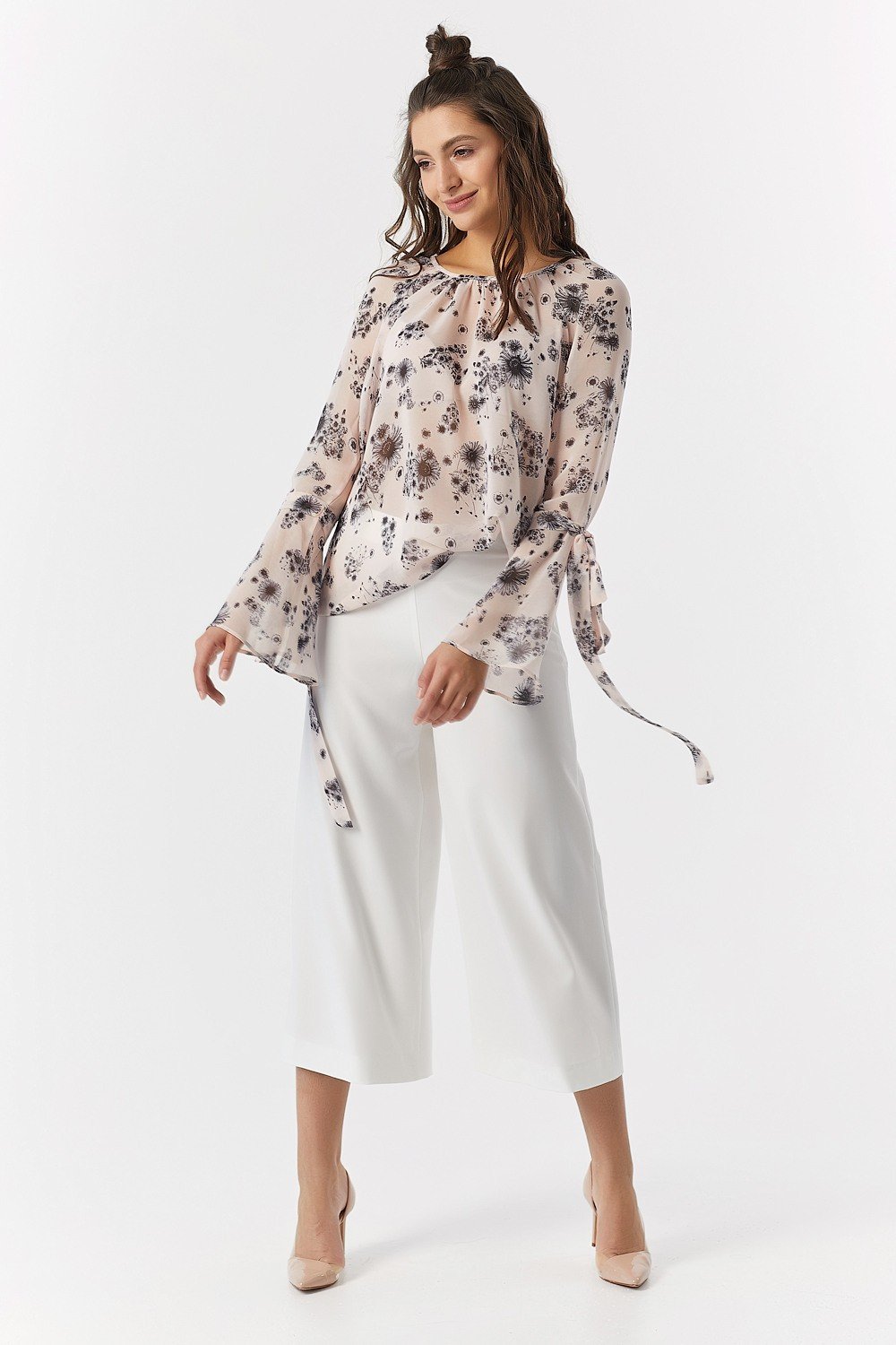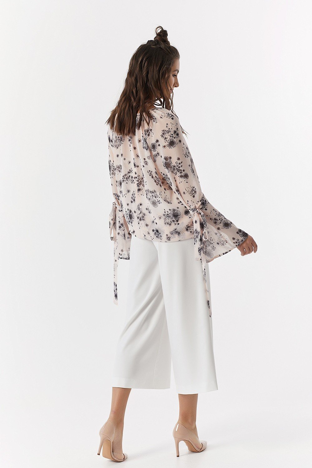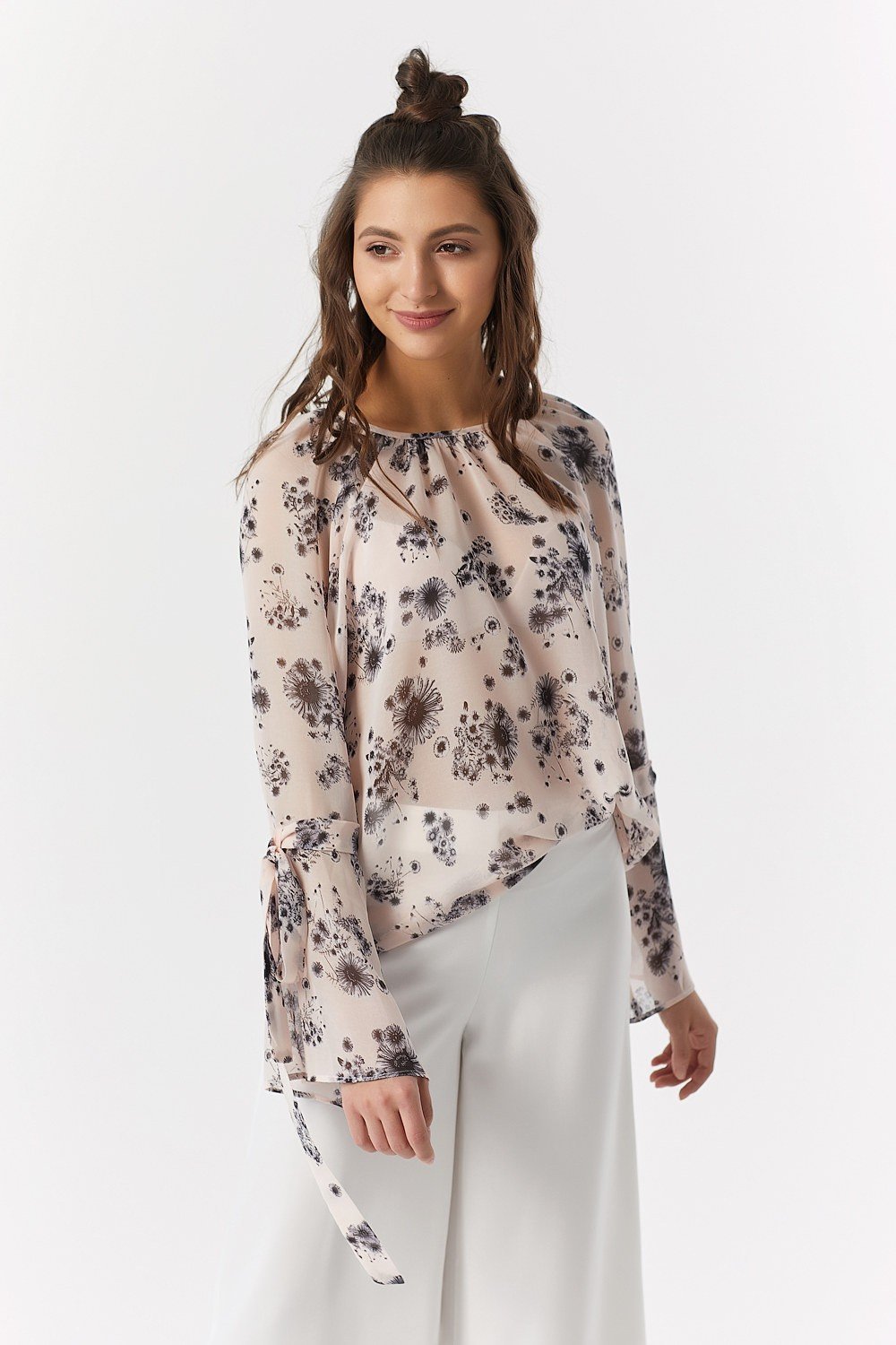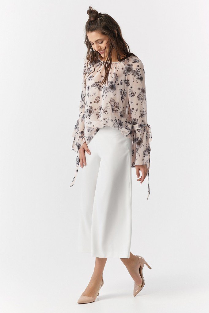 • Особенности: Свободна летящая шифоновая блуза с наборкой по горловине с рукавом-реглан. Рукав с расклешенной отрезной нижней частью, имеет петлю и две декоративные завязки. По горловине спинки - застежка на петлю и пуговицу.