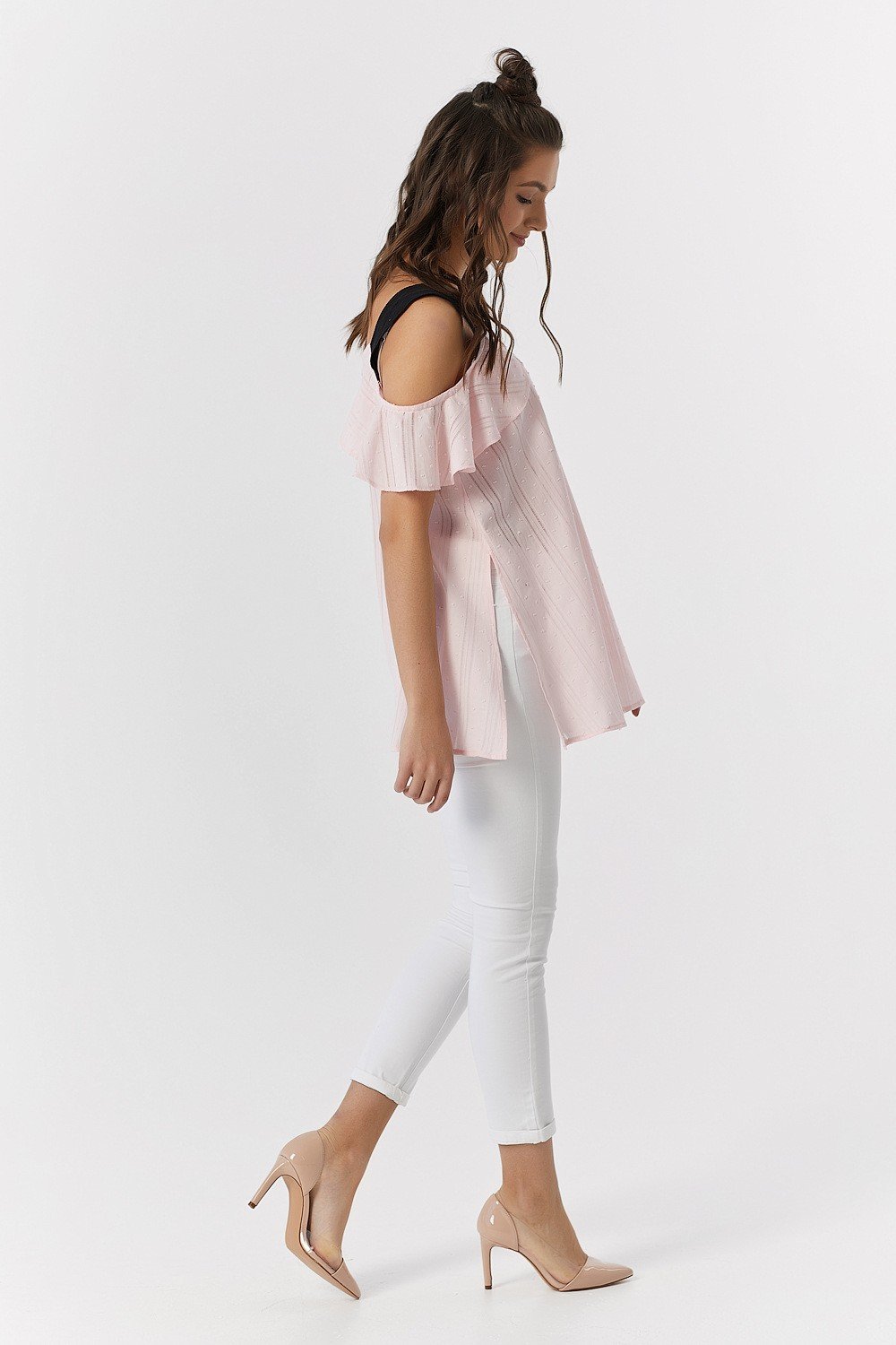 • Особенности: Хлопковый топ свободного силуэта с широкими контрастными бретелями и воланами по плечам. Детали: округлый вырез горловины, разрез по боковому шву.