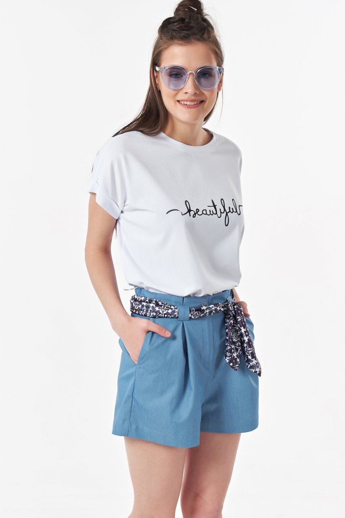 • Особенности: Шорты прямого силуэта из джинсовой ткани. Детали: цельновыкроенный пояс с бантовыми складками по талии, боковые карманы, широкие шлевки, шнур/пояс в комплекте.