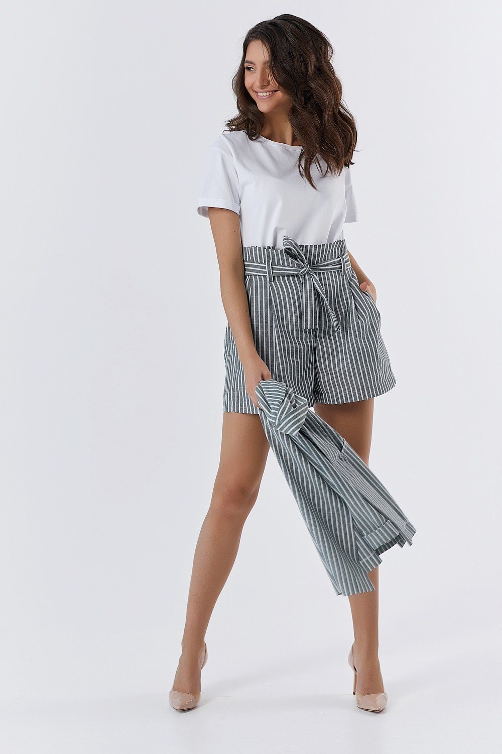 • Особенности: Шорты свободного силуэта из хлопковой ткани. Детали: брючные карманы, высокий приточной пояс, по талии застрочены защипы,по талии настрочены шлевки, длинный съемный пояс.