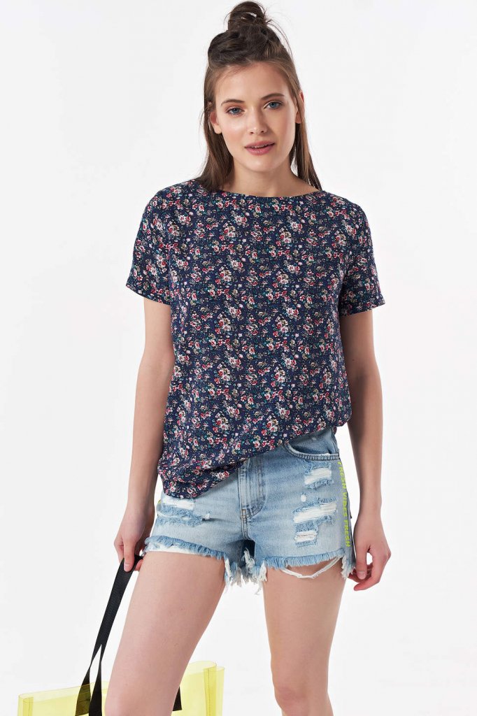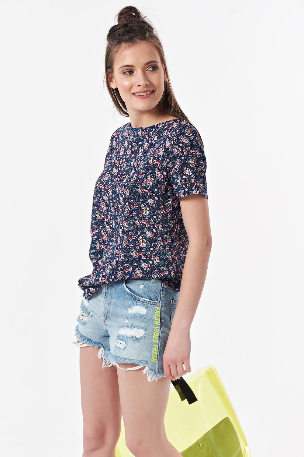 Блуза прямого силуэта из хлопкового штапеля. Рукав короткий. Вырез горловины овальный. По середине спинки выполнен;;шов.