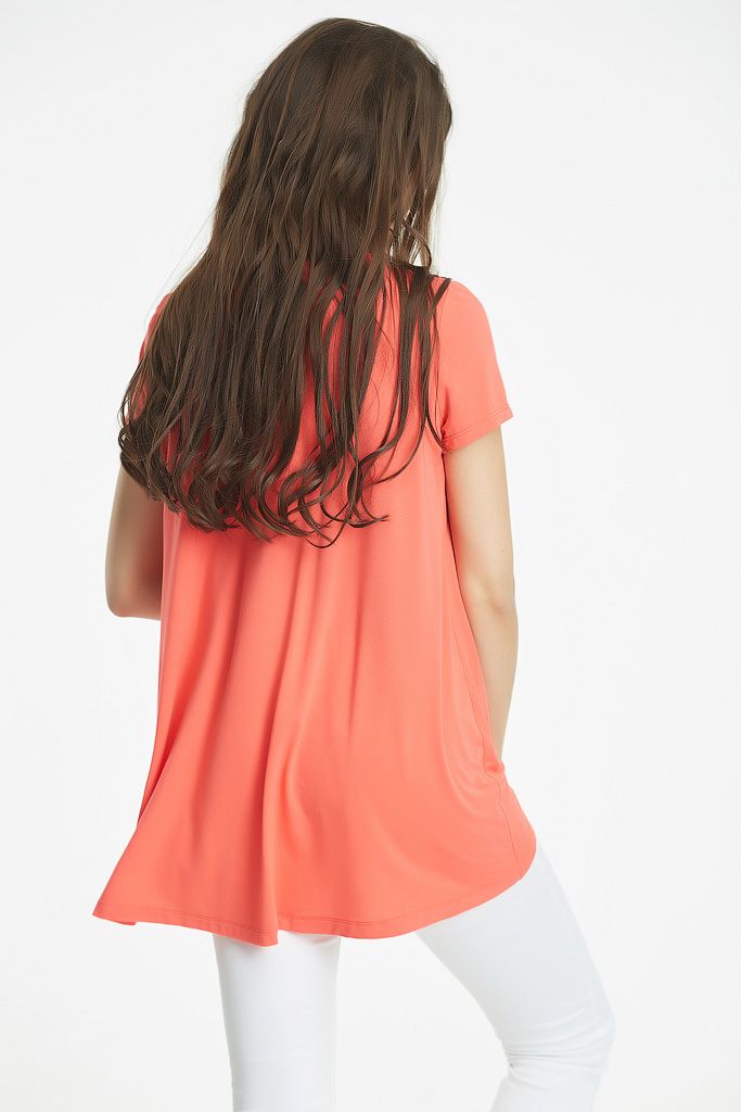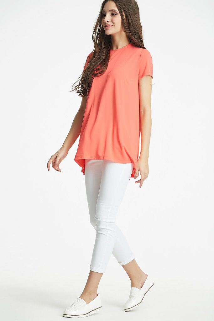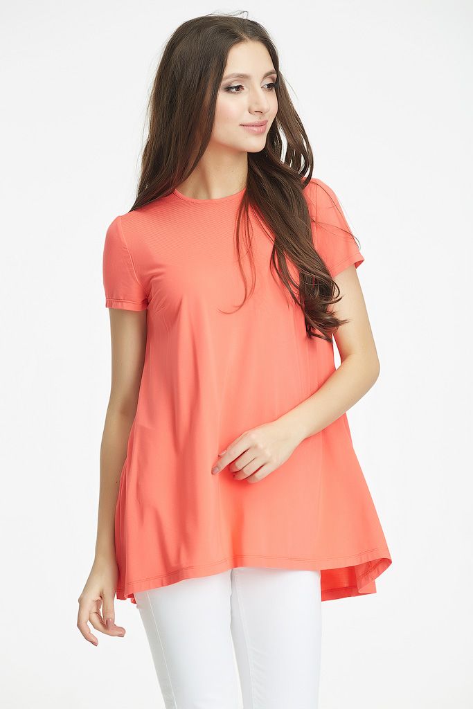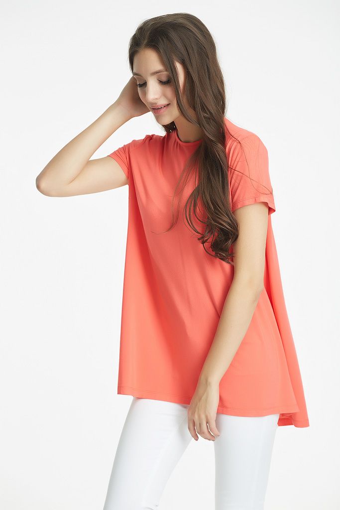 Блуза-туника выполнена из вискозного трикотажа;;в самом современном стиле.;;Овальный вырез горловины, рукав укороченный. Силуэт расклешенный , имеет округлую форму по низу. Спинка длиннее переда на 8 см. Длина изделия по спинке около 75 см (44 р), около 78 см (50 р).