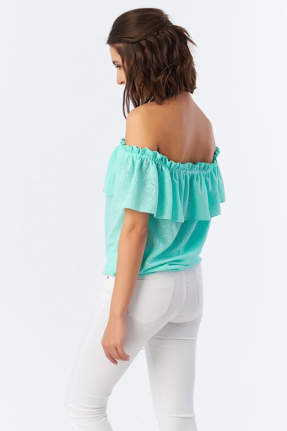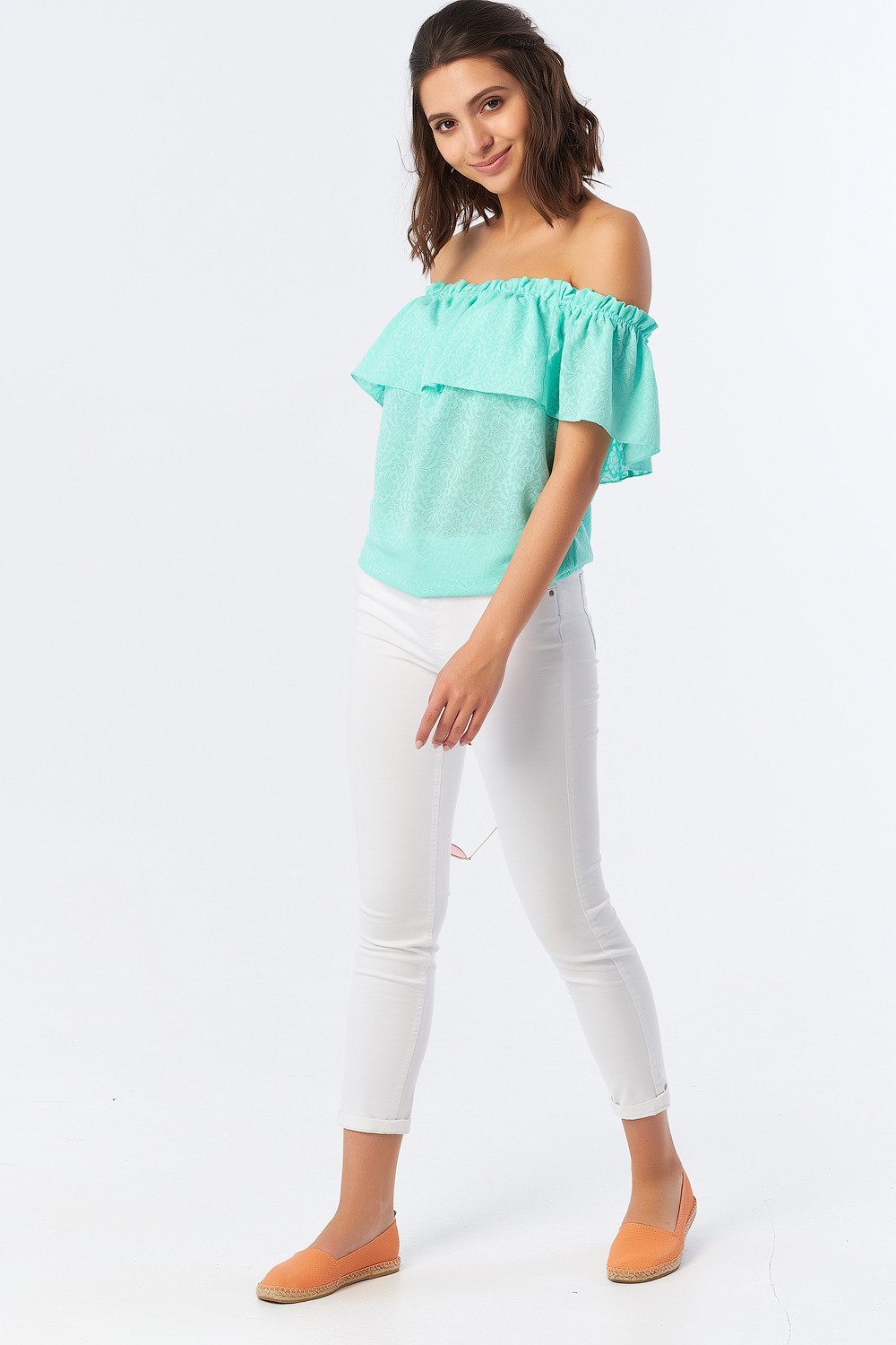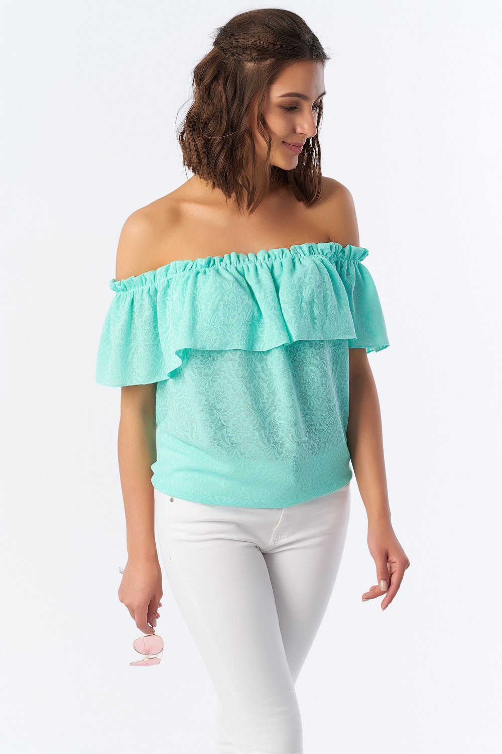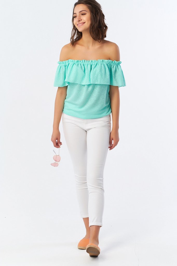 • Особенности: Топ из трикотажа с открытыми плечами. В верхней части выполнен волан со сборкой на резинку.