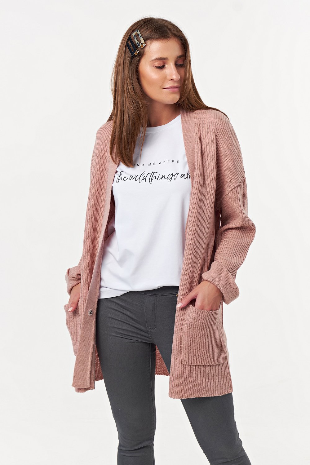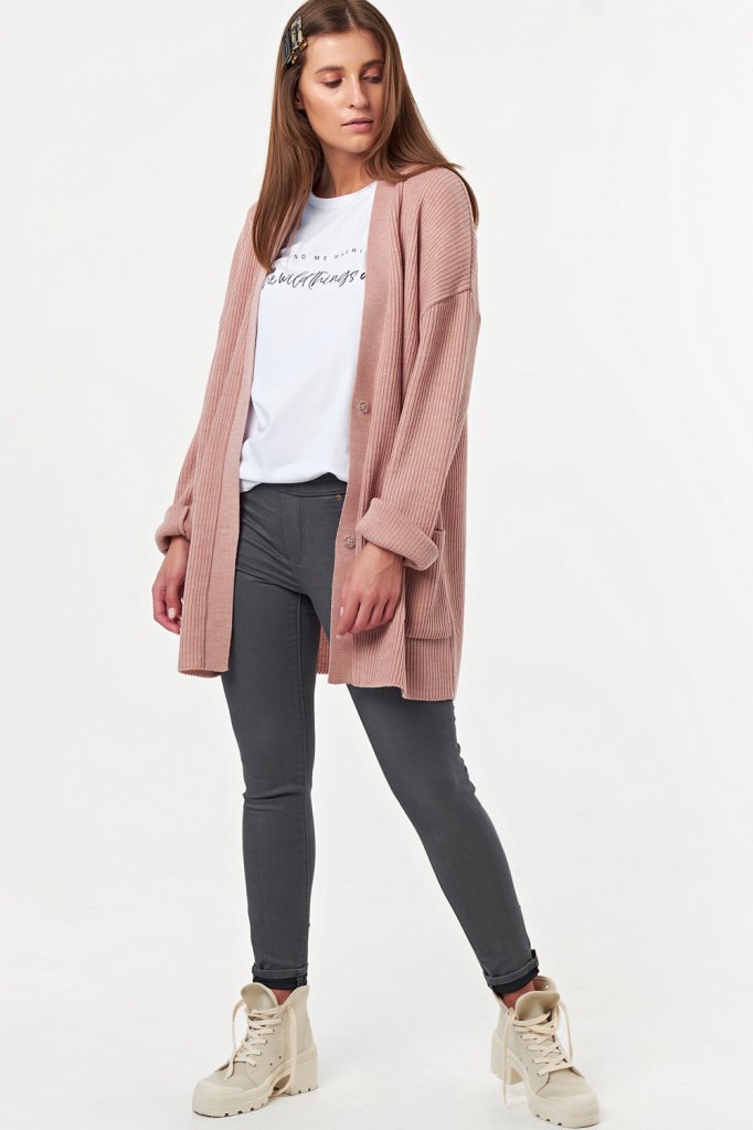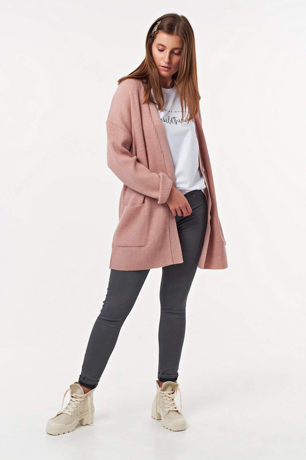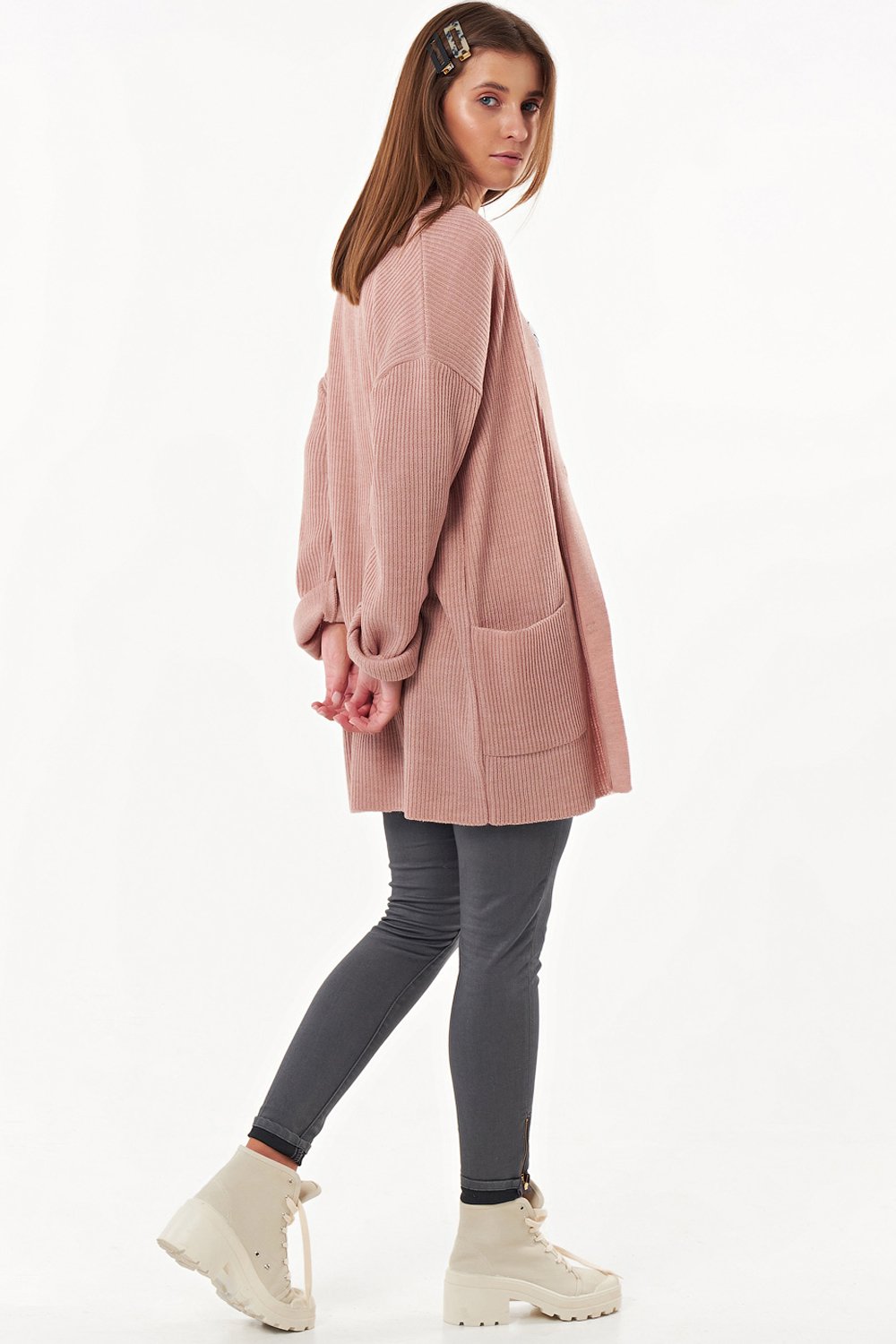 Особенности: Кардиган выполнен из смесовой пряжи фактурной вязкой. Перед кардигана обработан широкой бейкой. Рукава, низ изделия без резинки.
