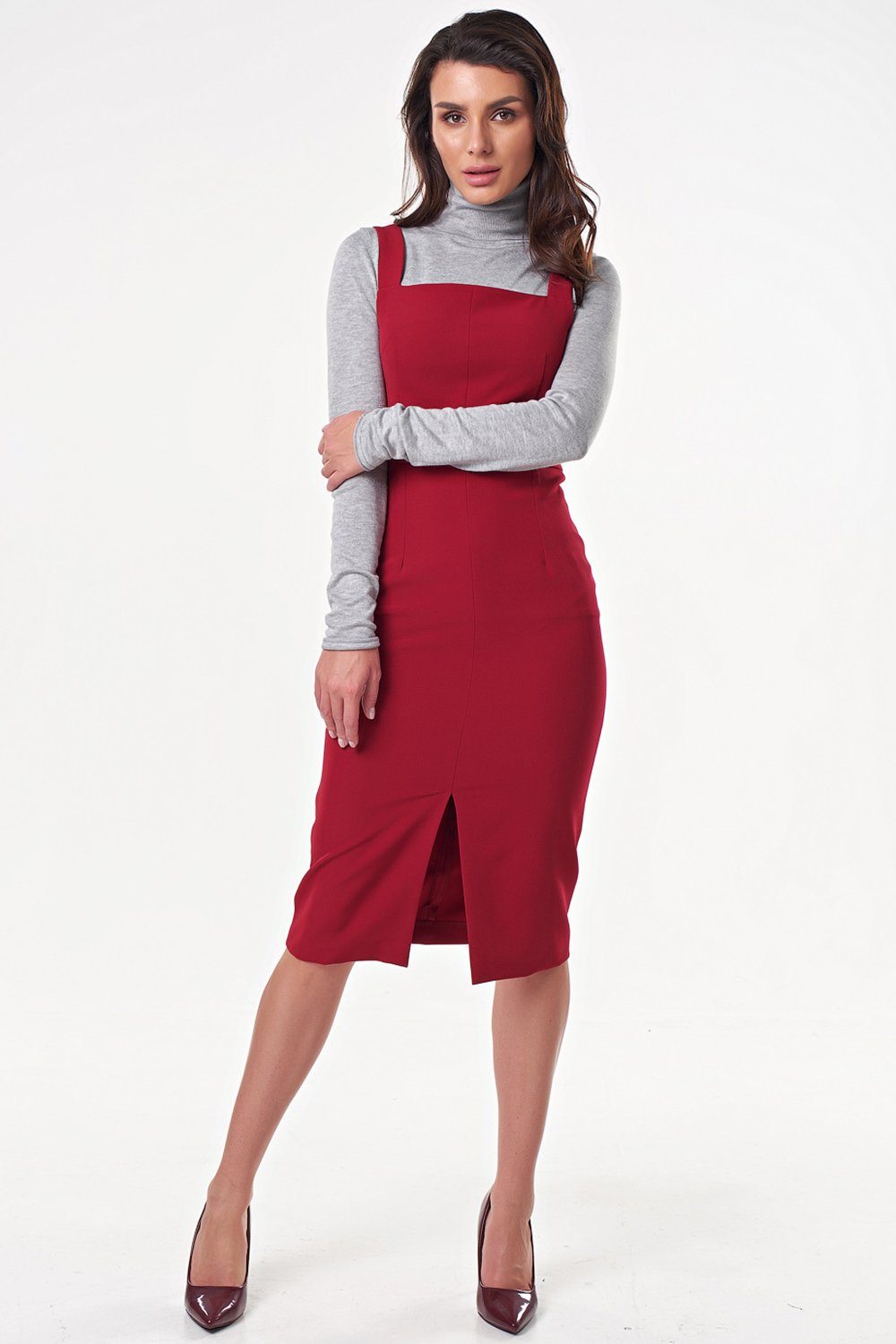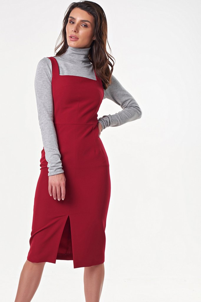 • Особенности: Сарафан прилегающего силуэта из плотной костюмной ткани. Детали: широкие бретели, квадратный вырез, вытачки, шов по переду переходящий в разрез по низу.