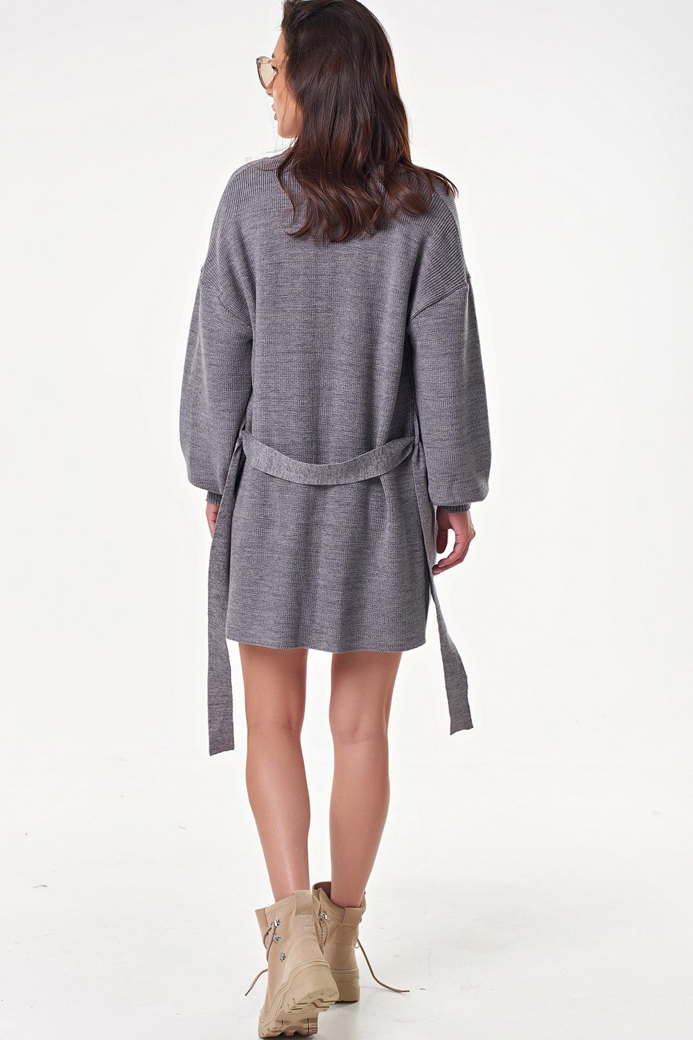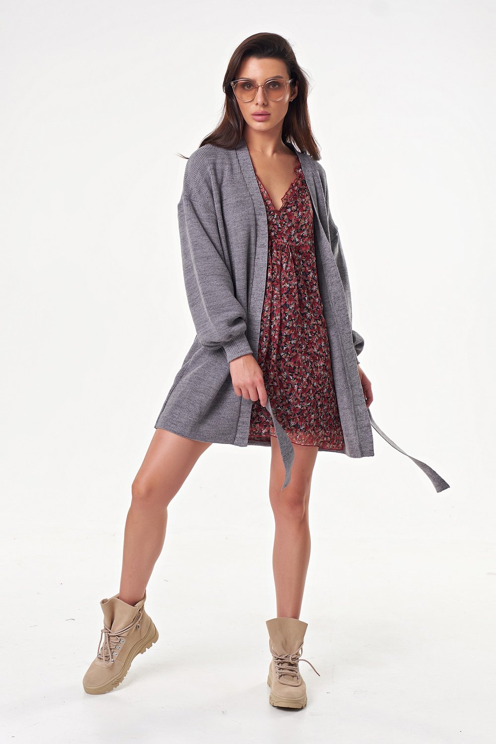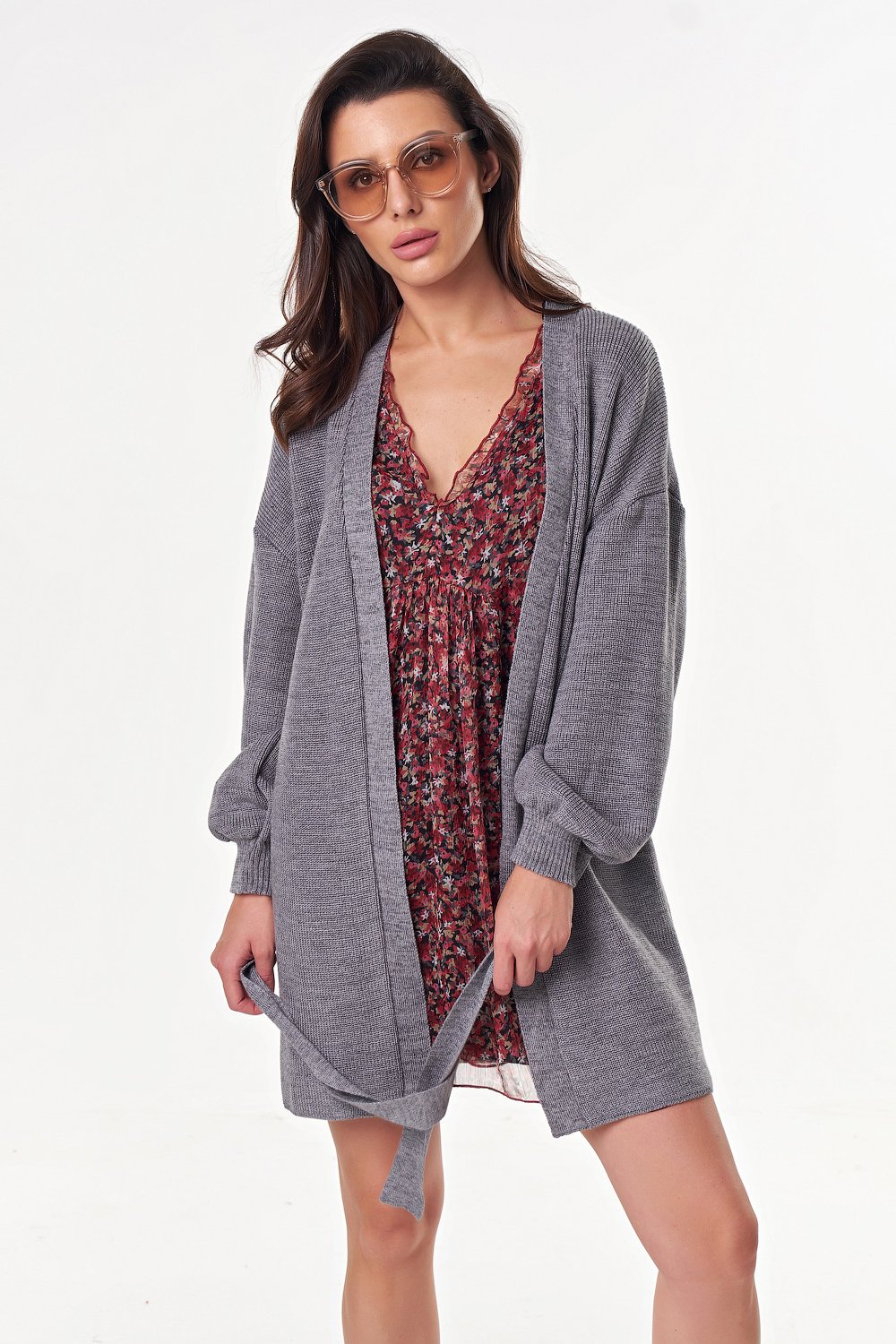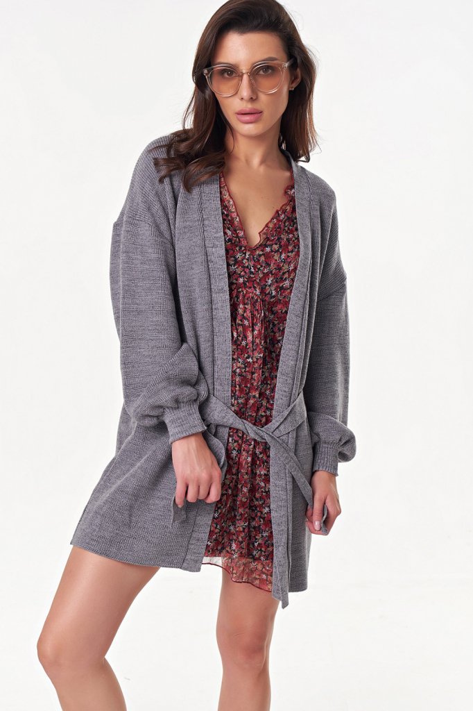 Особенности: Объемный, вязаный кардиган прямого силуэта выполнен фактурной вязкой из полушерстяной пряжи. Детали: горловина и края борта обработаны планкой, длинный рукав с напуском, пояс в комплекте.