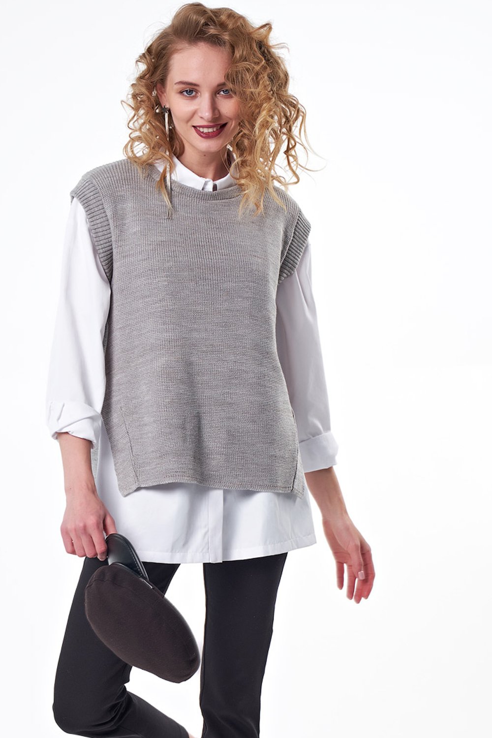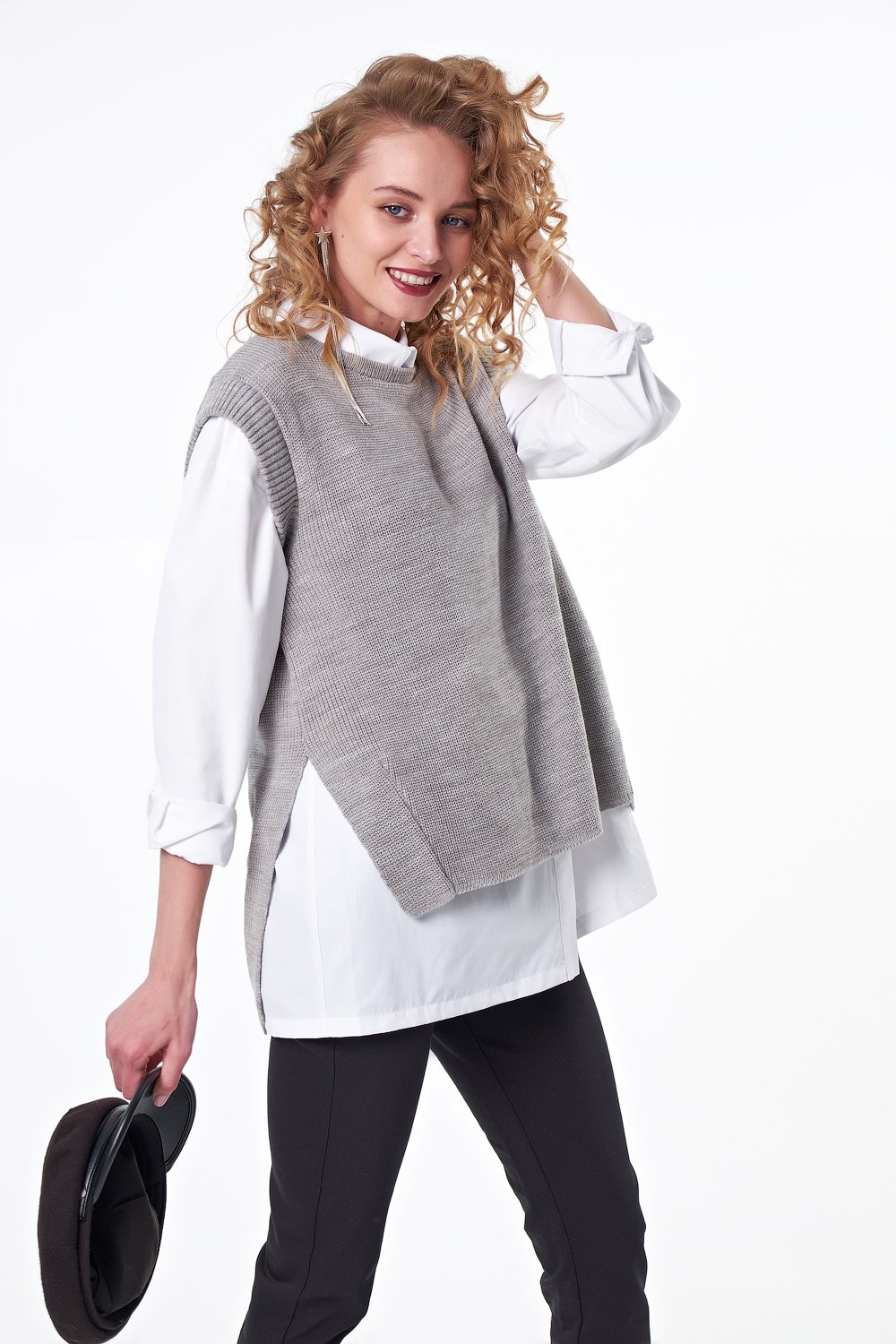 Особенности: Вязаный жилет свободного силуэта из фактурной вязки с разрезами по бокам и ассиметричным низом.