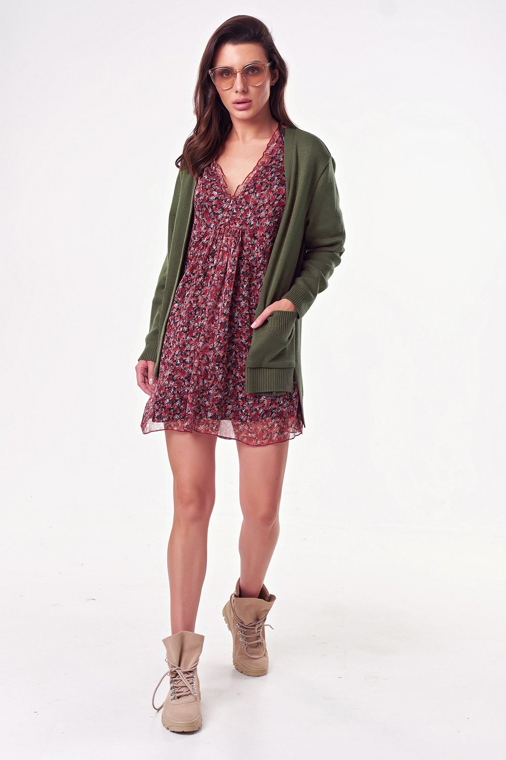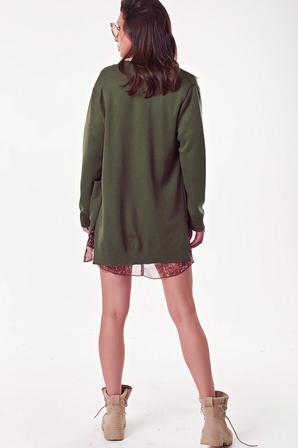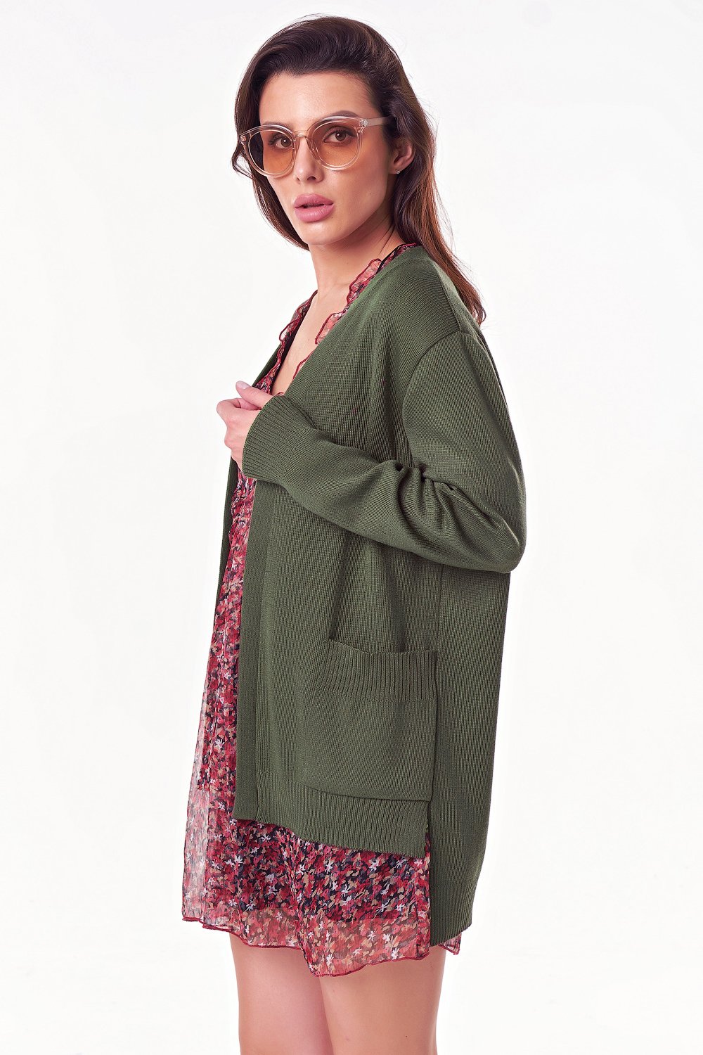 Особенности: Вязаный кардиган прямого силуэта выполнен из полушерстяной пряжи с ассиметричным низом. Кардиган оформлен обтачкой по переду. Широкие рукава оформлены резинкой.