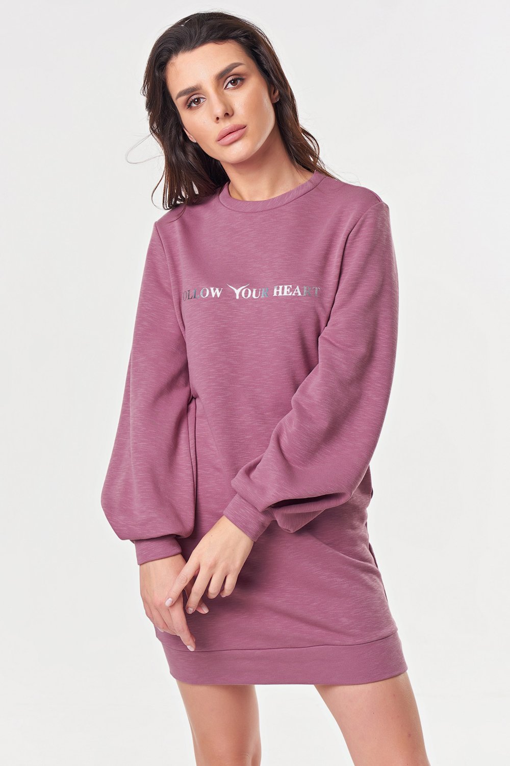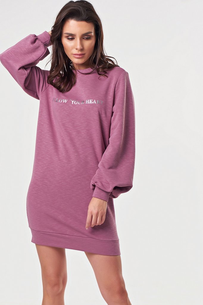 • Особенности: Платье из меланжевого трикотажа-футера. Детали: горловина округлой формы, объемный рукав со складками по низу, манжеты по низу рукавов и платья. По переду нанесен принт серебристой фольгой.