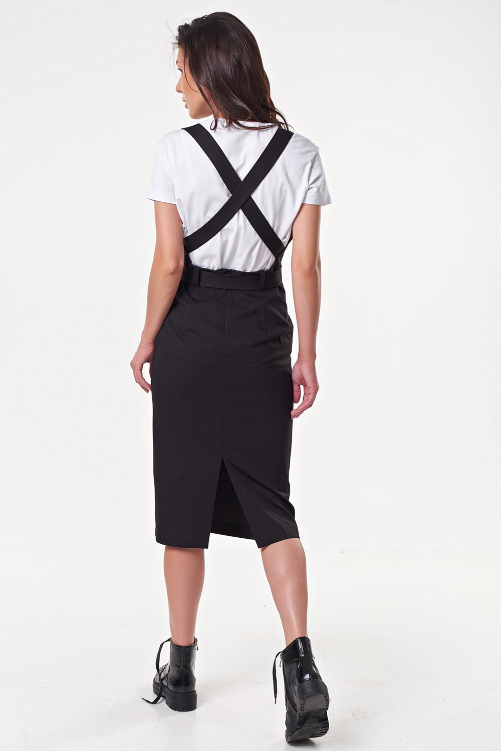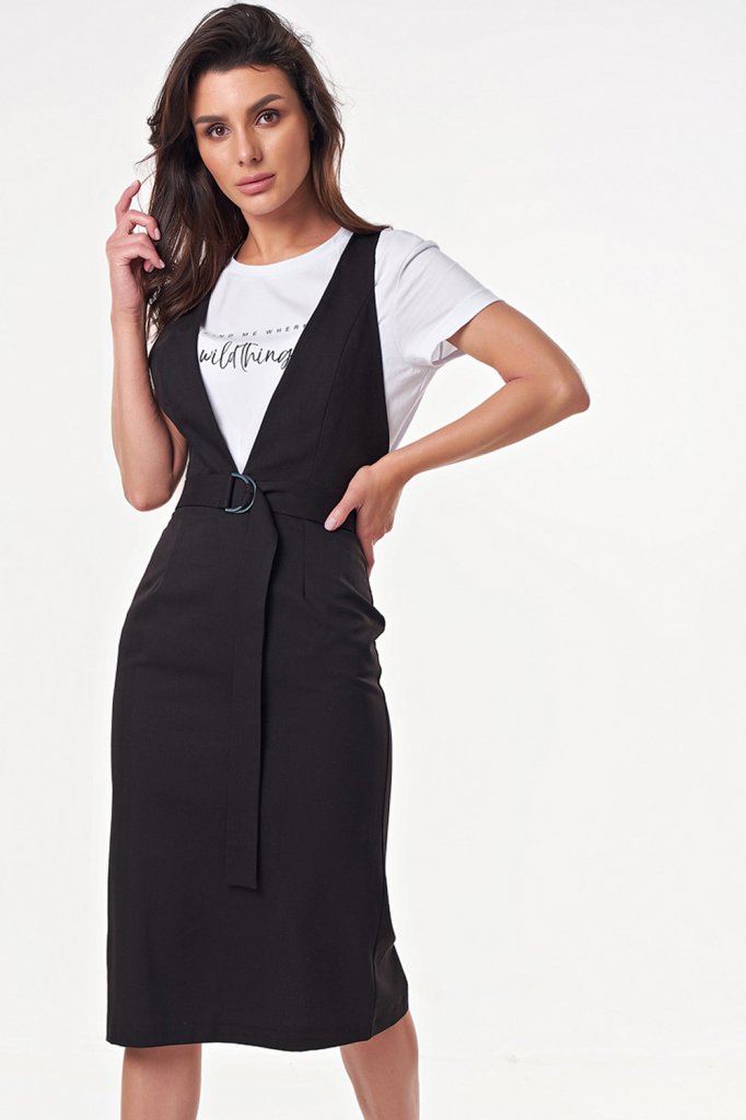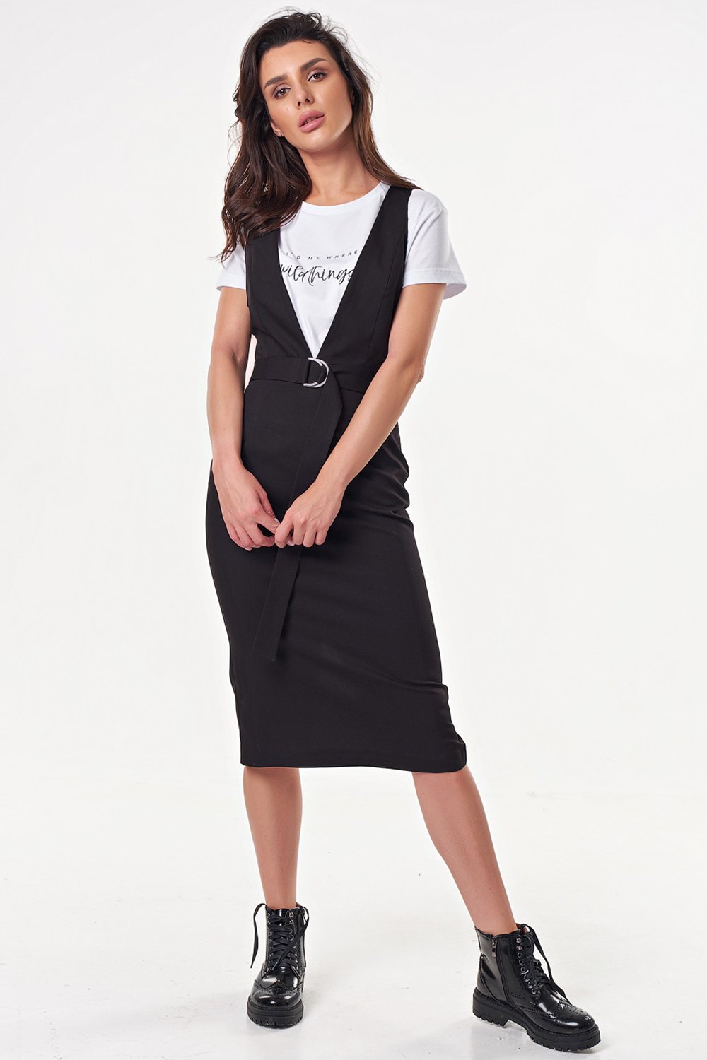 • Особенности: Сарафан прилегащего силуэта. Детали: V-образный вырез, рельефы, перекрестные бретели, съемный пояс с металлической пряжкой.