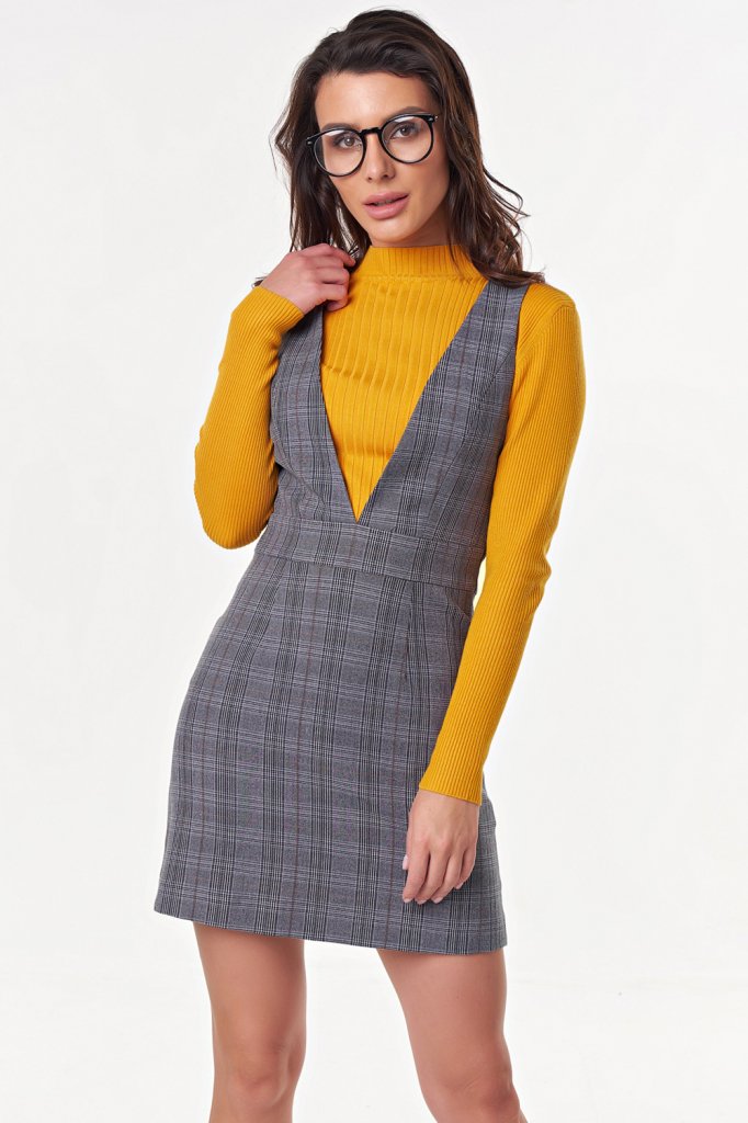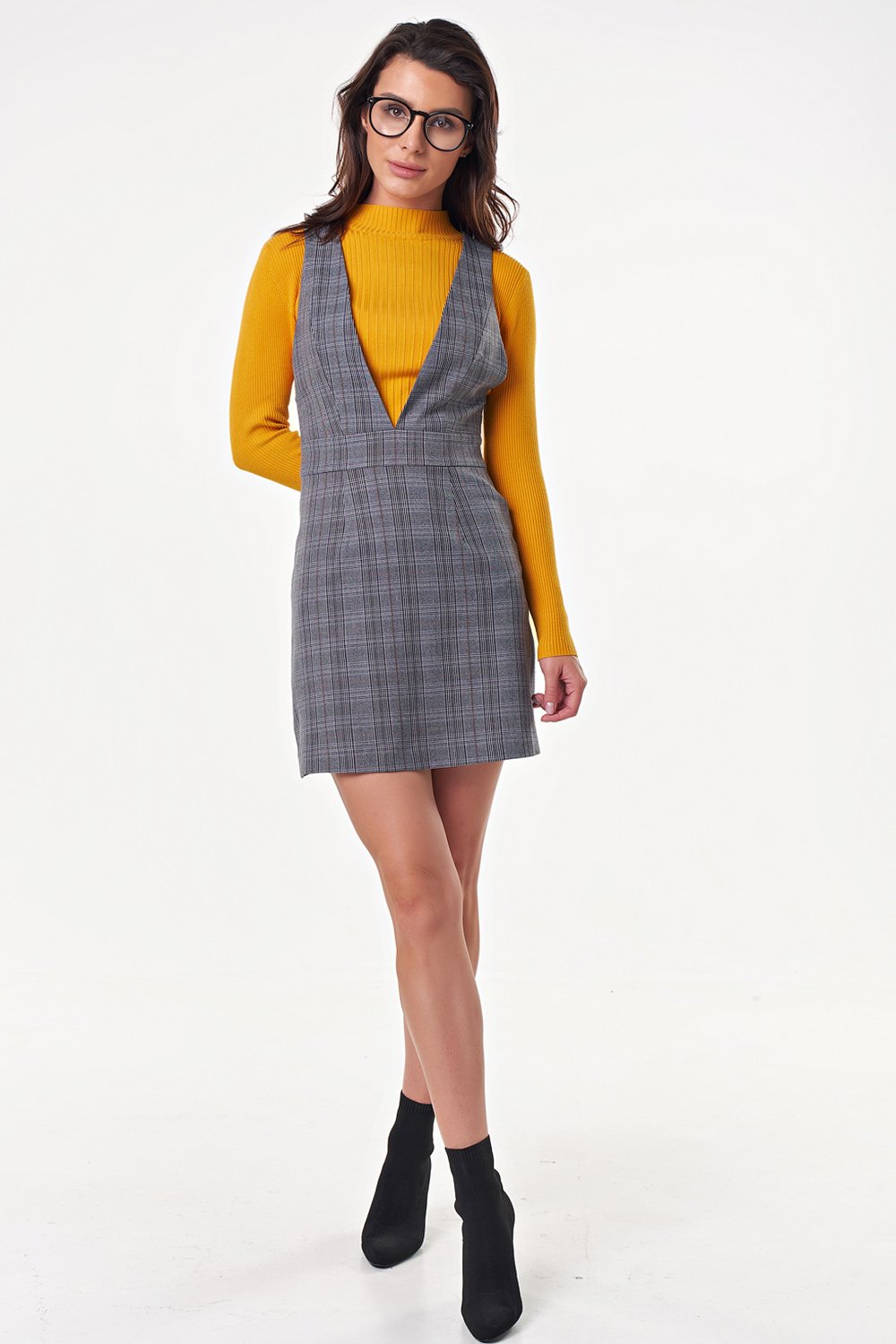 • Особенности: Сарафан прилегающего силуэта из костюмной ткани в клетку. Детали: V-образный вырез горловины, рельефные швы, притачной пояс, застежка на потайную молнию.
