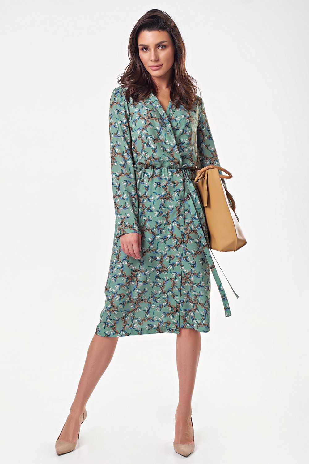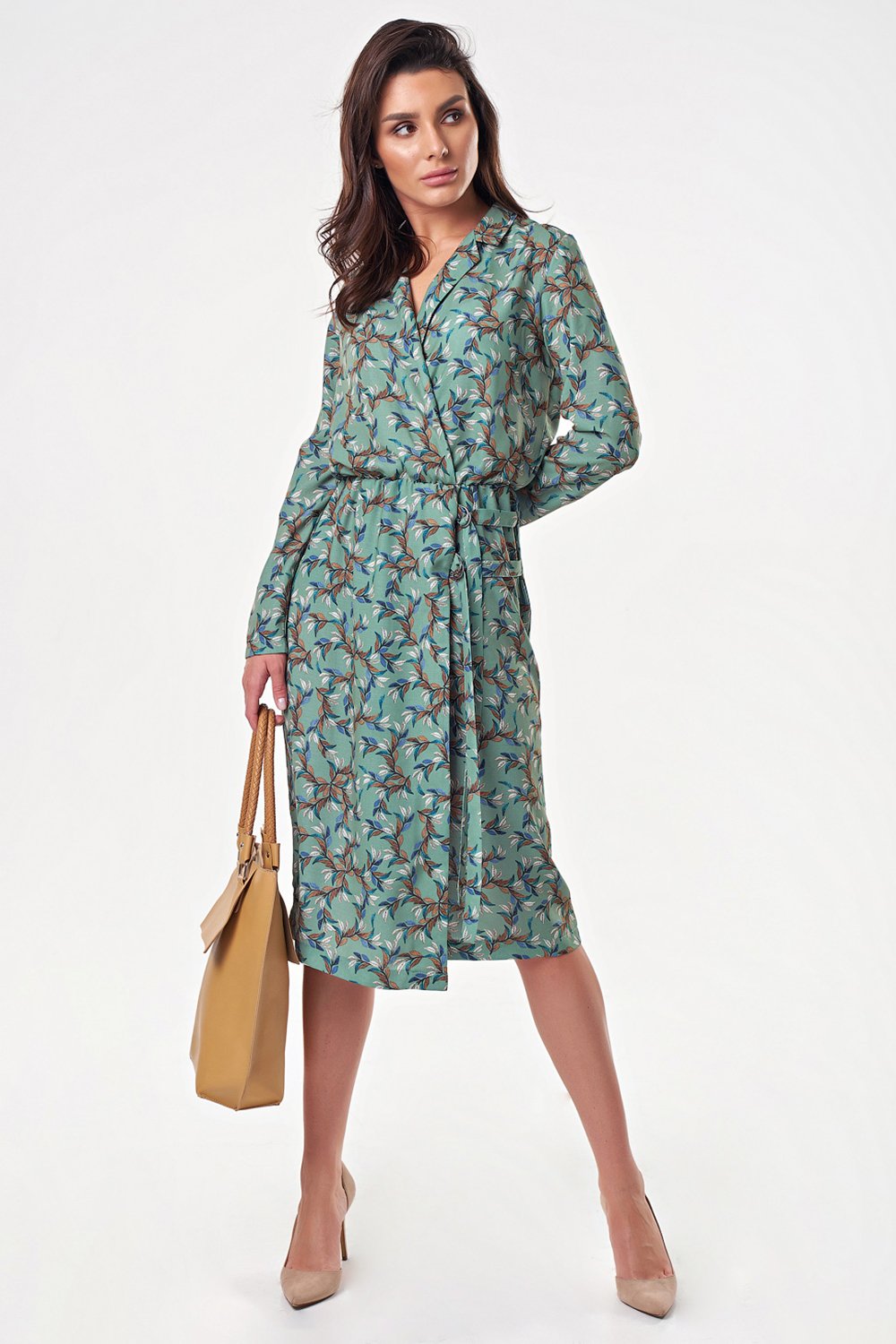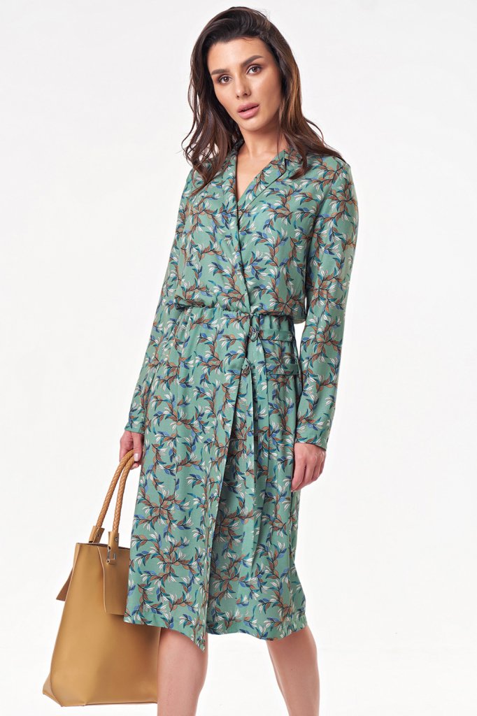 • Особенности: Платье из струящейся принтованной ткани. Детали: отложной воротник, запах, сборка на резинку по талии, два пояска с металлическими пряжками. Рукав втачной, длинный.