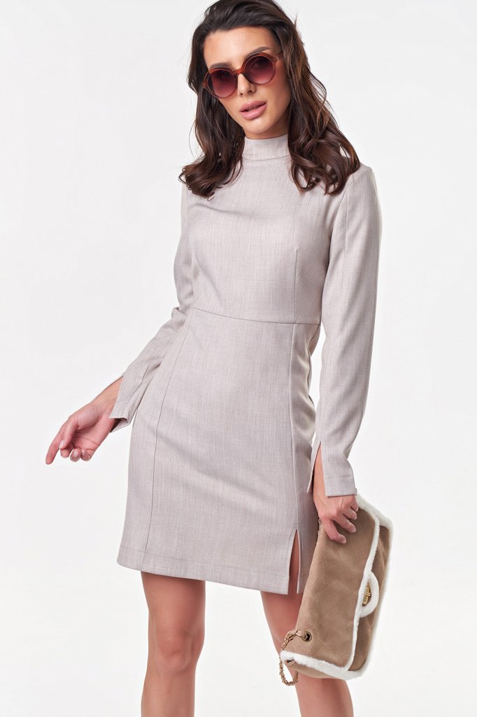 • Особенности: Платье прилегающего силуэта из фактурной костюмной ткани. Детали: воротник стойка, длинный втачной рукав с разрезом по низу, вытачки, отрезное по талии, разрез на юбке.