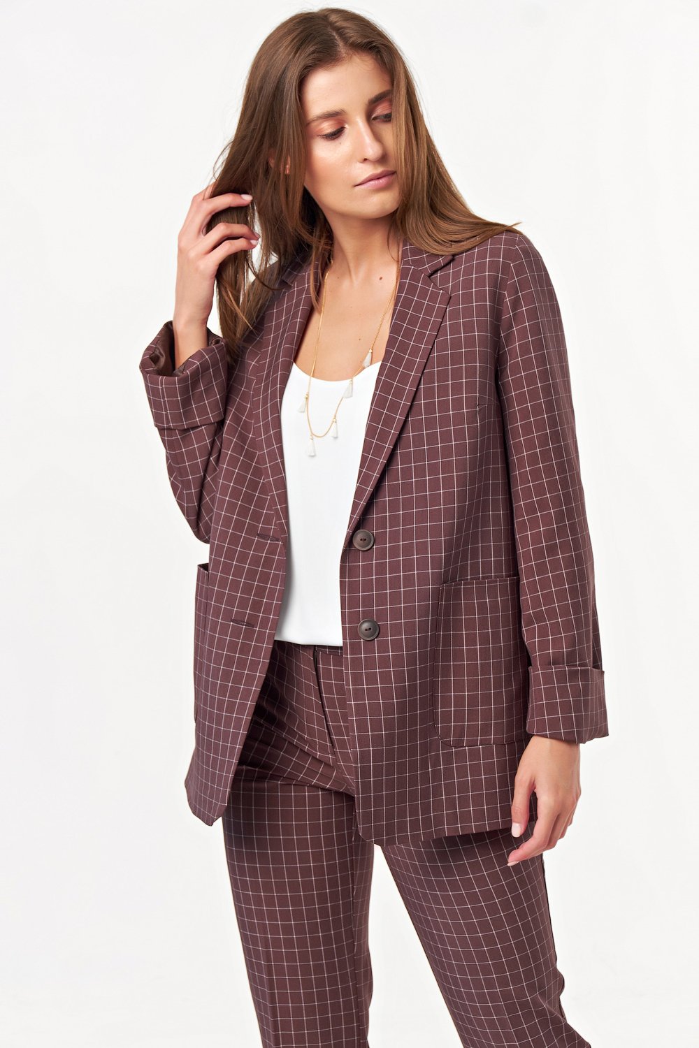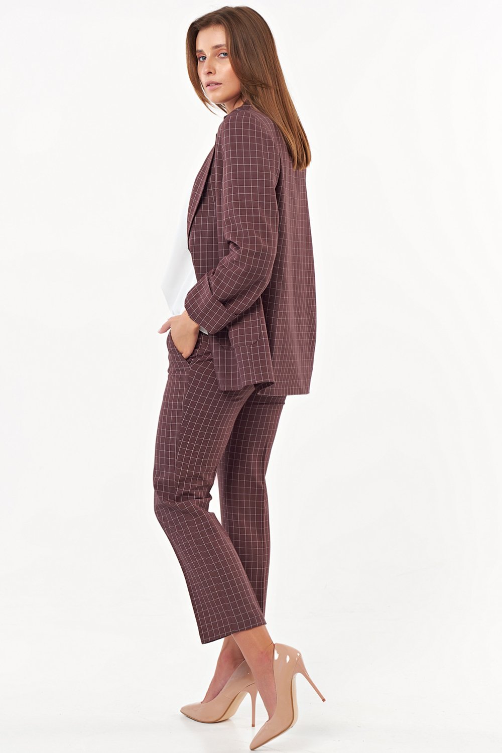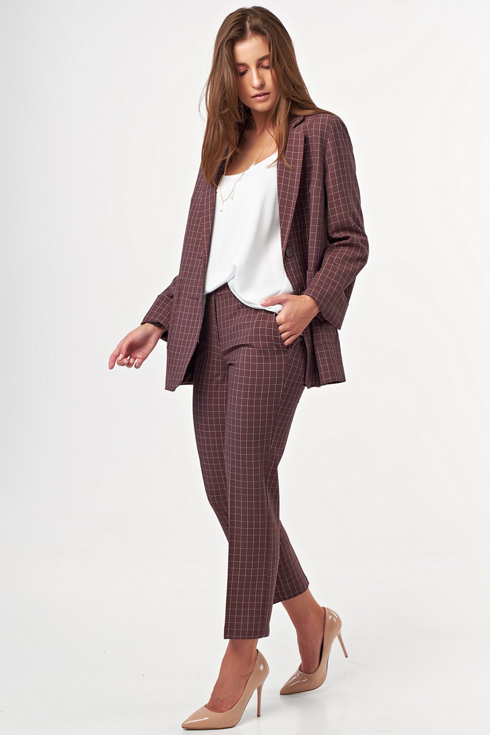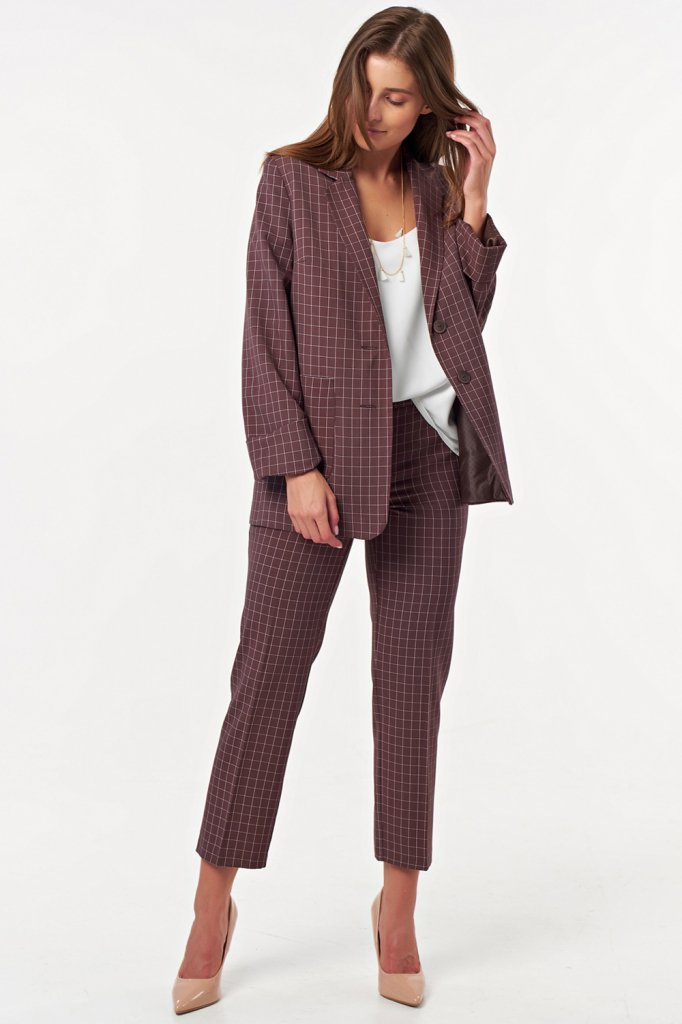 • Особенности: Костюм из ткани в клетку, состоит из жакета и брюк. Жакет: прямой силуэт, отложной воротник, втачной рукав с широким отворотом, накладные карманы, застежка на петли и пуговицы, подкладка. Брюки: прямой силуэт, брючные карманы, притачной пояс, застежка на молнию, заутюженные стрелки.