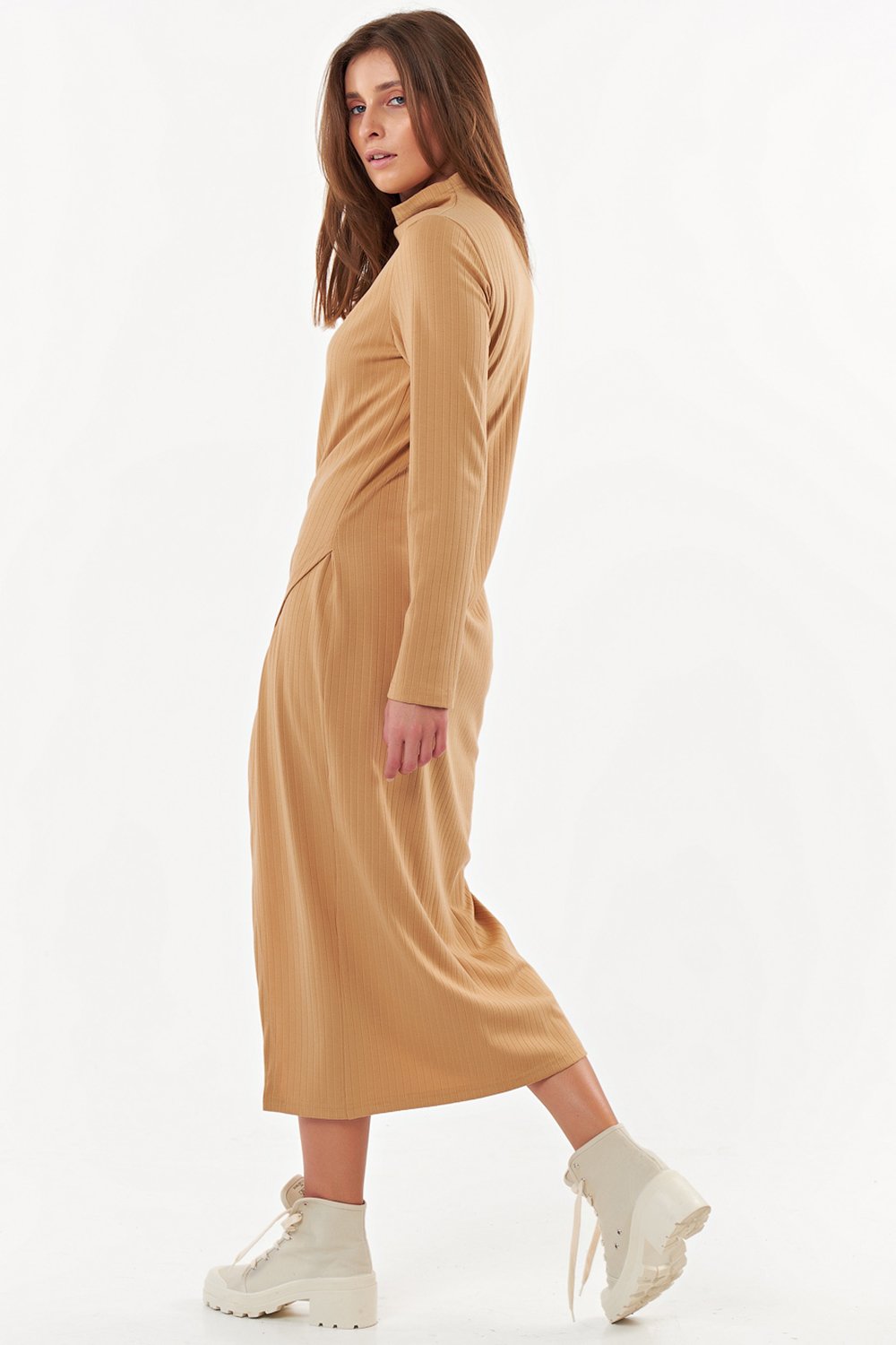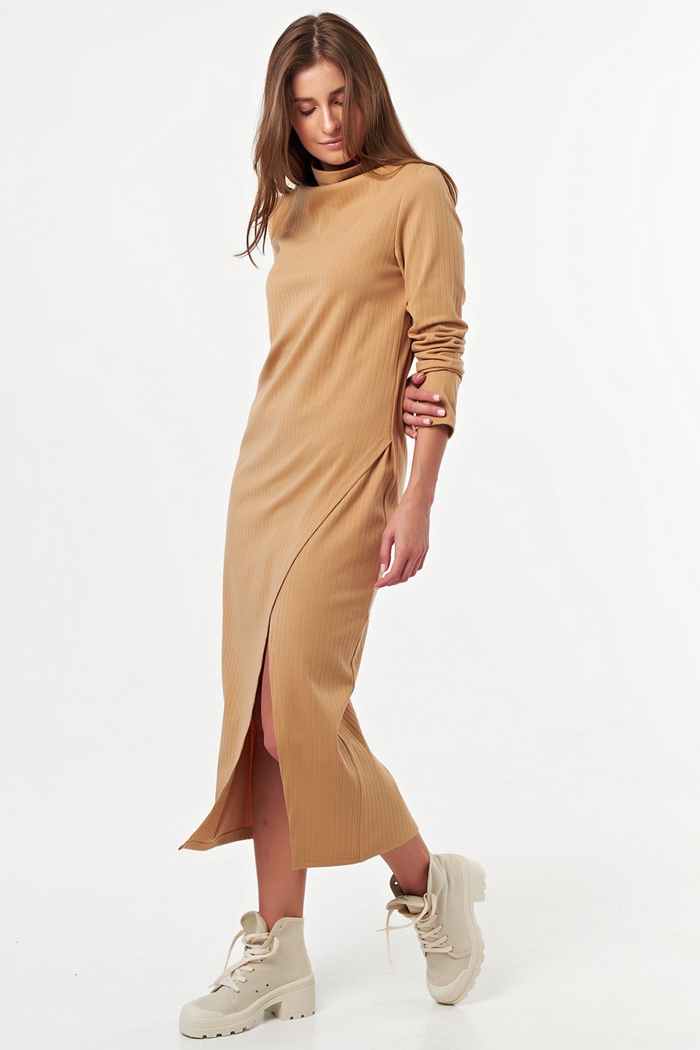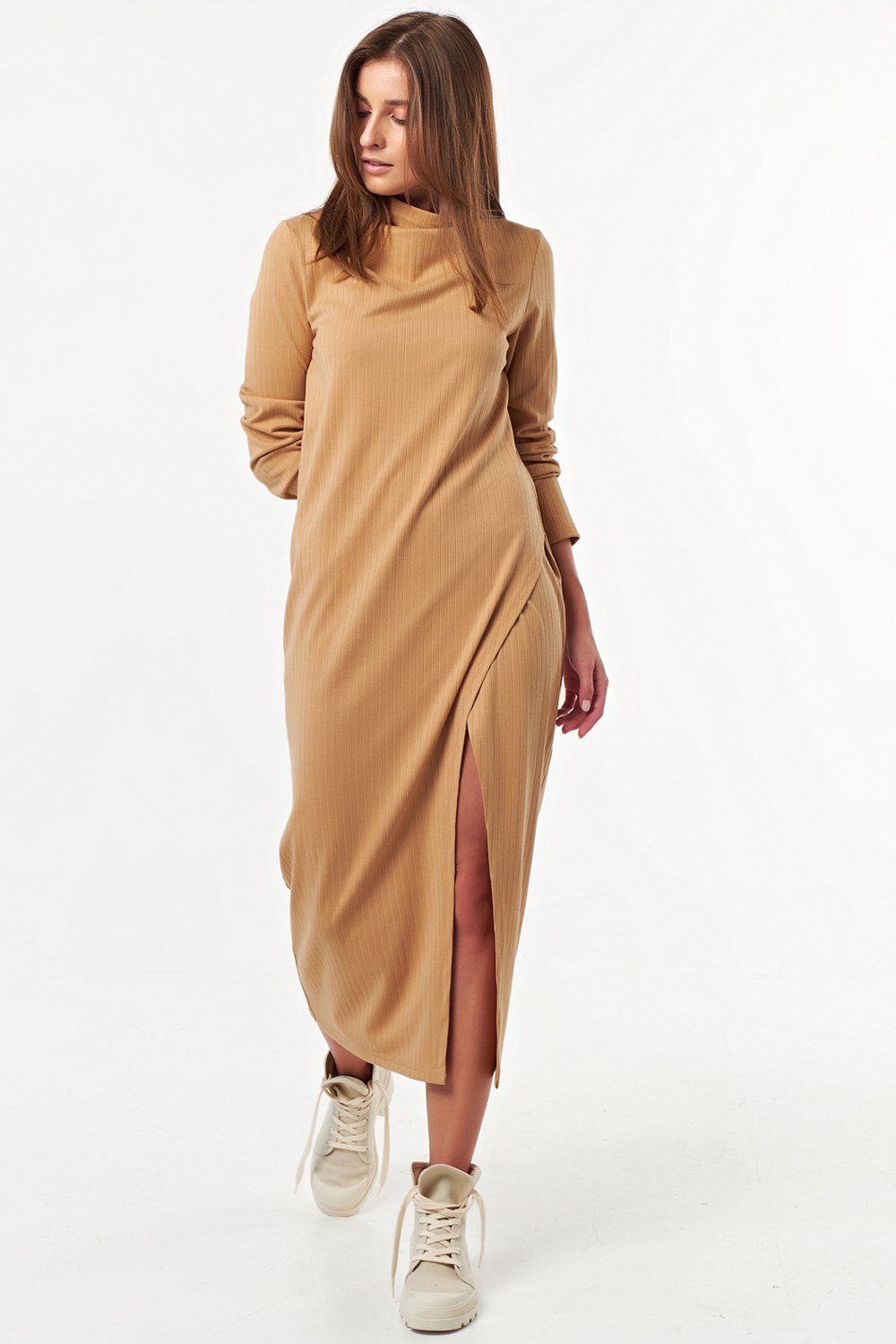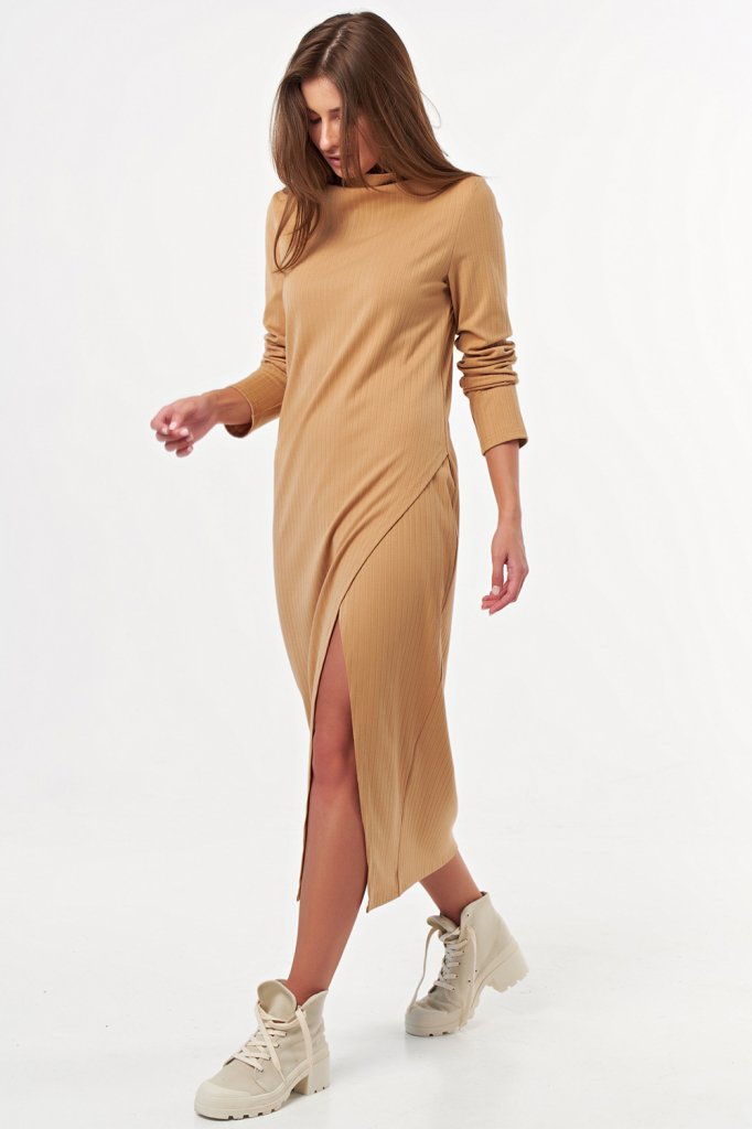 • Особенности: Платье прямого силуэта из трикотажа "лапша". Детали: цельнокронный воротник-стойка, длинный втачной рукав, запах по переду. Без застежки.