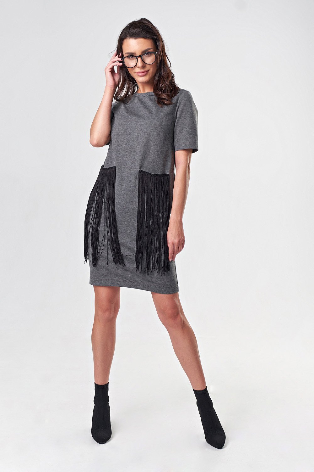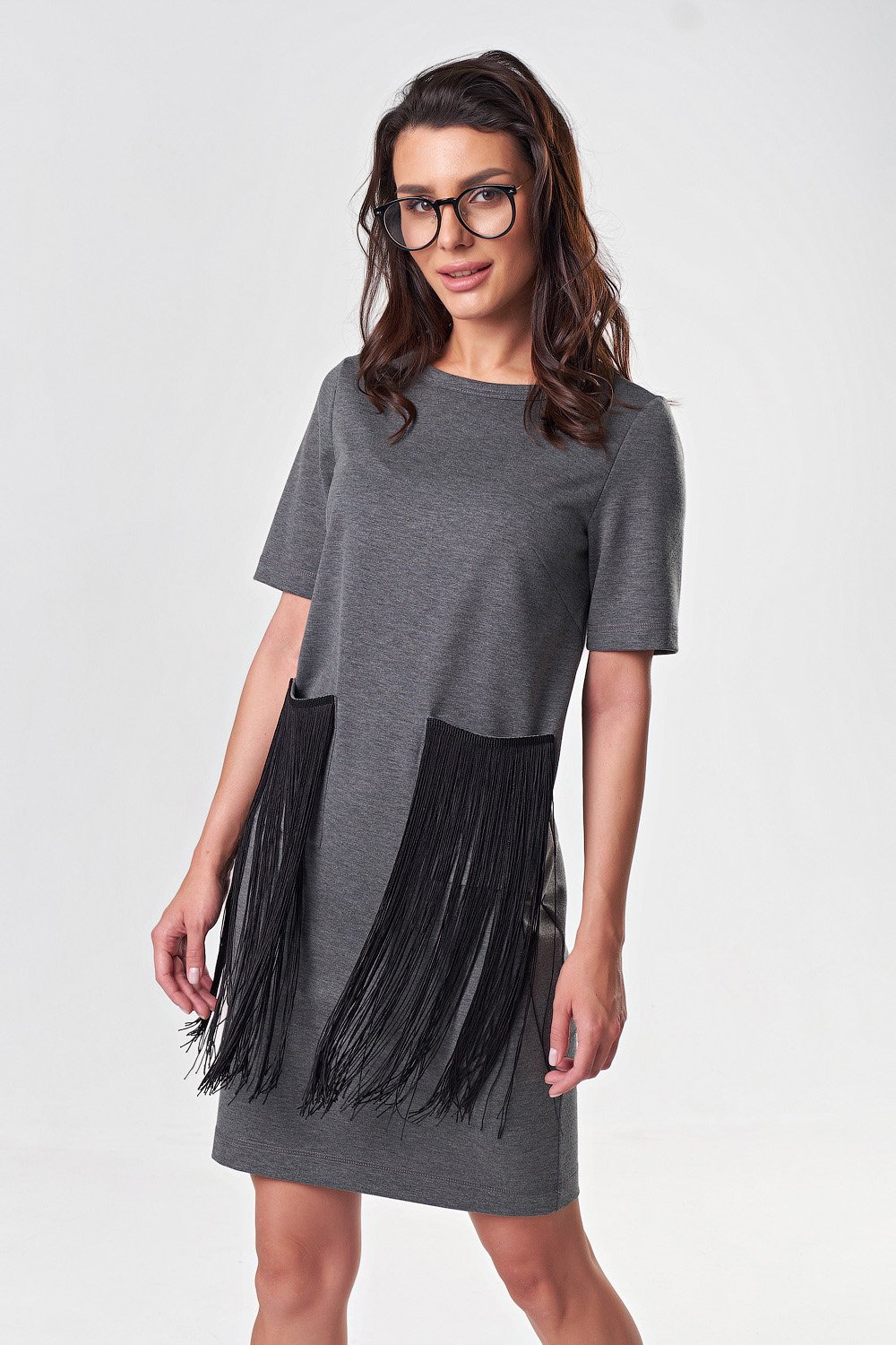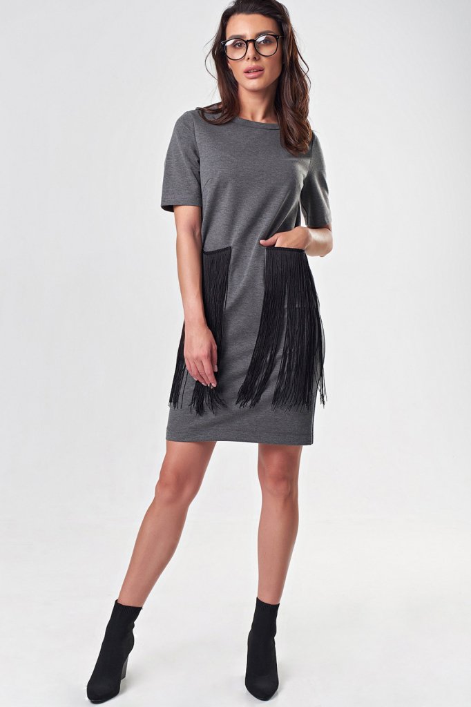 • Особенности: Платье из плотного трикотажа с декоративной бахромой. Детали: горловина округлой формы, обработана окантовкой, втачной короткий рукав, накладные карманы (по верхнему краю настрочена тесьма с бахромой).