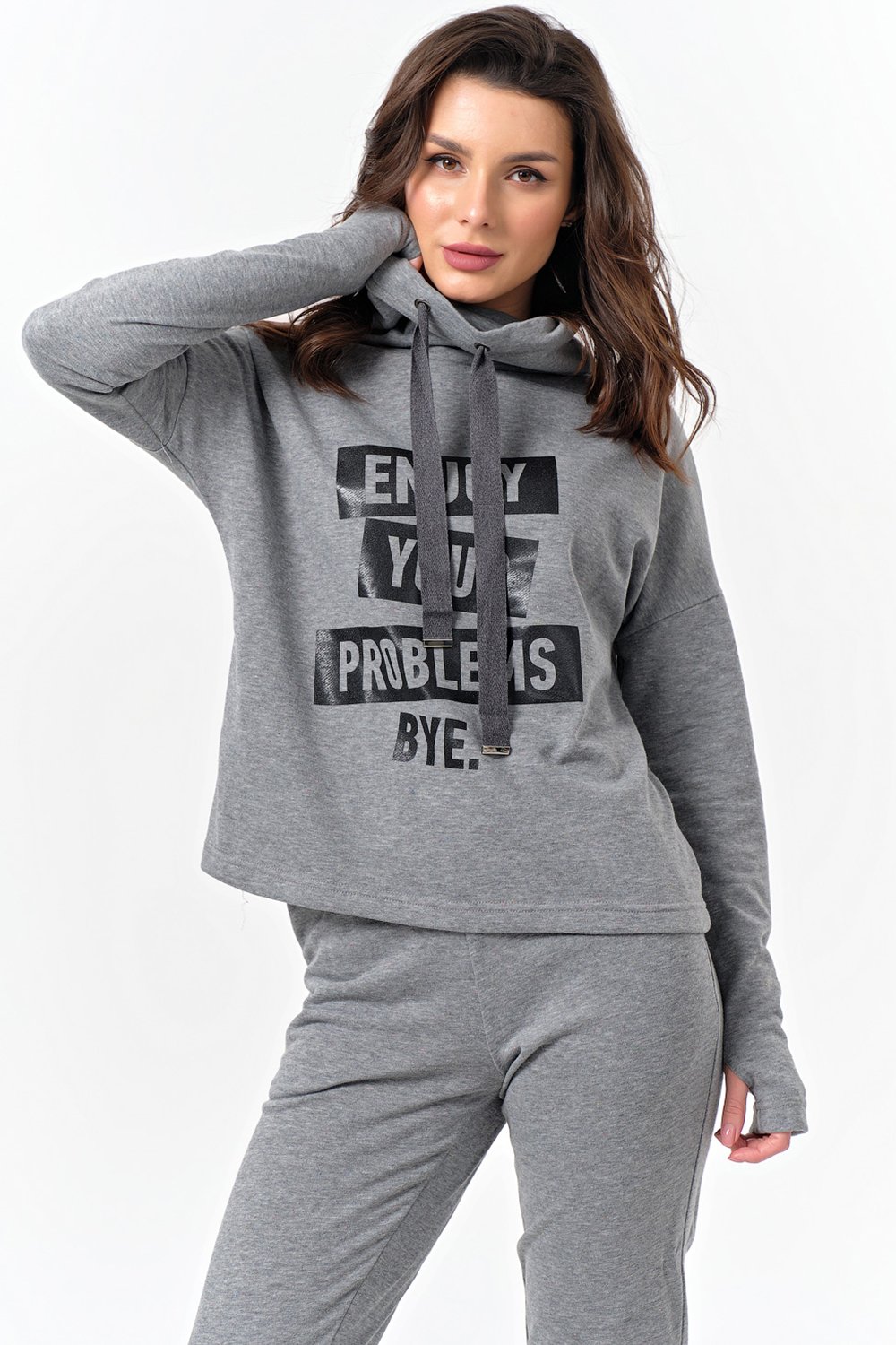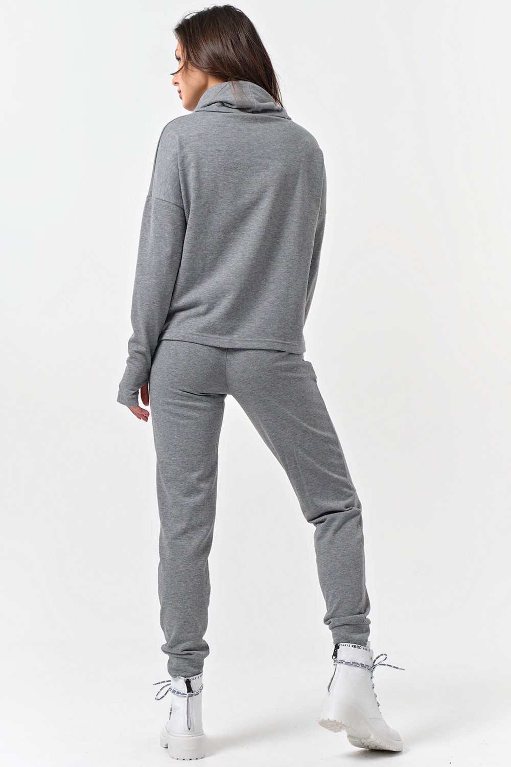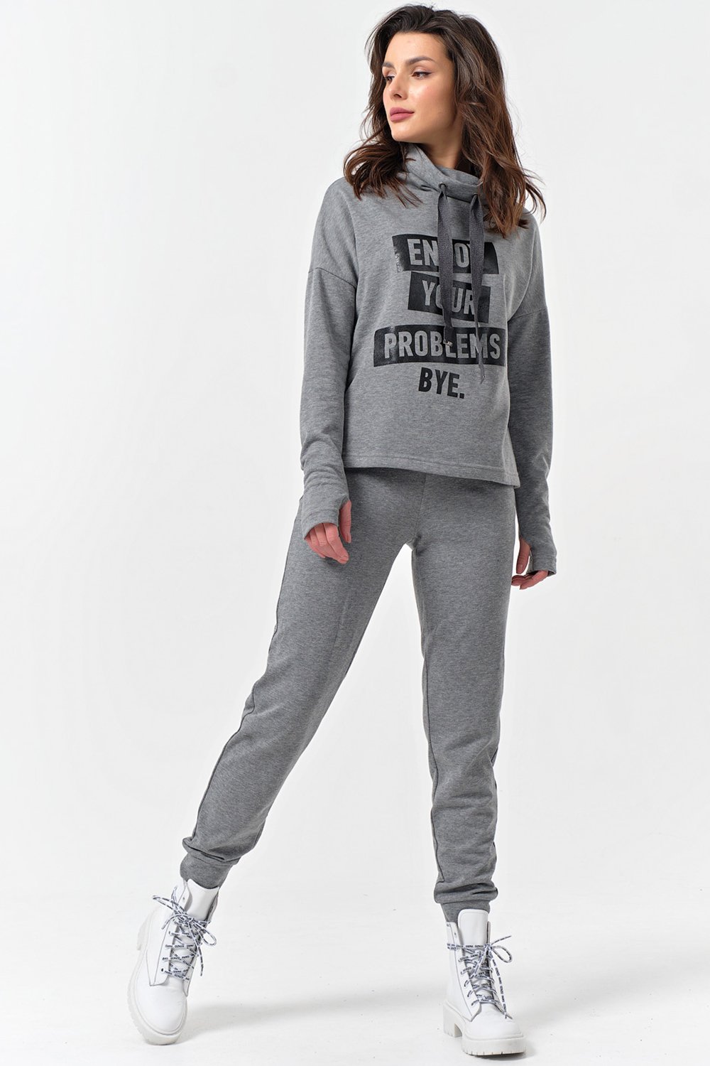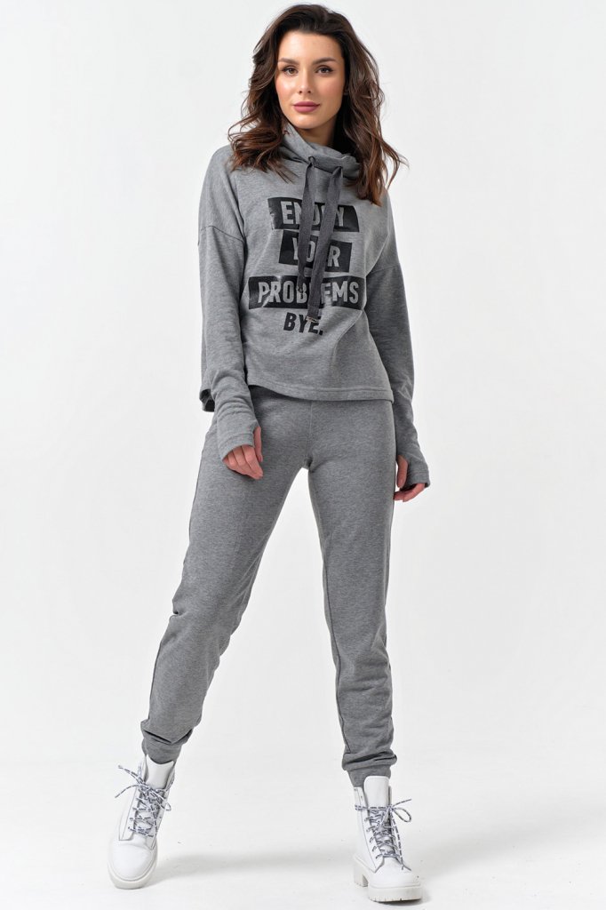 • Особенности: Костюм из футера состоящий из свитшота и брюк. Детали: Свитшот прямого силуэта с высоким воротником-стойкой, линия плеча спущенная, рукав длинный с отверстием под палец, по переду выполнен принт. Брюки с боковыми карманами, с манжетами по низу.