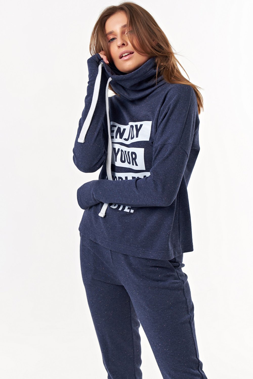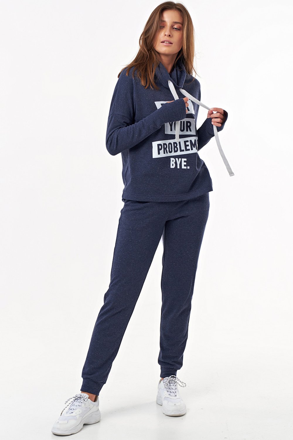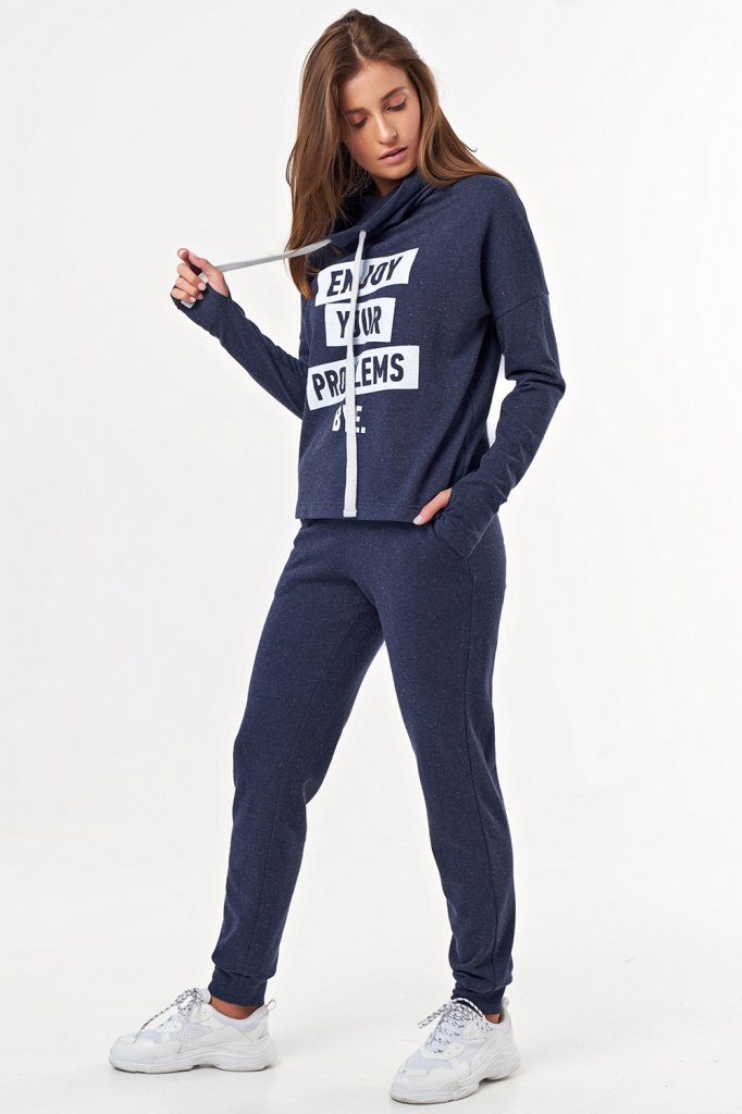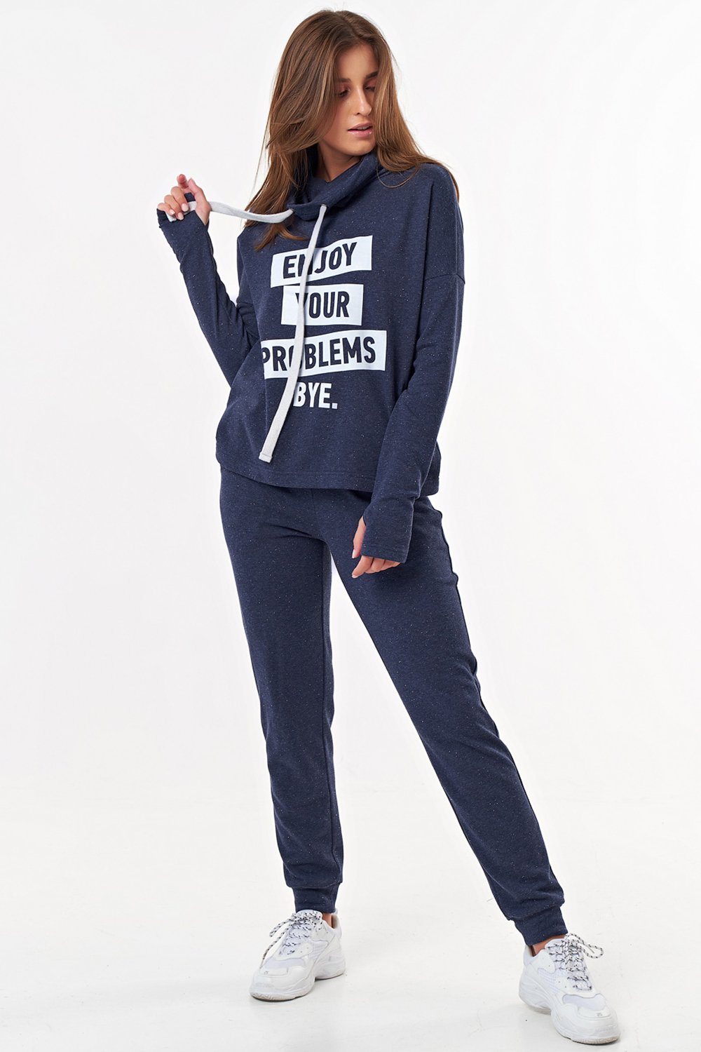 • Особенности: Костюм из футера состоящий из свитшота и брюк. Детали: Свитшот прямого силуэта с высоким воротником-стойкой, линия плеча спущенная, рукав длинный с отверстием под палец, по переду выполнен принт. Брюки с боковыми карманами, с манжетами по низу.