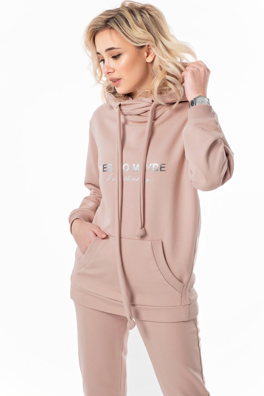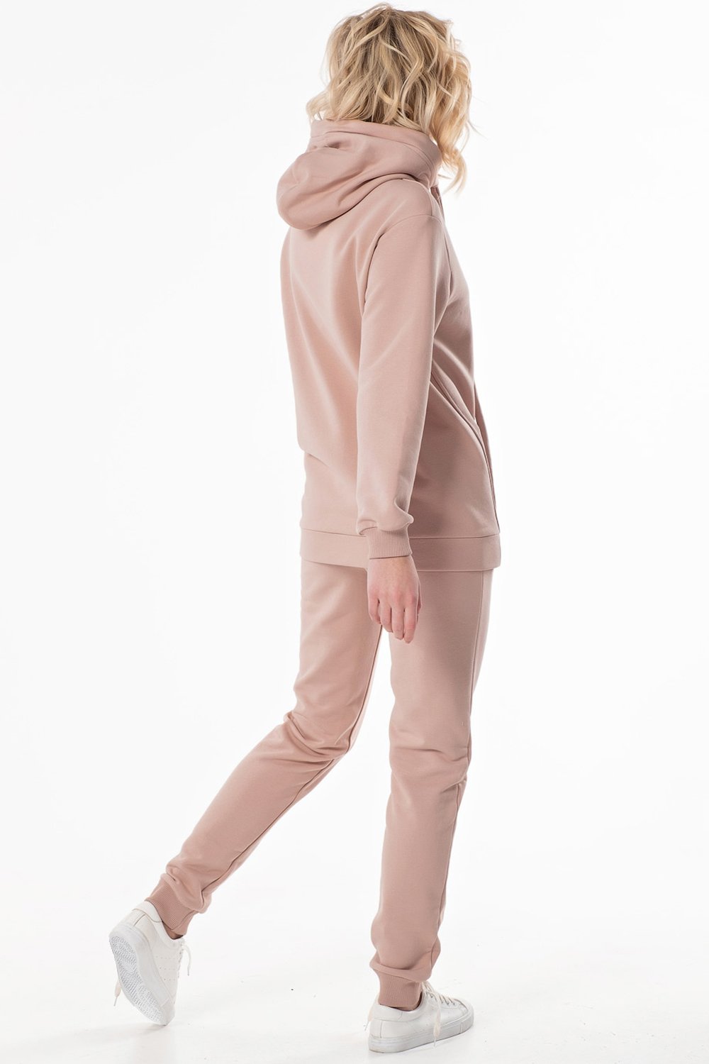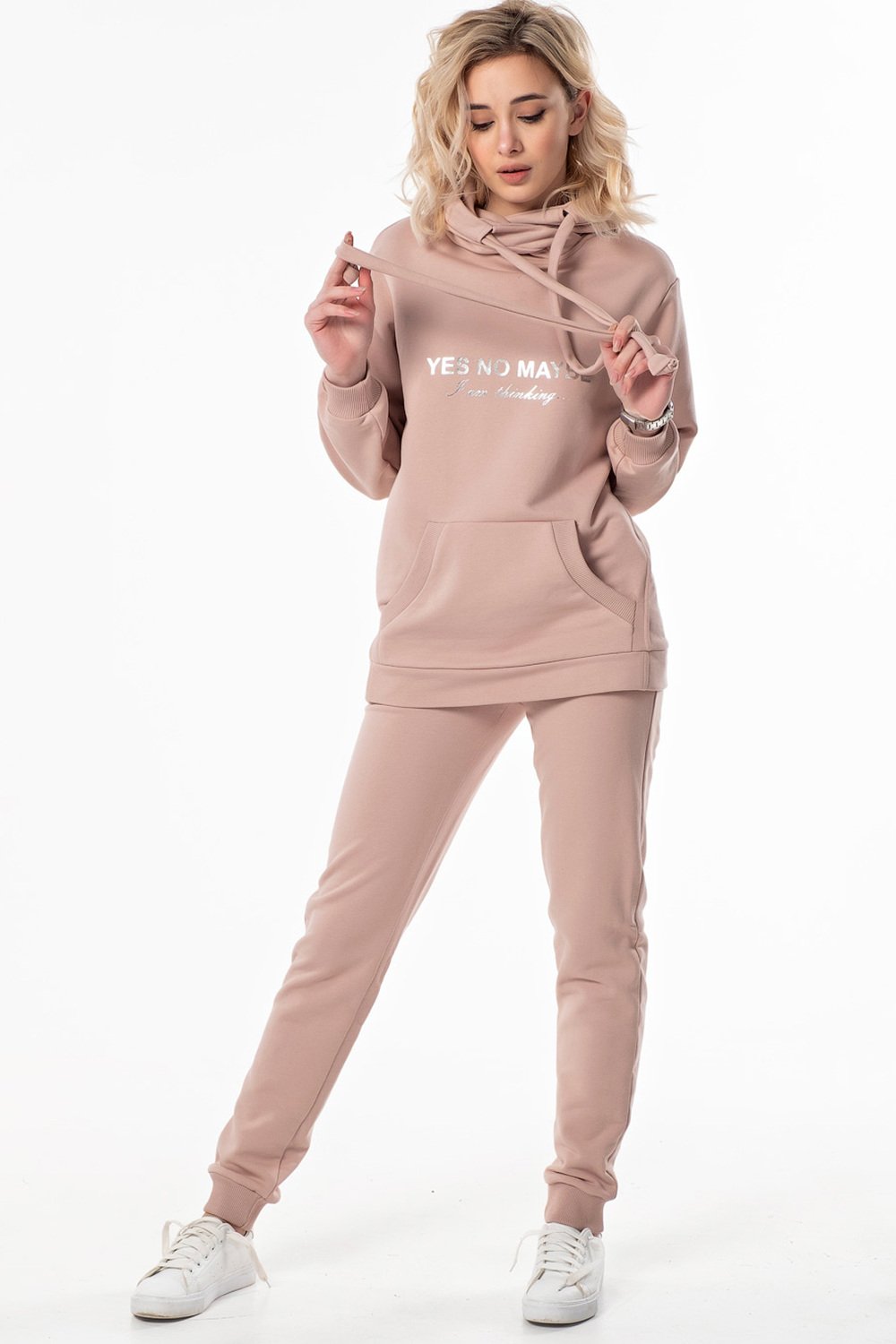 • Особенности: Костюм из футера состоит из свитшота и брюк. Детали свитшота: прямой силуэт, спущенная линия плеча, длинный рукав на манжете, капюшон с продетым толстым шнуром, принт из металлизированной фольги, накладной карман. Детали брюк: полуприлегающий силуэт, притачной пояс, брючные карманы, манжеты по низу брюк.